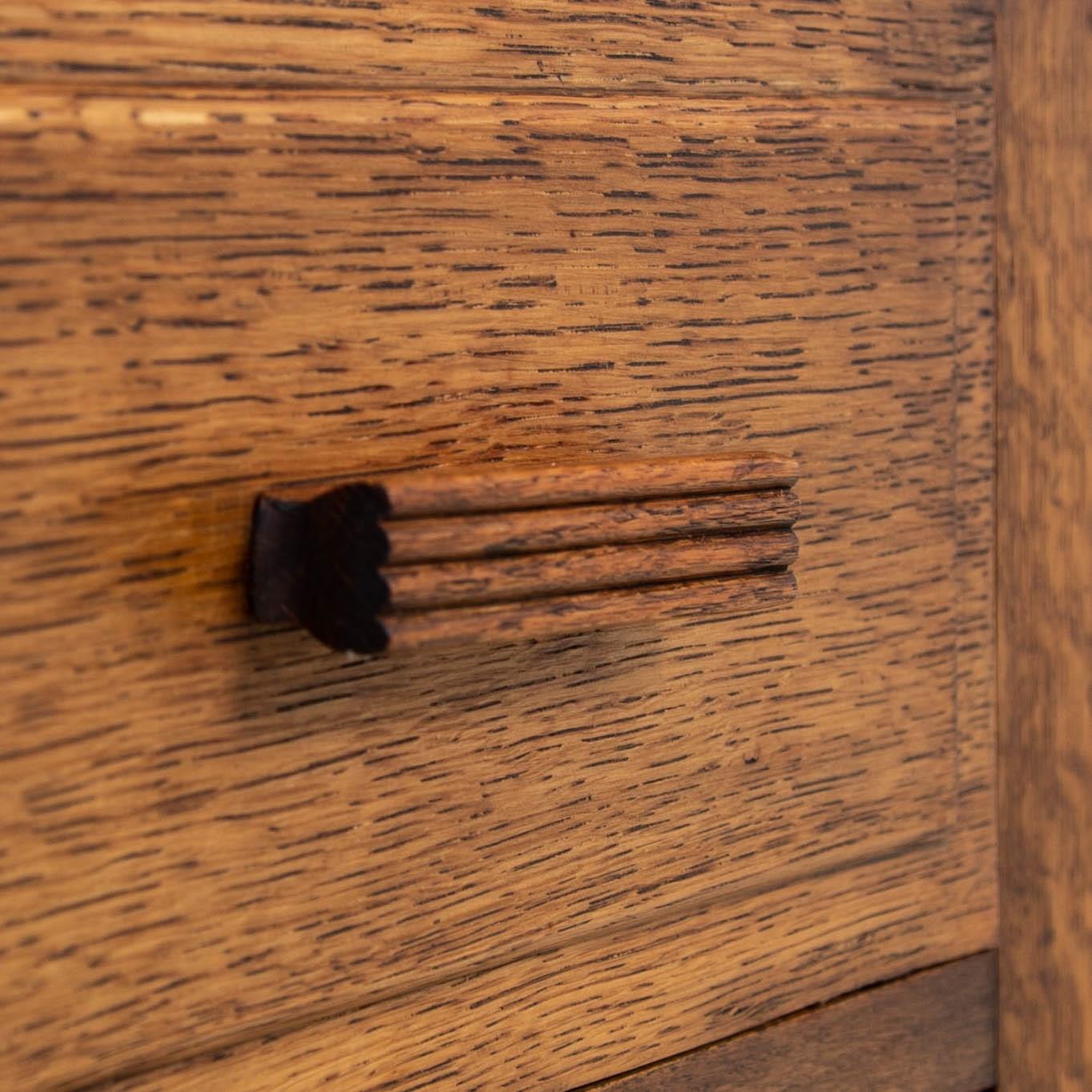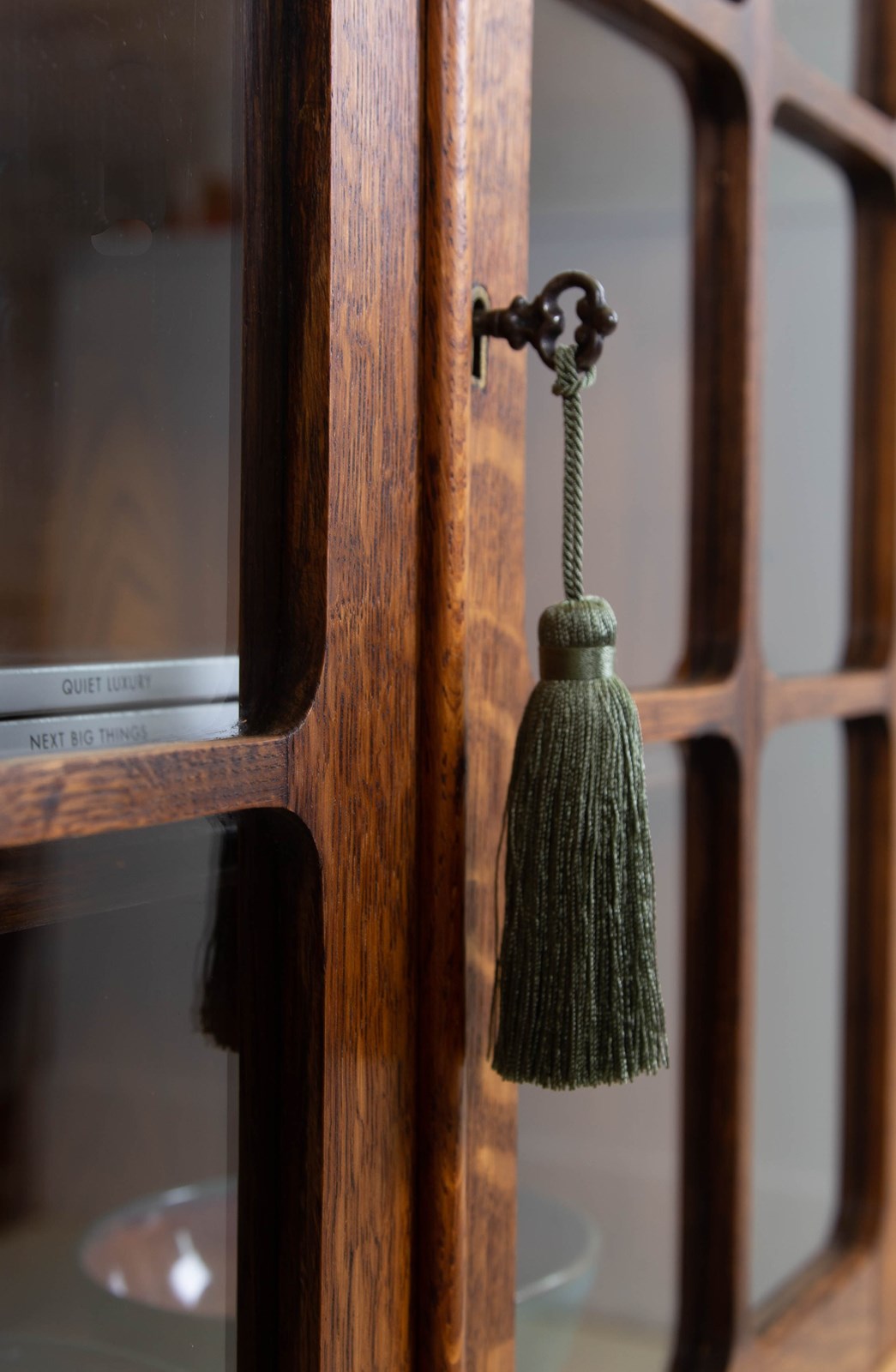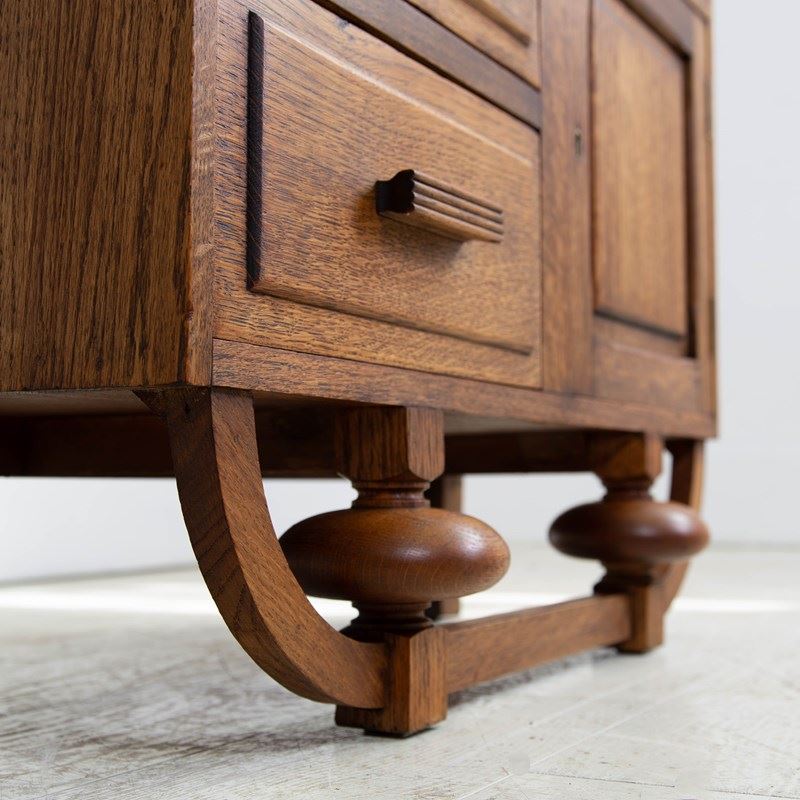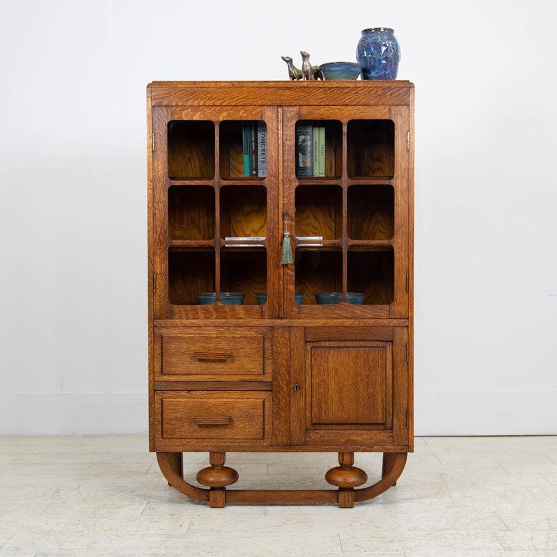 We would assume a commission piece with skilful craft and great design. We have a lot to admire about this piece; the glazed doors with those slightly softened curved corner frames, the little oak reeded handles to the two lower drawers, the oak bentwood base with the bulbous oval shaped spheres and let's face it the condition is superb with working locks and key to the 2 shelved glazed section and little cupboard.