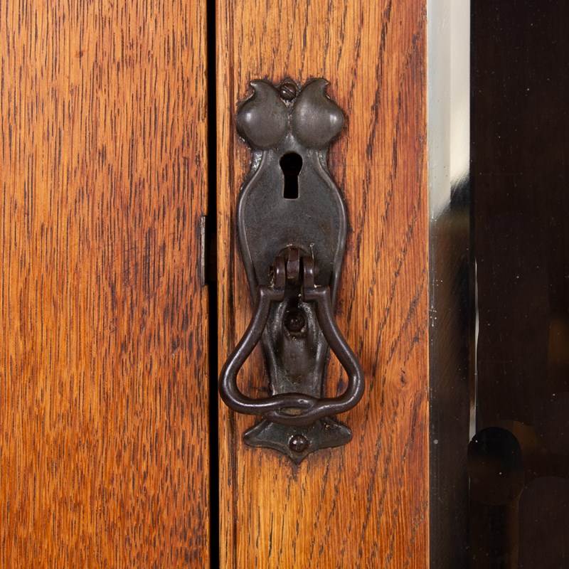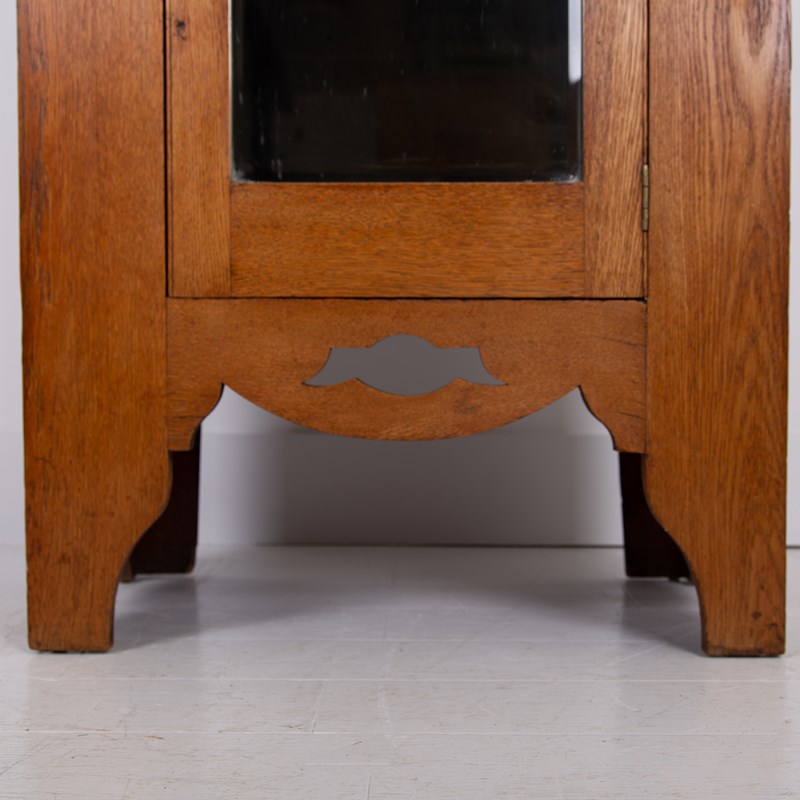 Firstly the tone and grain of oak on the piece has been well selected and crafted, always a good start. The design sees a well shaped base of unusual height giving way to a beveled mirrored door and that ornate original pressed handle which turns to open. We then turn to the perfectly shaped flat top with decorative scrolled supports at the sides and 3 little carved oak leaf motifs. Inside we have hooks for coats and the like and its last owner used it as a hall wardrobe but would be perfectly happy to sit wherever you wish…
