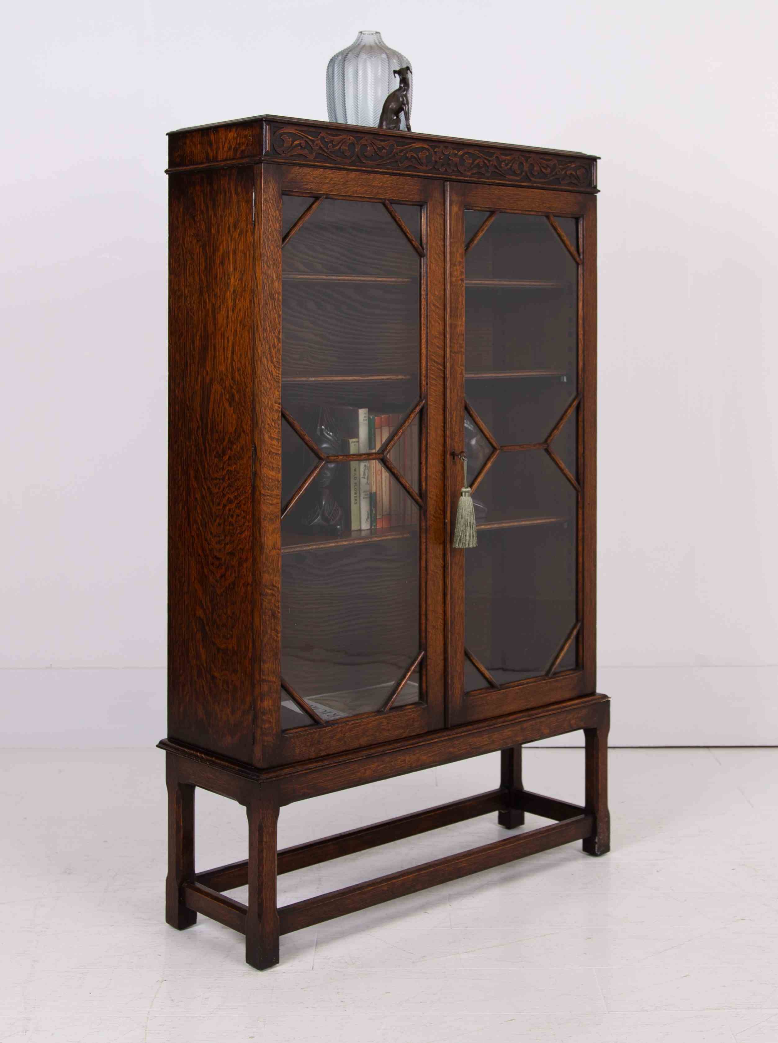 An impressive looking English oak glazed bookcase cabinet in lovely, 1 owner condition, with the benefit of a working lock and key.