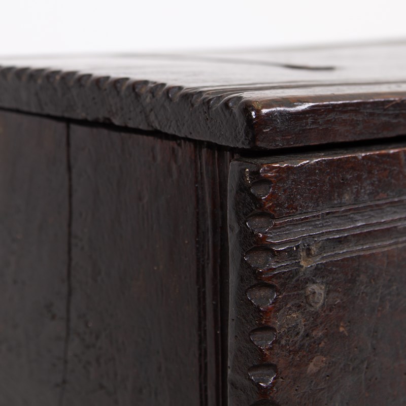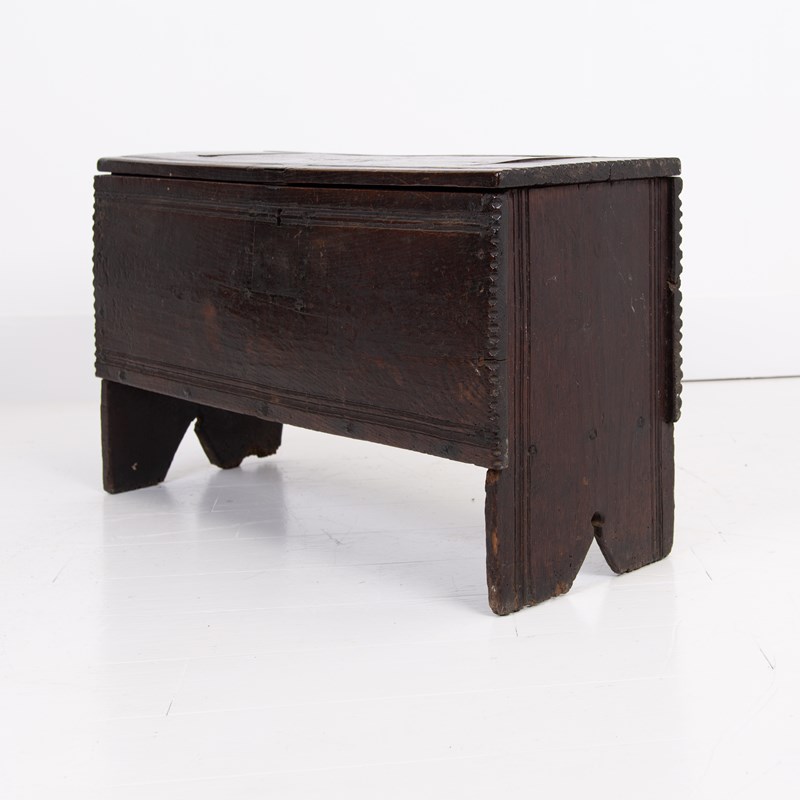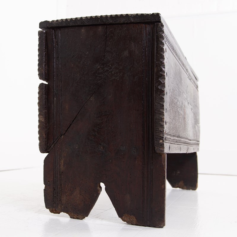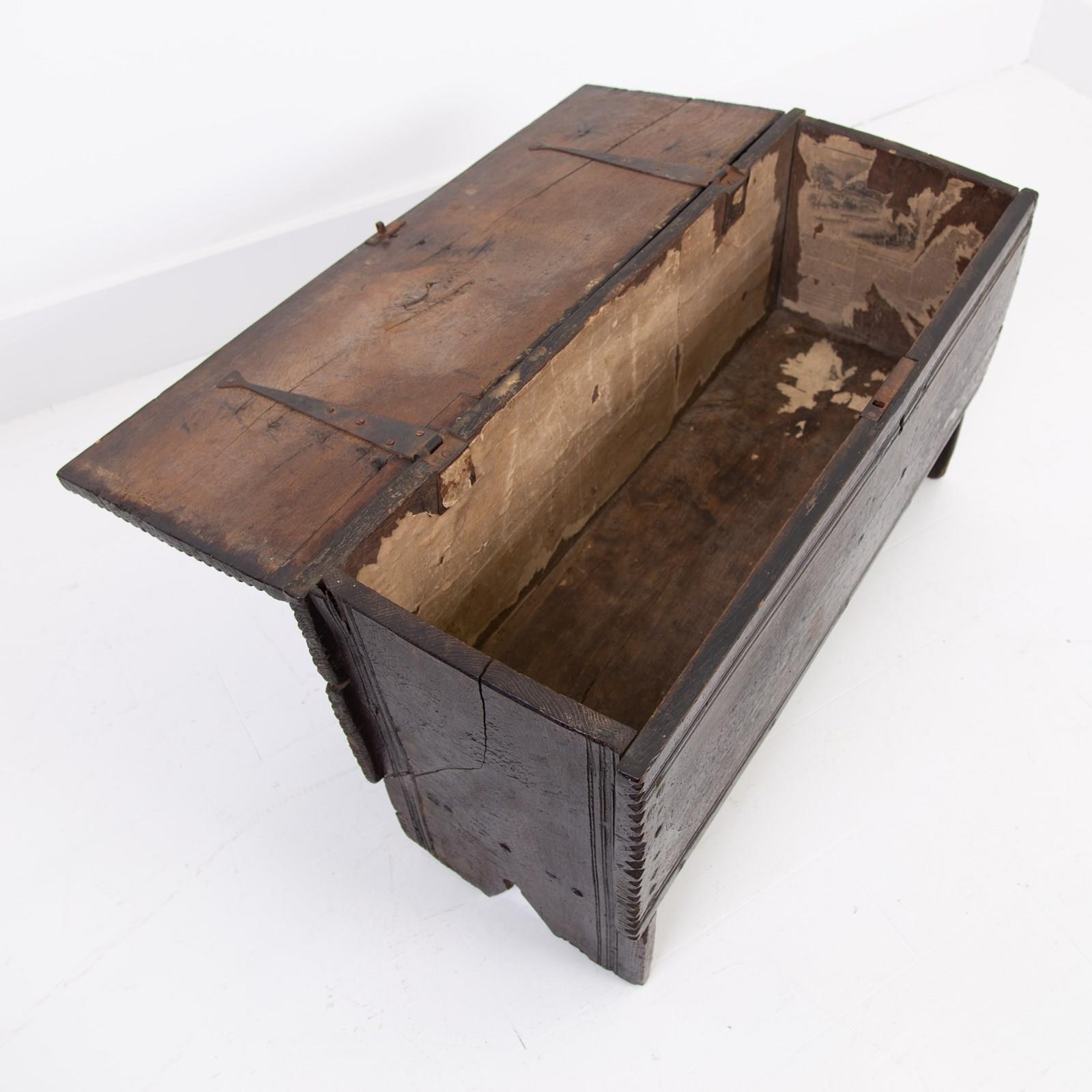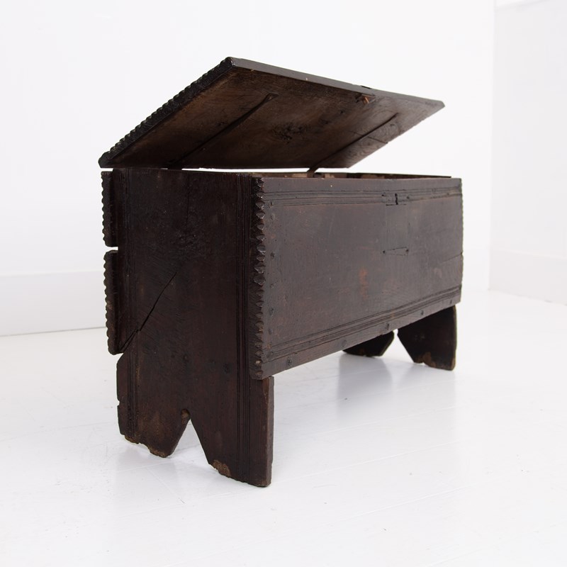 We love this one, faults and all! It is perched on super angled legs and is of plank construction, relatively humble in style with a little chip carving. Plenty of aging but perfectly “handsome”, just awaiting its new home.
