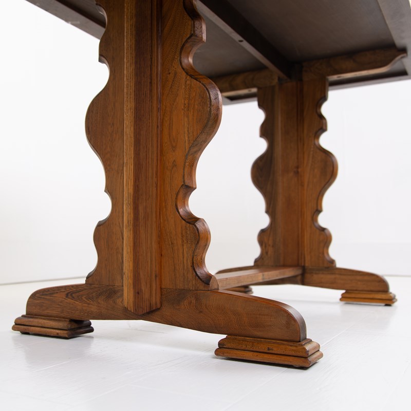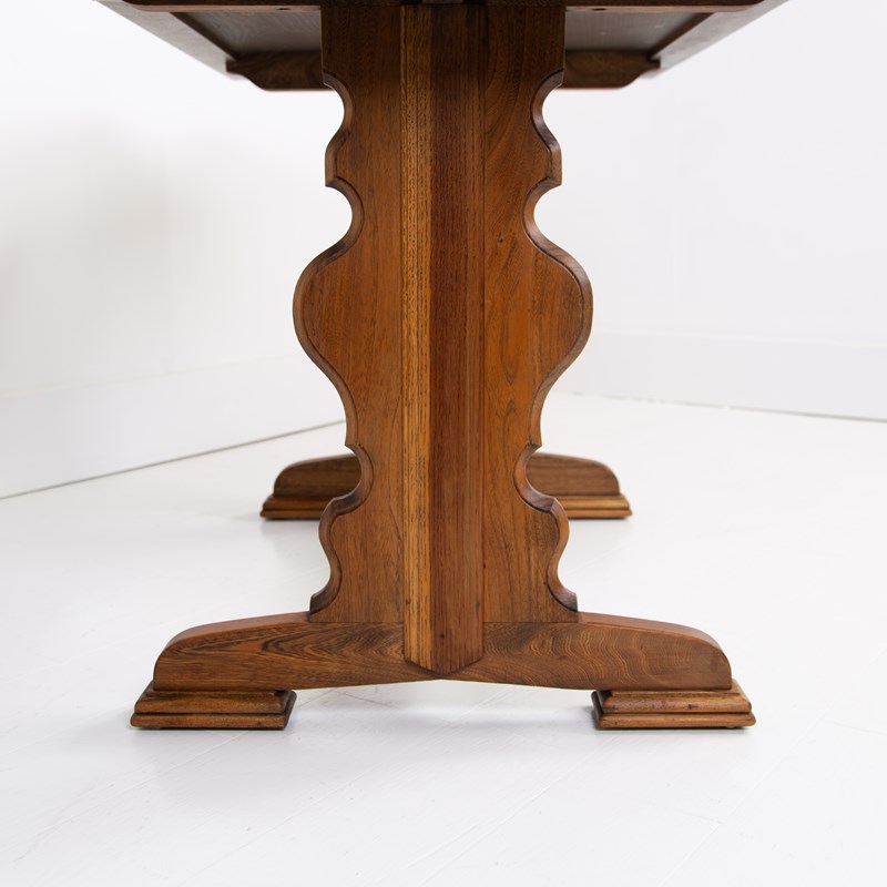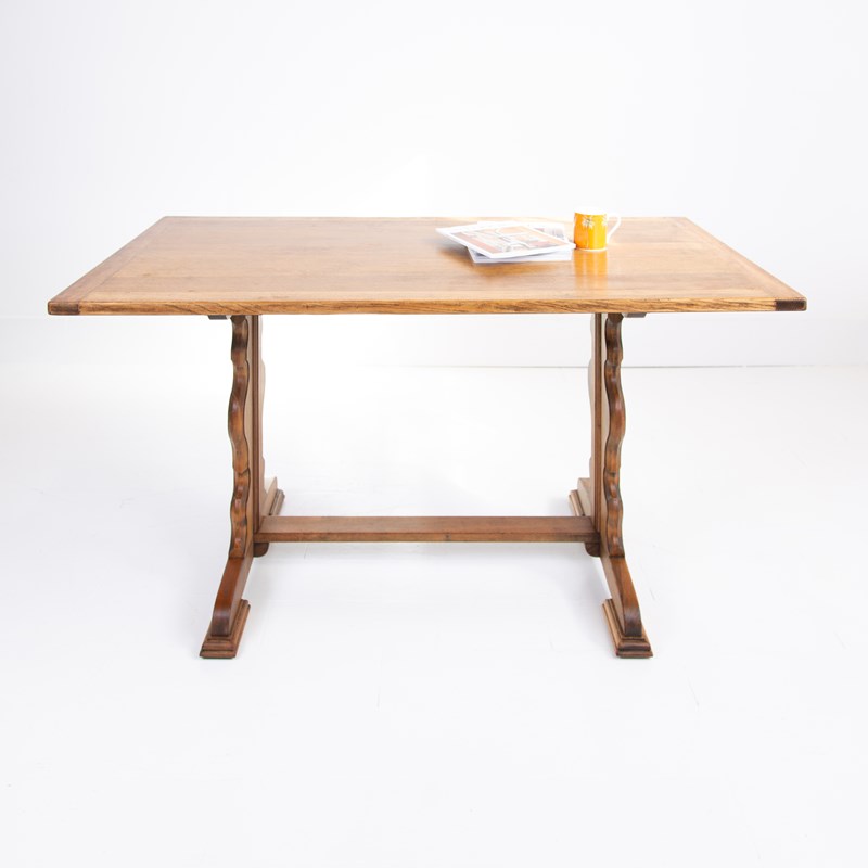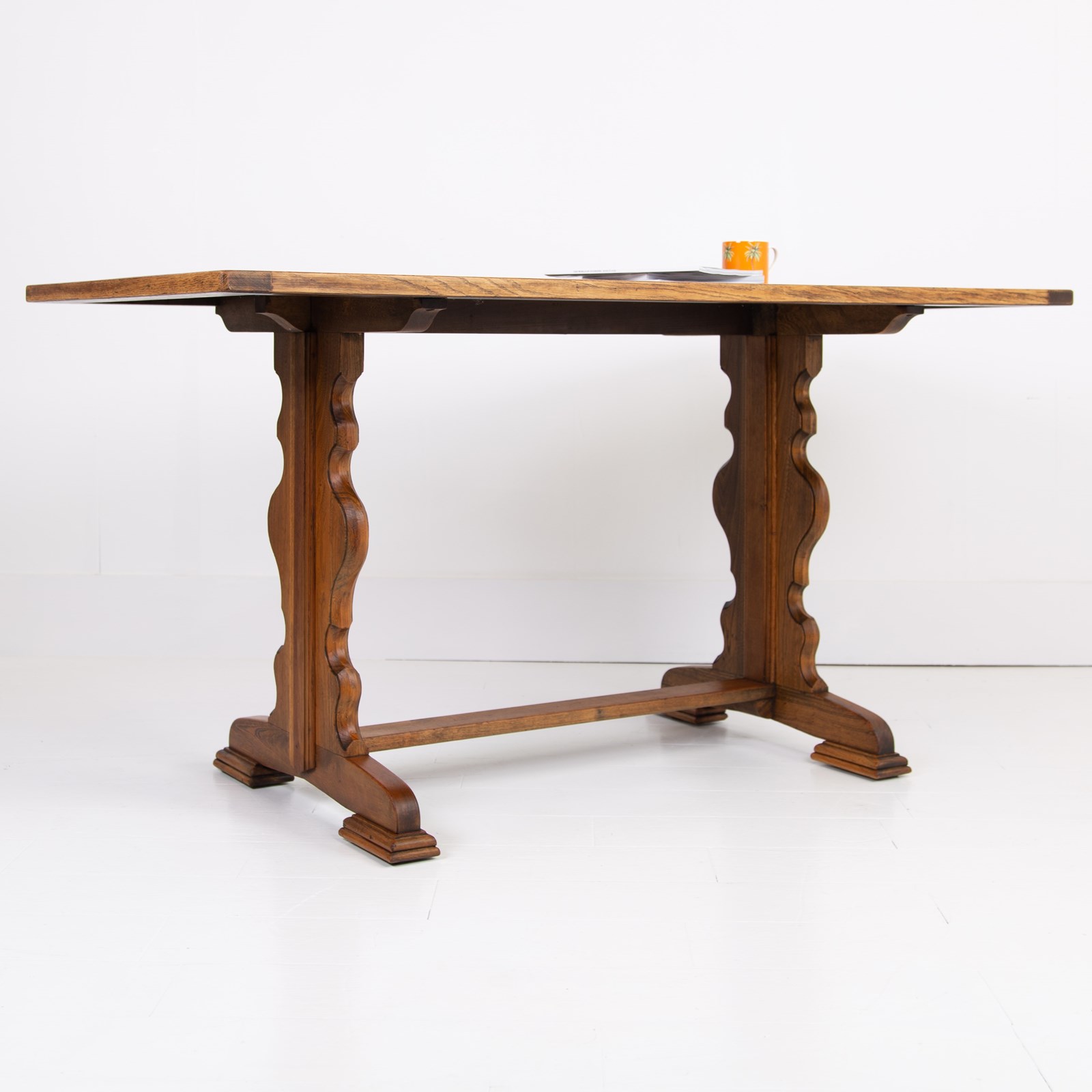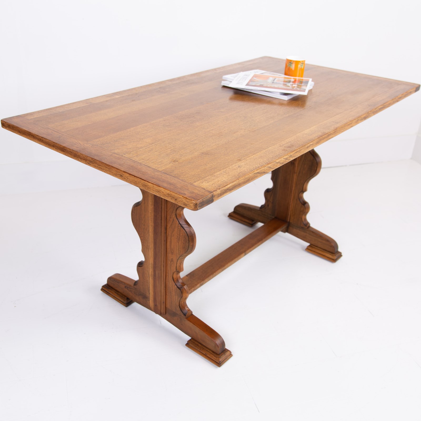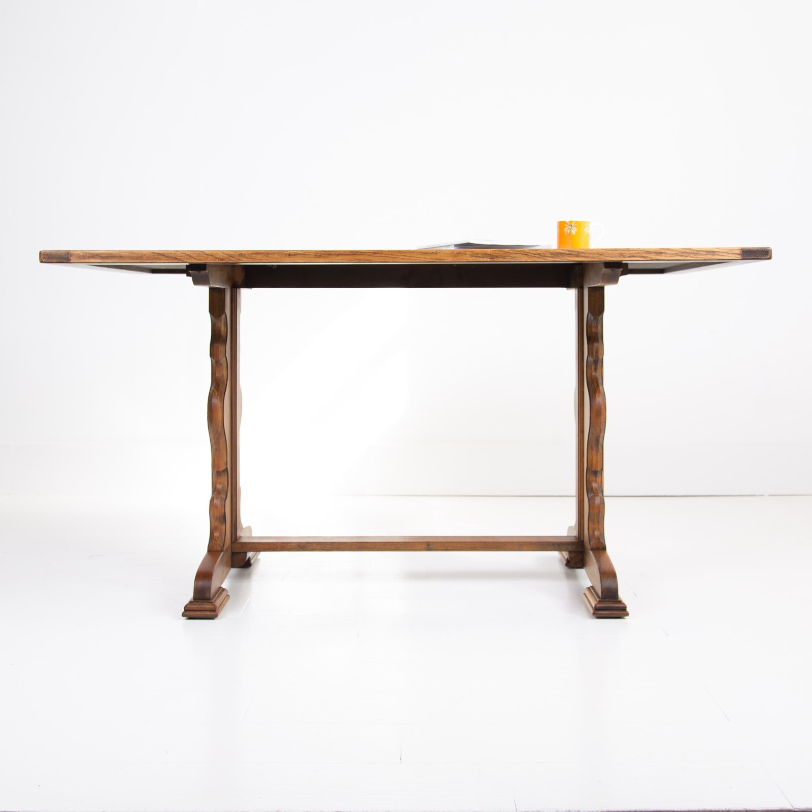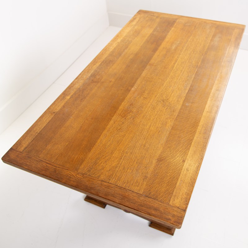 Until recently this one was used as a working desk overlooking a lovely view… We have a very attractive looking piece from around the 1930s in English oak with a well sized top and well shaped base sitting on ogee style feet. As a table it would seat 6 comfortably and as a desk gives you plenty of space.