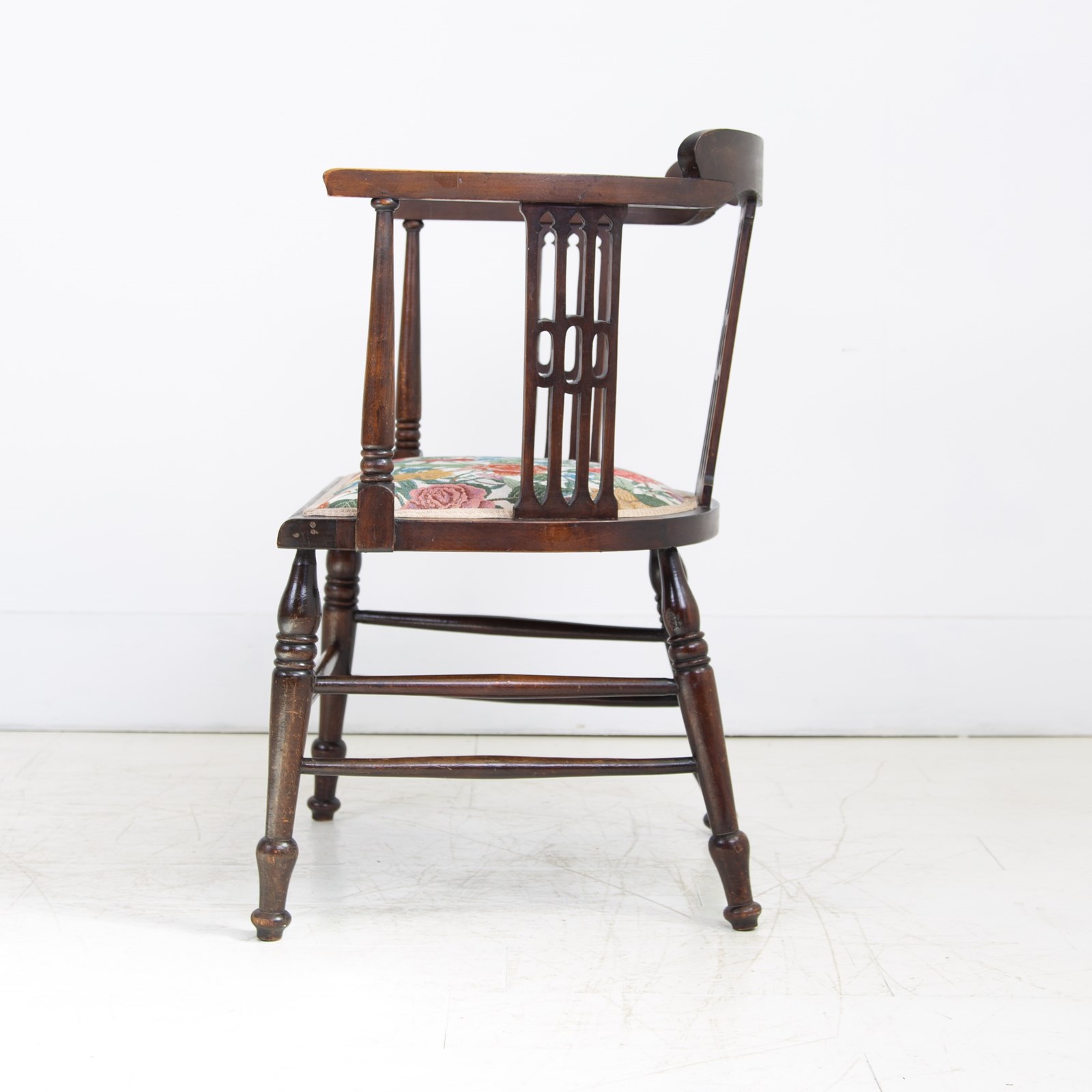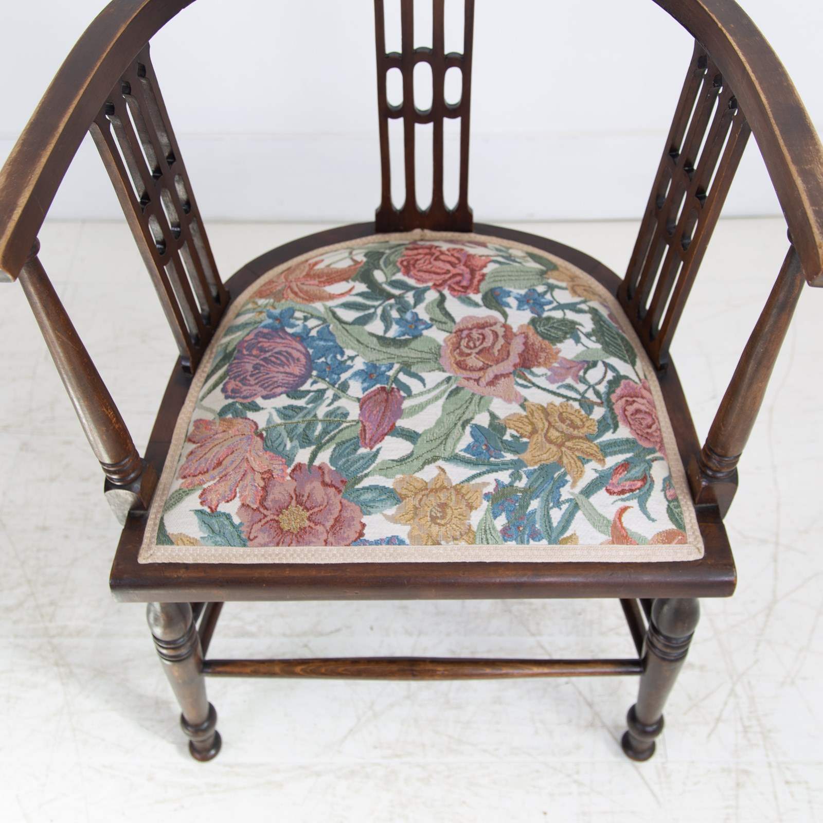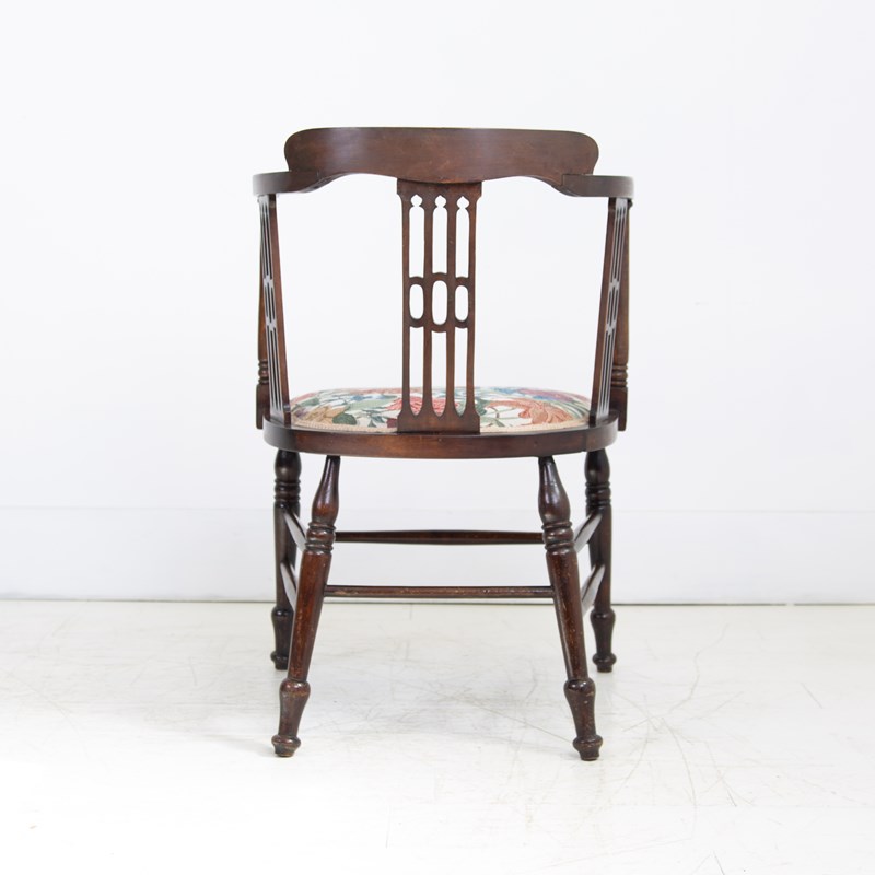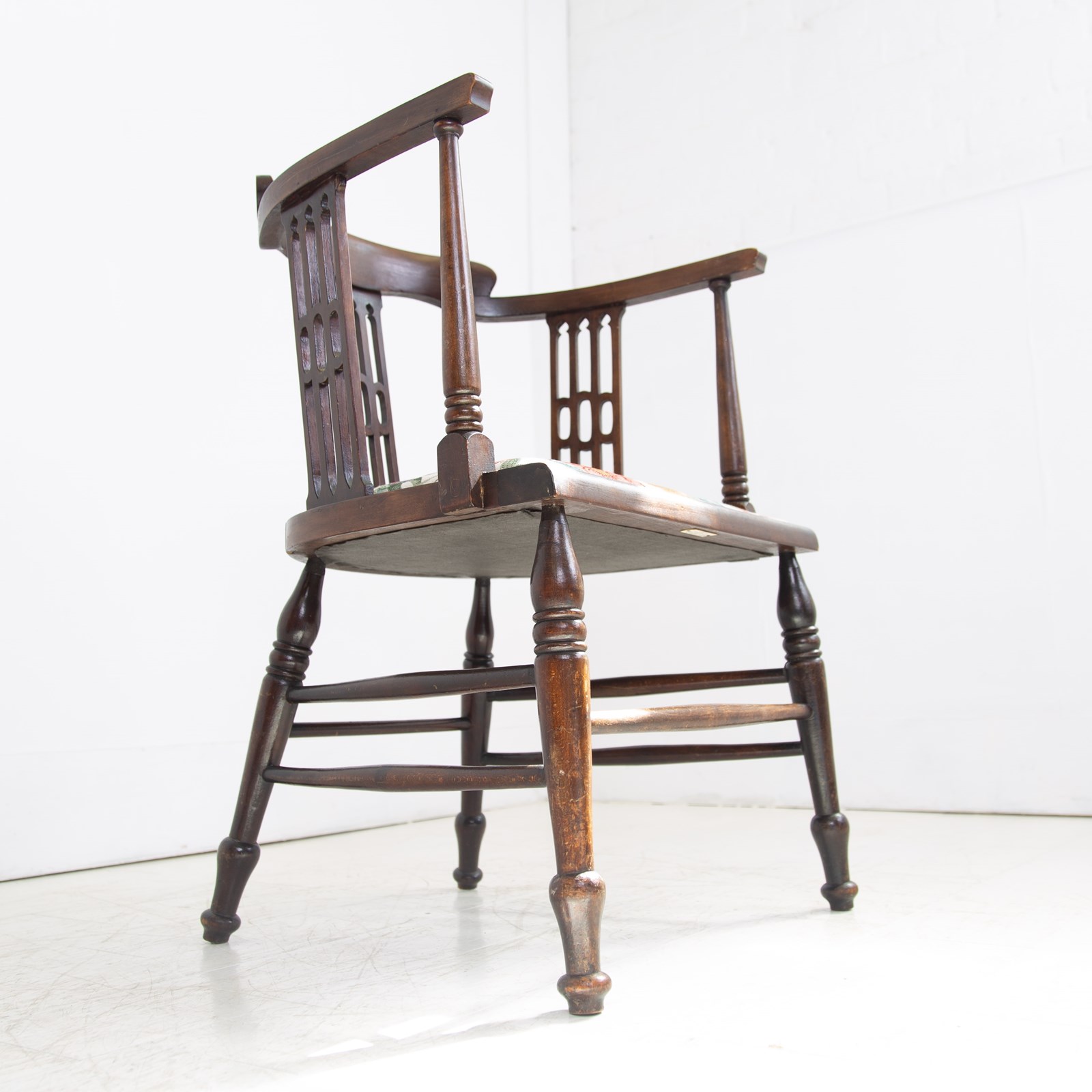 Liking the stance and look of this one with its well turned legs, attractive slender arms and good fretwork in the side panels. All in all, a fine looking chair. Condition is good with the right amount of wear in the right places, no repairs to the frame and as mentioned a comfortable well upholstered seat. Maker’s label to the underneath of the chair seat.