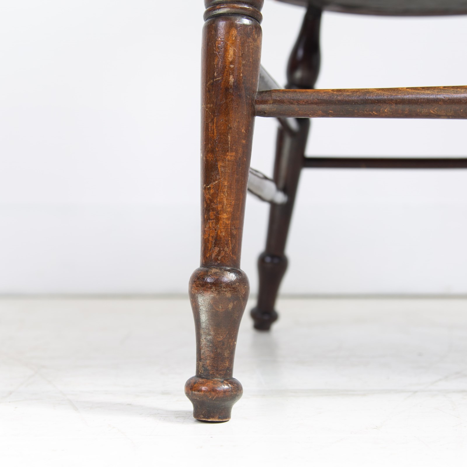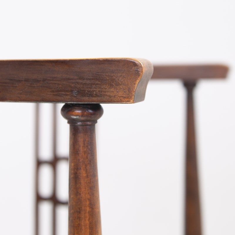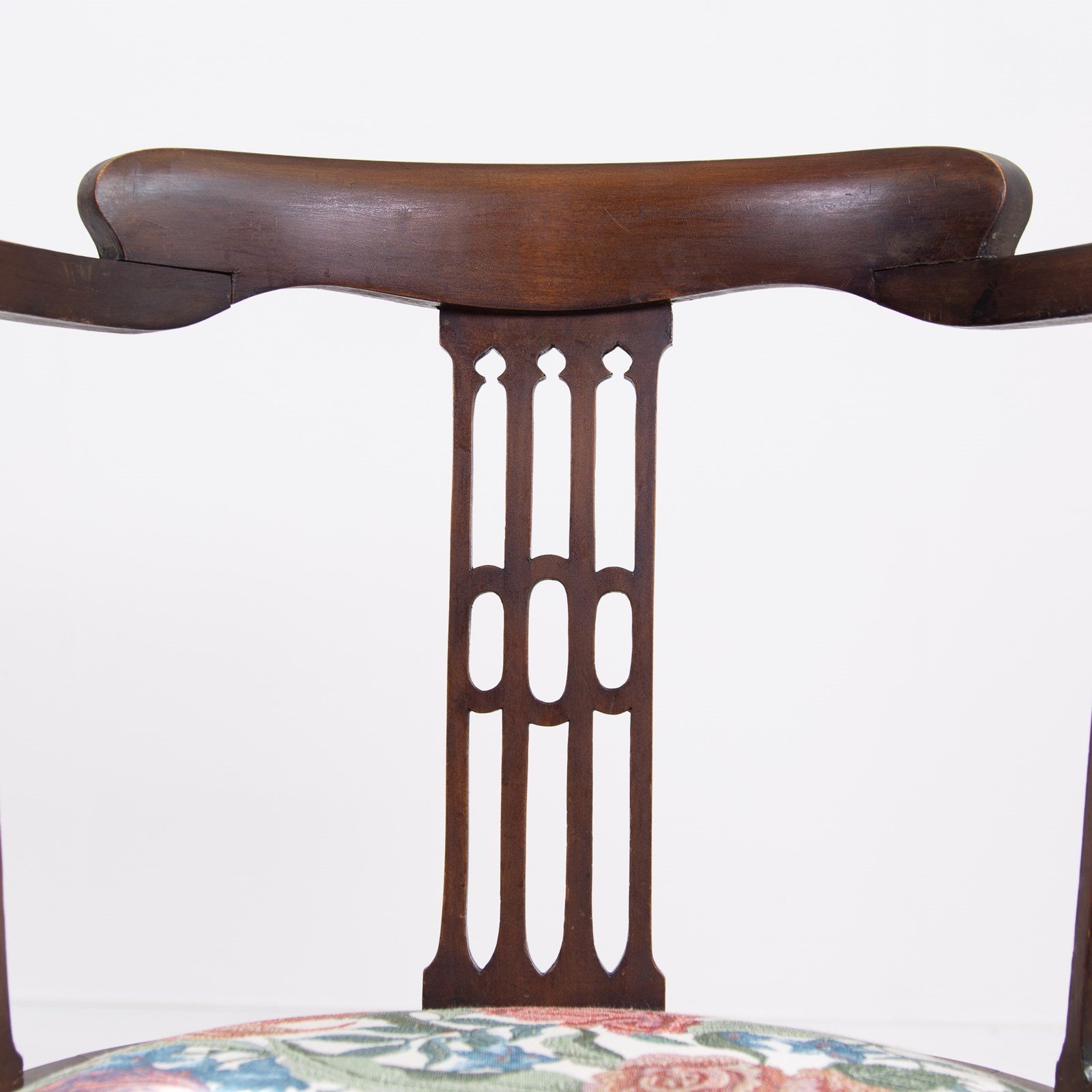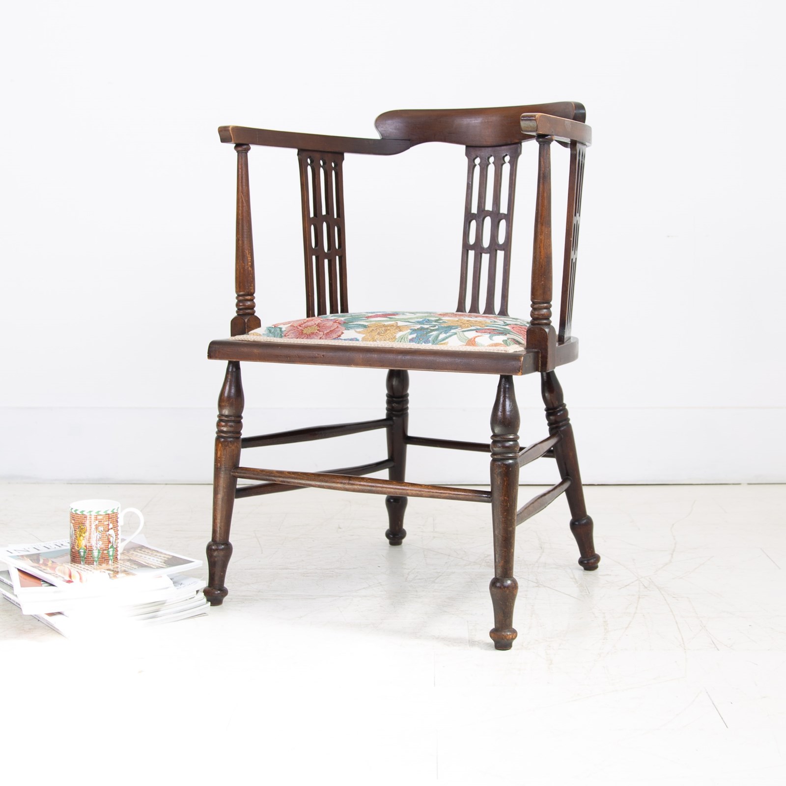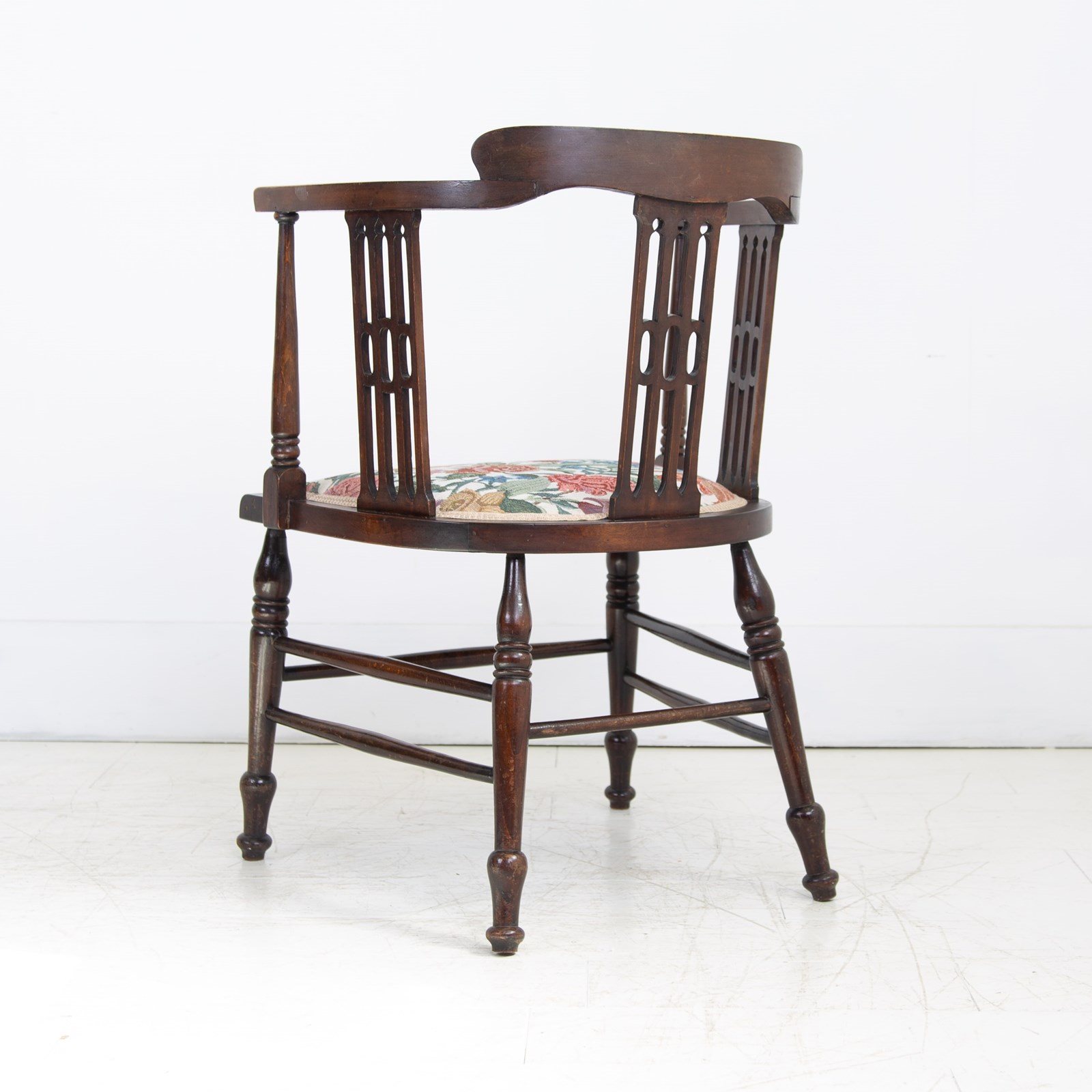 Liking the stance and look of this one with its well turned legs, attractive slender arms and good fretwork in the side panels. All in all, a fine looking chair. Condition is good with the right amount of wear in the right places, no repairs to the frame and as mentioned a comfortable well upholstered seat. Maker’s label to the underneath of the chair seat.
