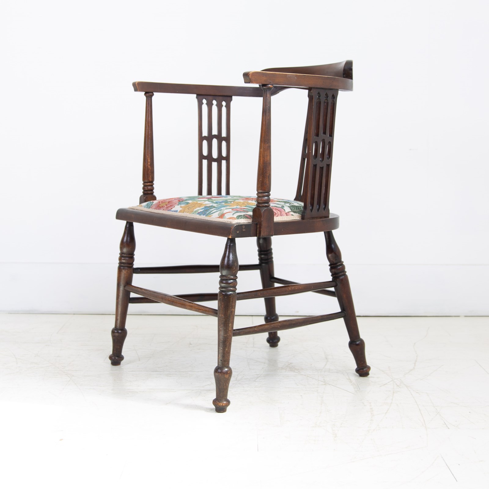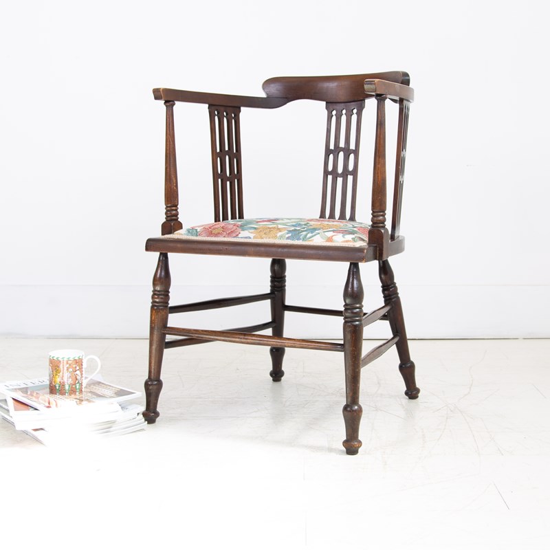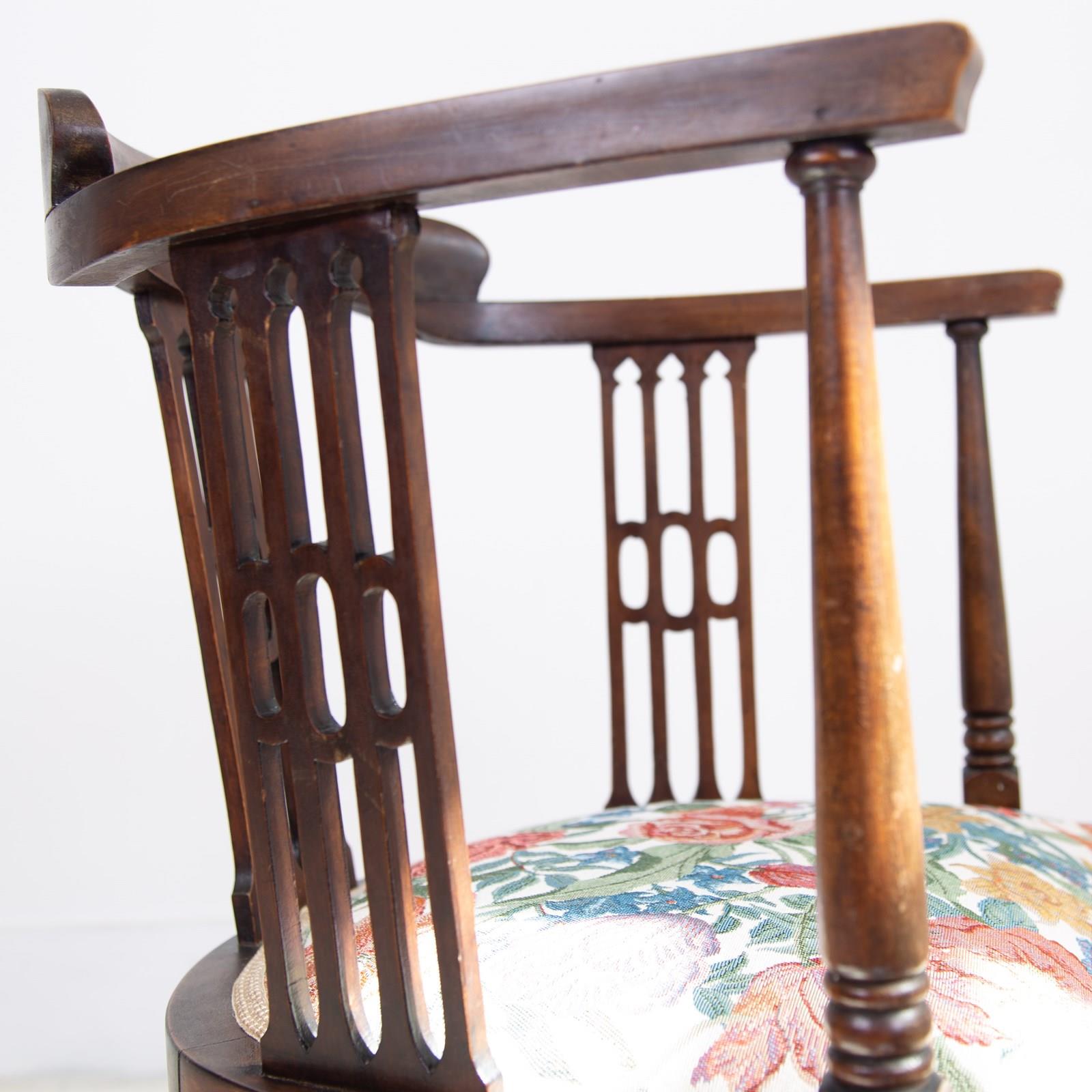 A highly attractive and very placeable late Victorian Edwardian occasional armchair with upholstered seat in a good quality floral cotton double weave fabric which is plump and relatively freshly completed with new webbing etc.