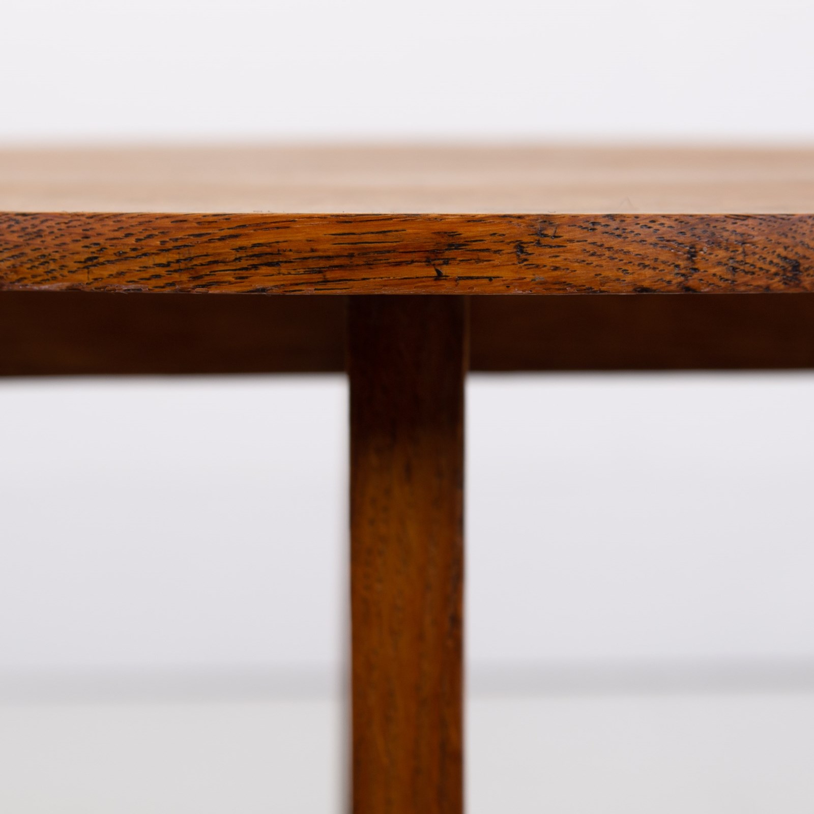 A delightful Cotswold School oak side table with a lean graceful top, cruciform base and lovely shaped ends. This one sits in nice condition with the oak giving off a warm golden glow and sensible aging. Oak dowels and joints on display, it's a well made piece with a little label showing the name Turnbull - maybe the maker or intended owner.