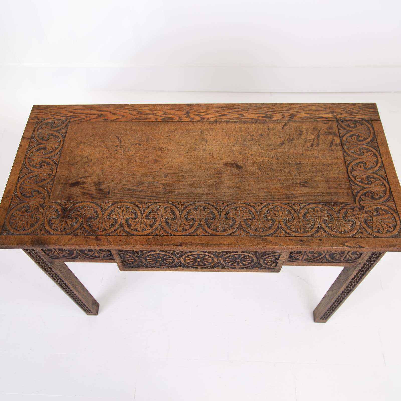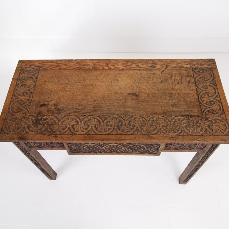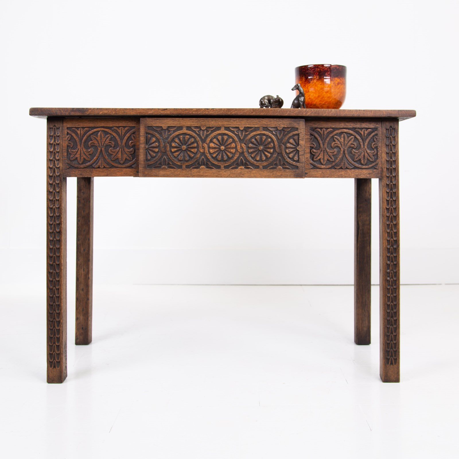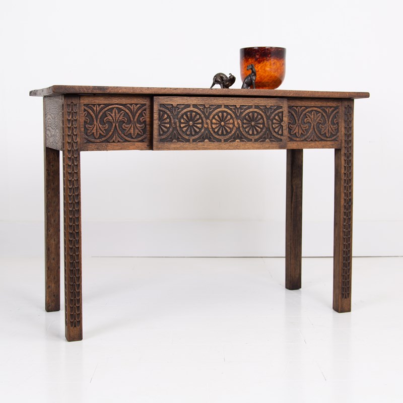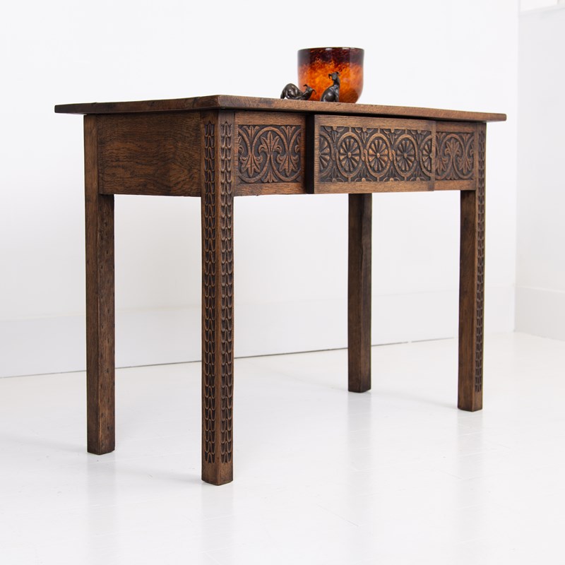A great looking chip carved oak side table with drawer C1900, it’s a good scale for a hall, living room or maybe a desk.
