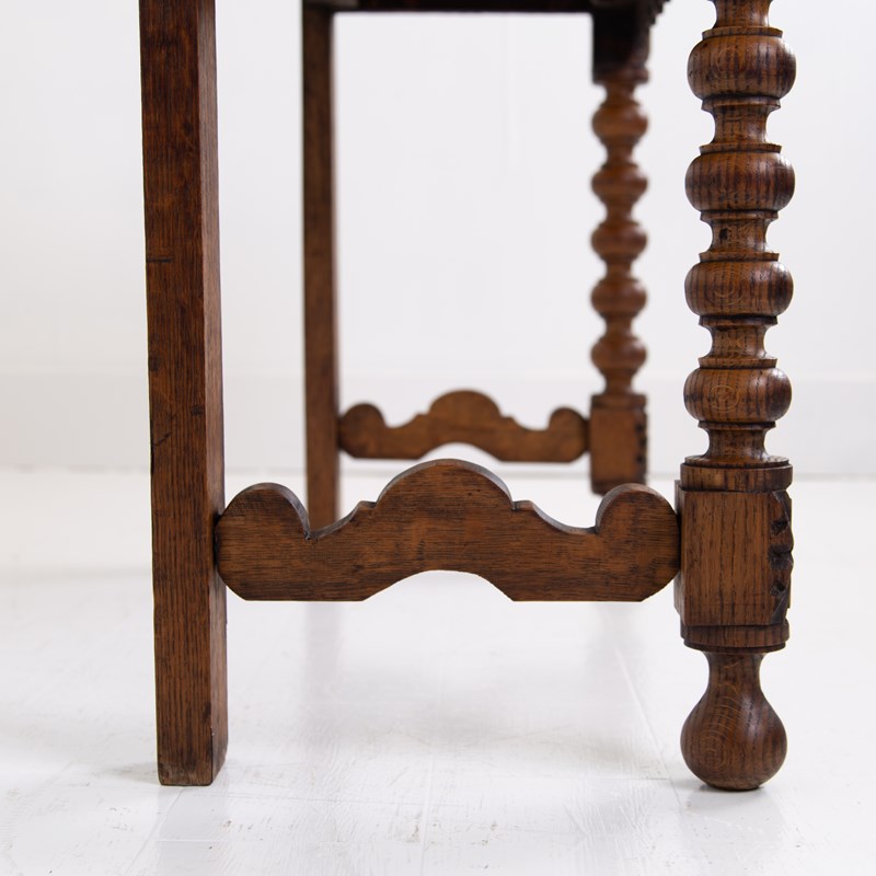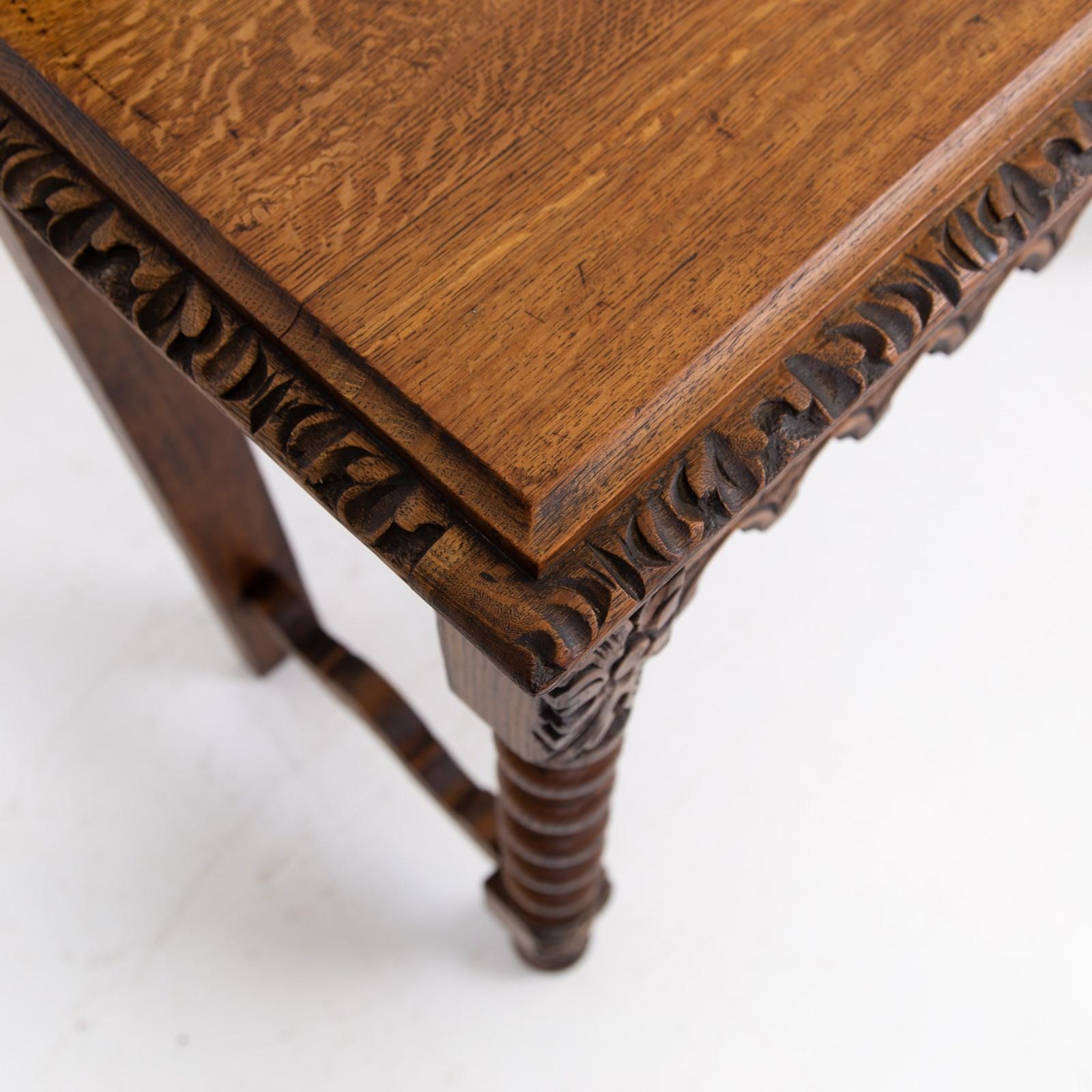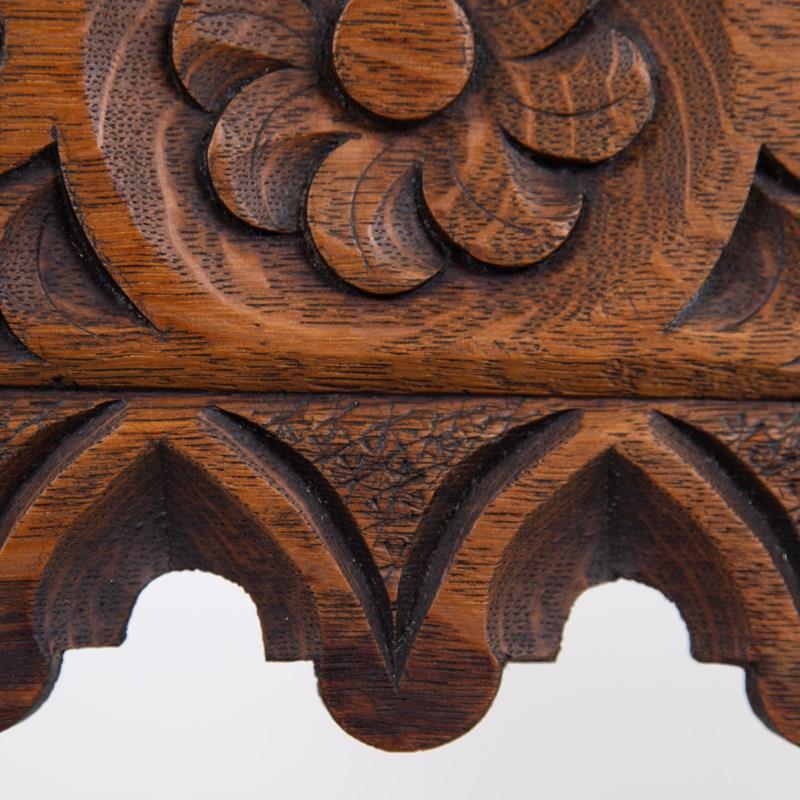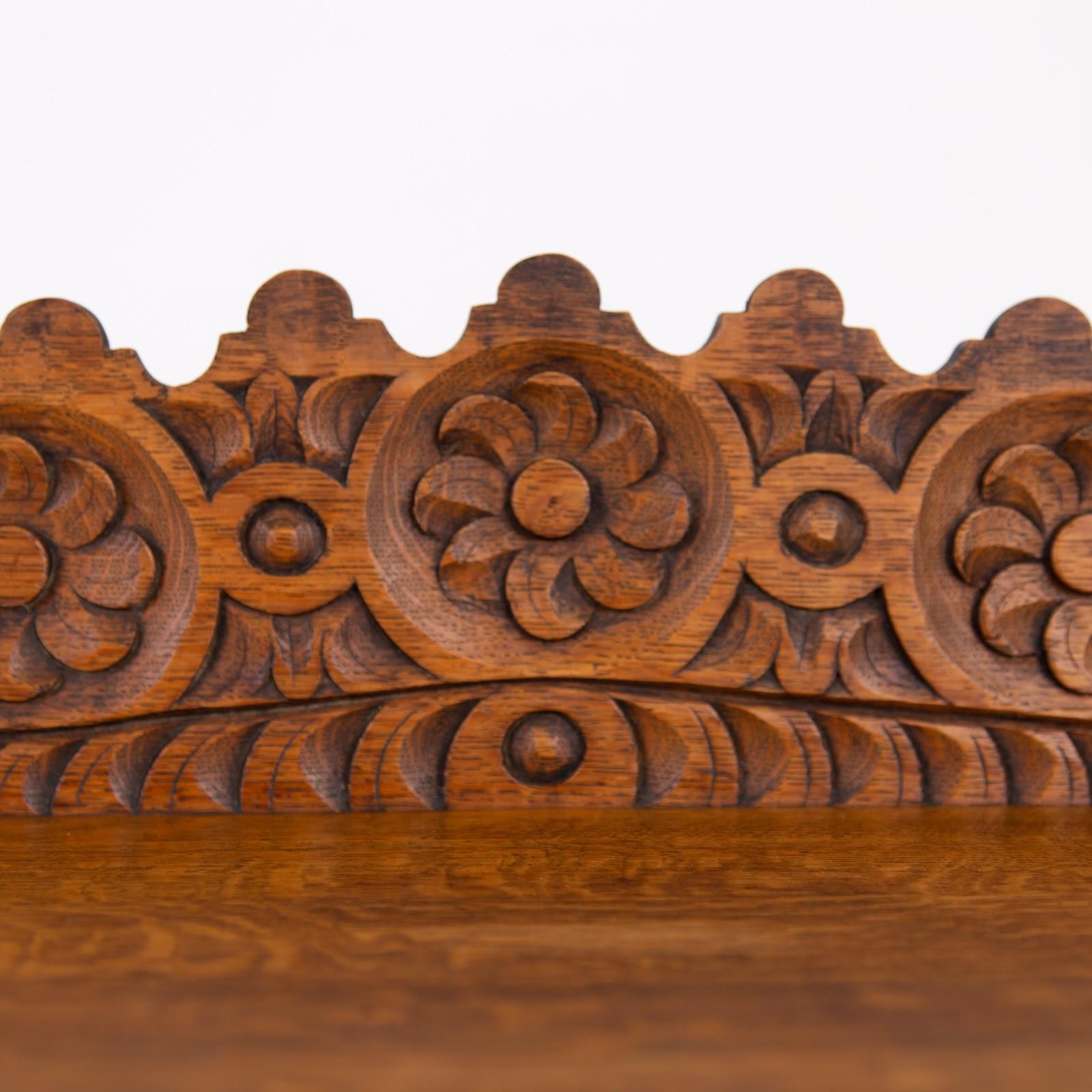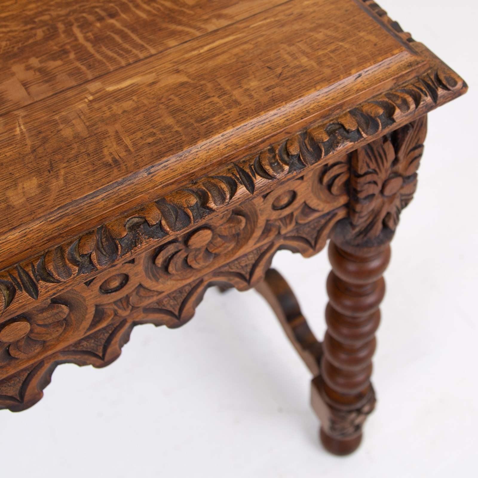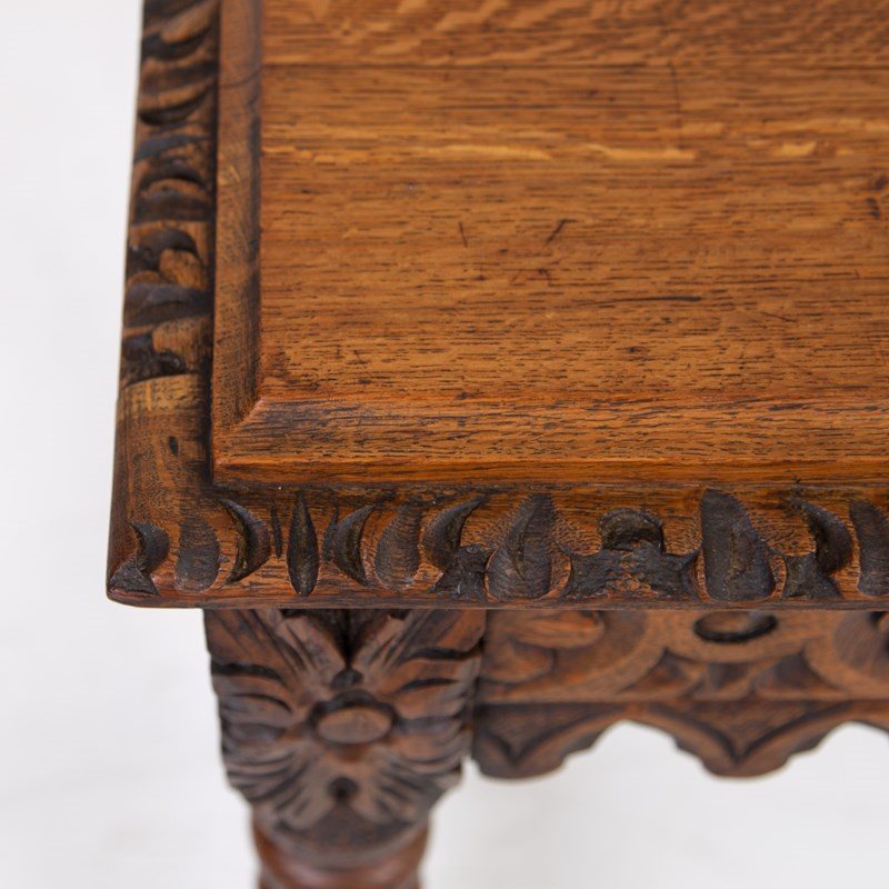 What a wonderfully decorative Victorian oak table in super condition and ready to place. This one possesses plenty of petal power with its stylish flower head carved pattern to the arched back and front and these handsome turned front legs. The quality and design is first rate and it possesses real charm and character.