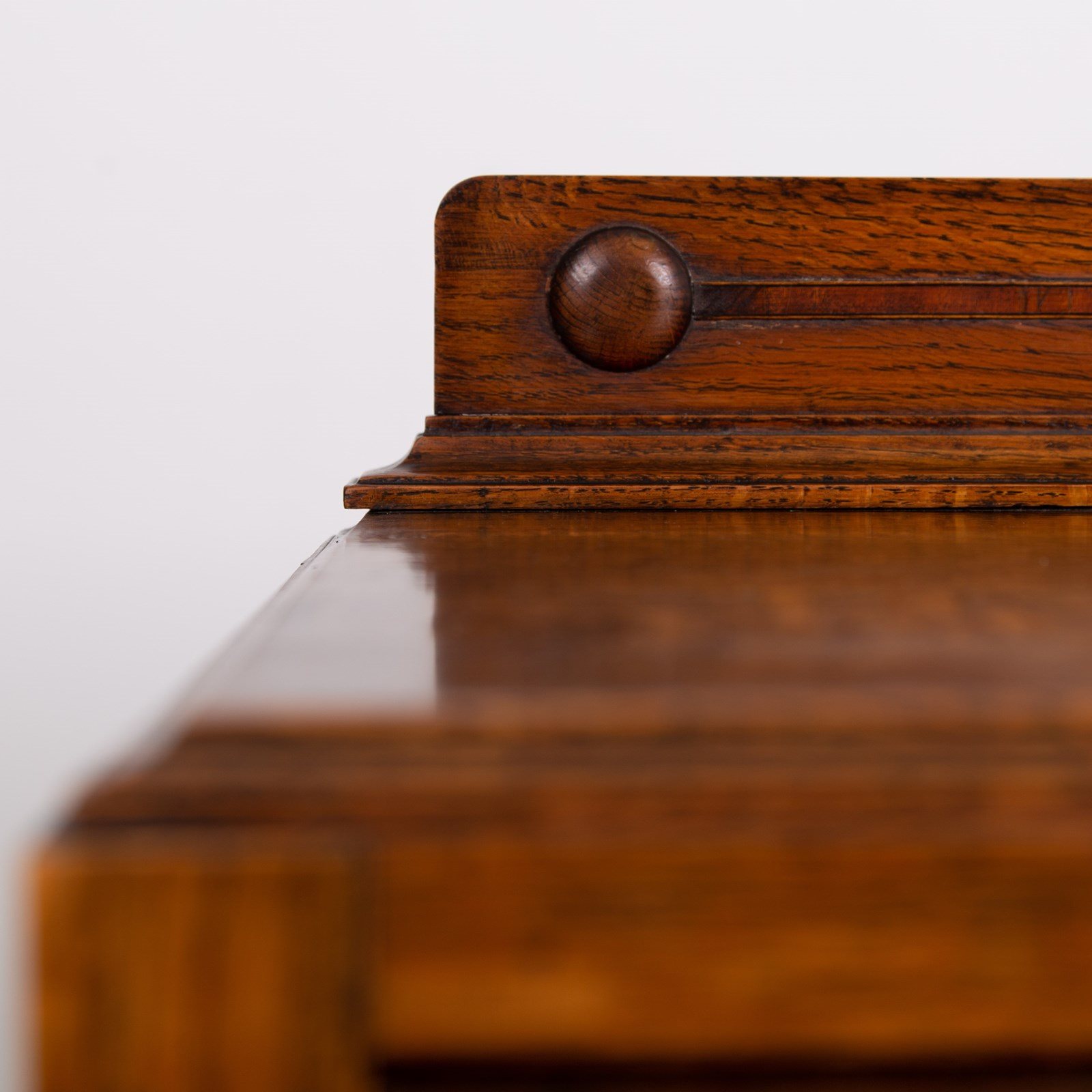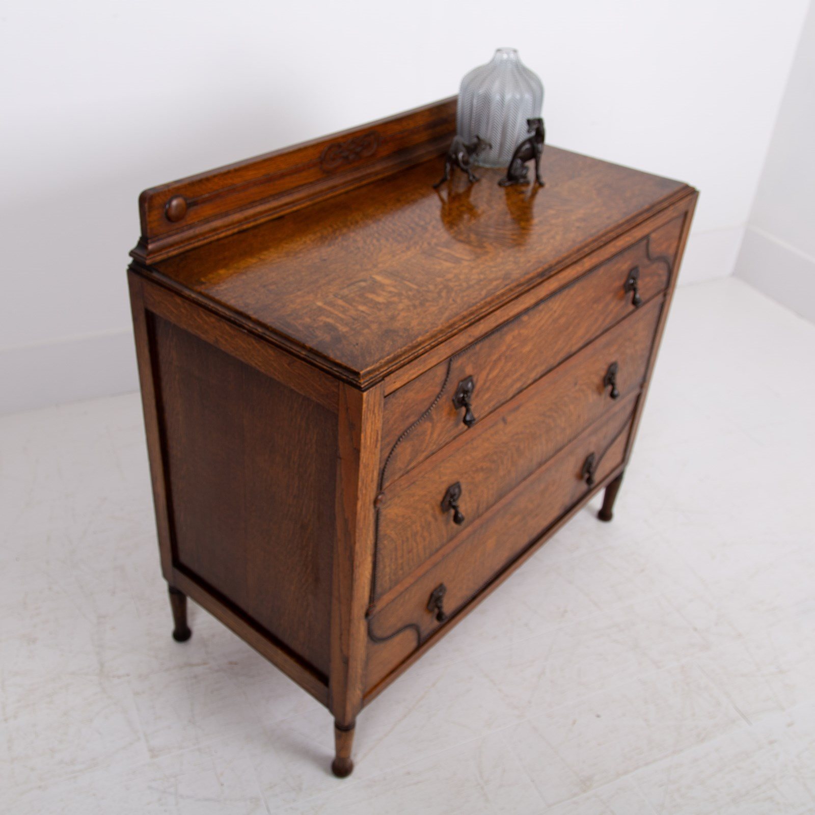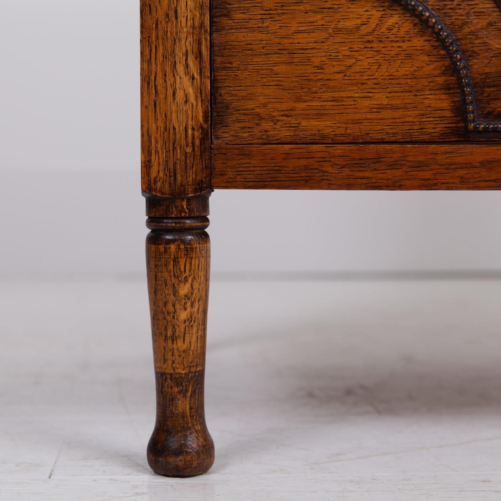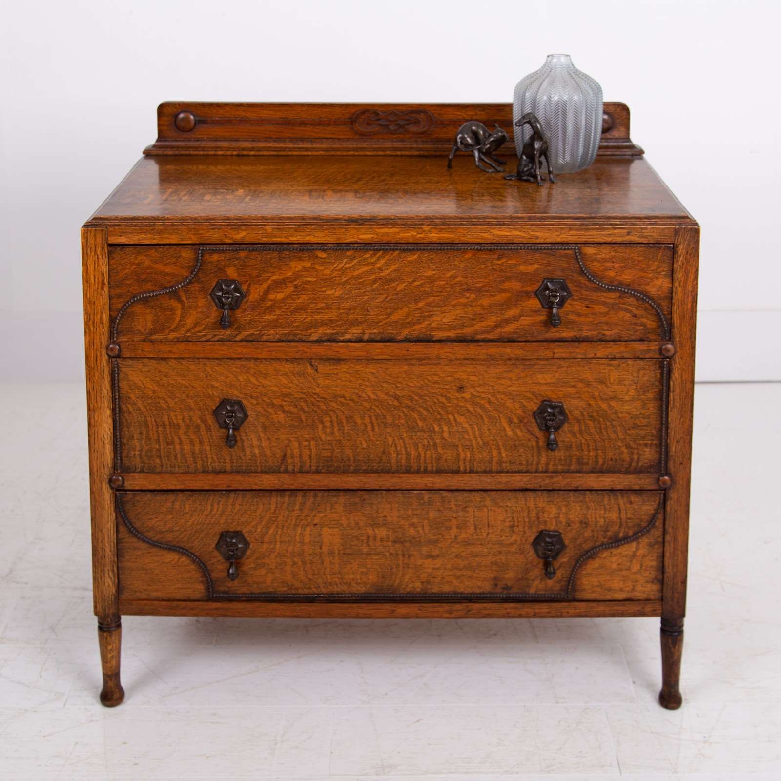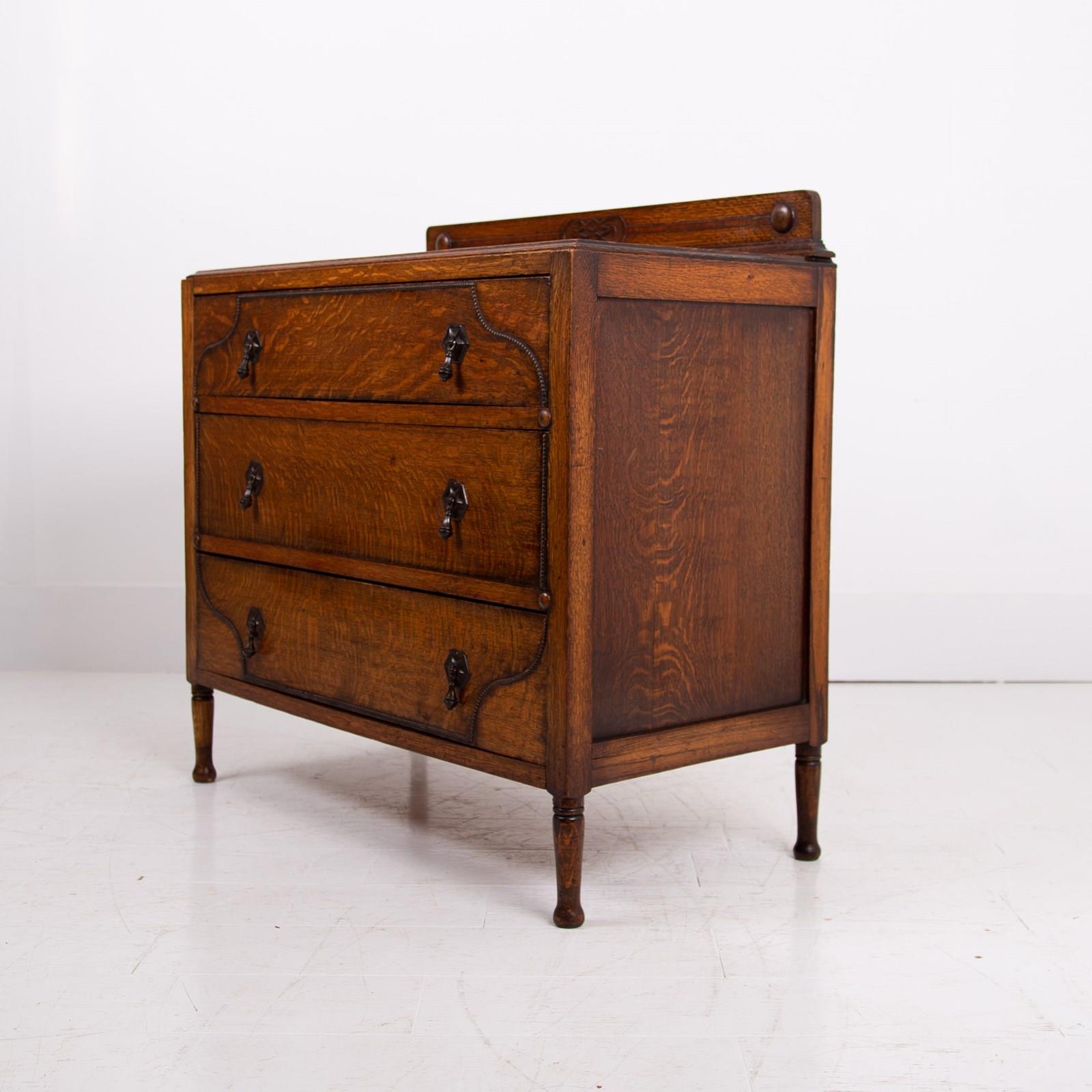 A rather charming little oak of 3 drawers which would slot into a period or modern home with ease. It's an attractive little number with slender oak turned legs supporting 3 deep drawers which are decorated with a trail of small oak beading and cast drop handles.
