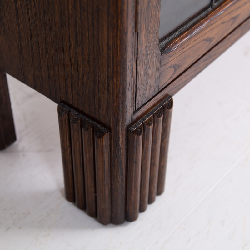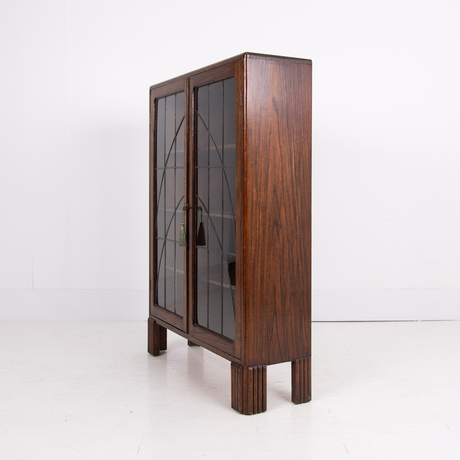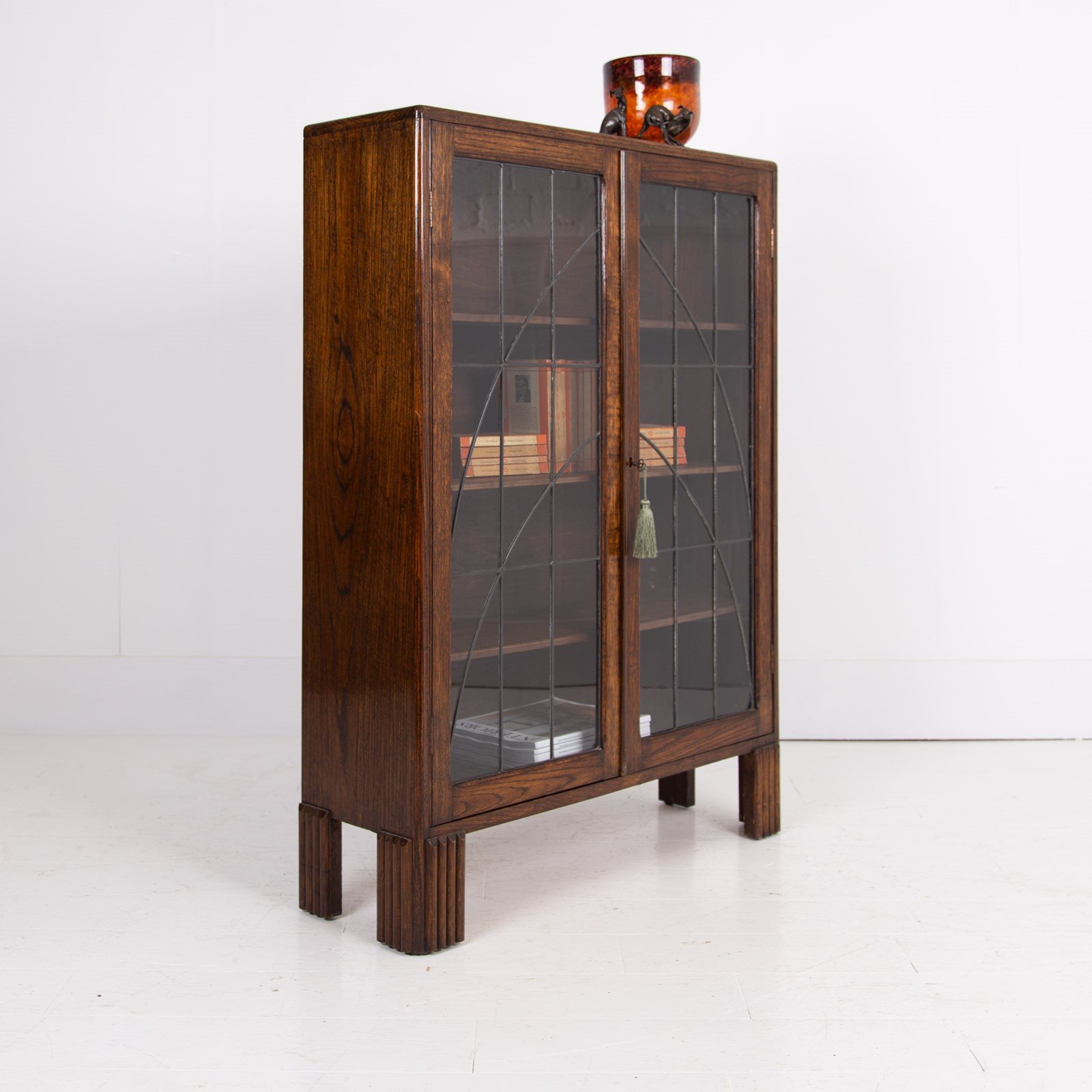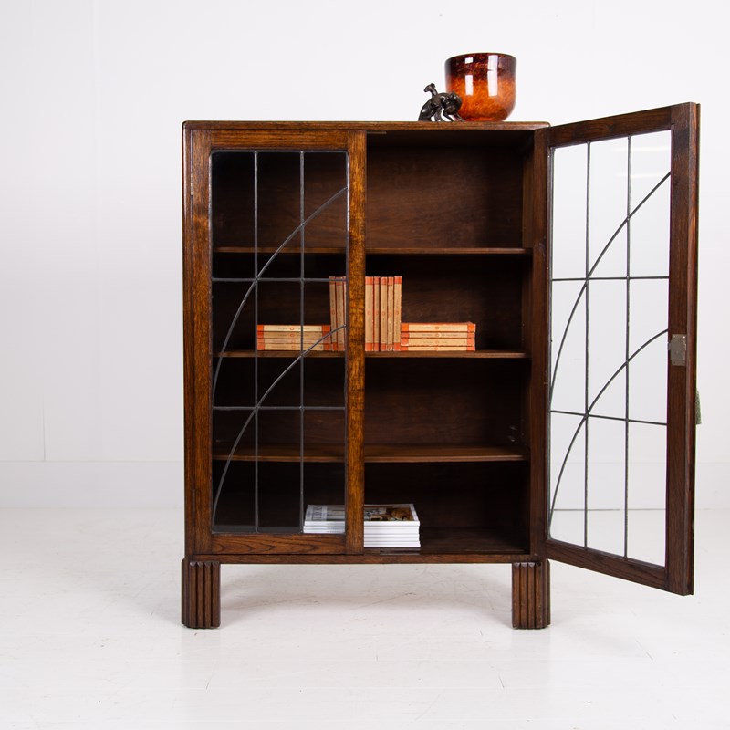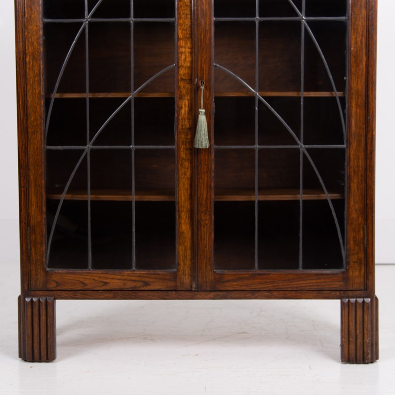 This one comes with a working lock and key, three adjustable shelves, a lovely pattern to the leaded doors and all perched on highly attractive Art Deco inspired legs. Condition is good with light aging to the piece. No repairs or cracks to the glass and ready to place after a short session in our workshop.