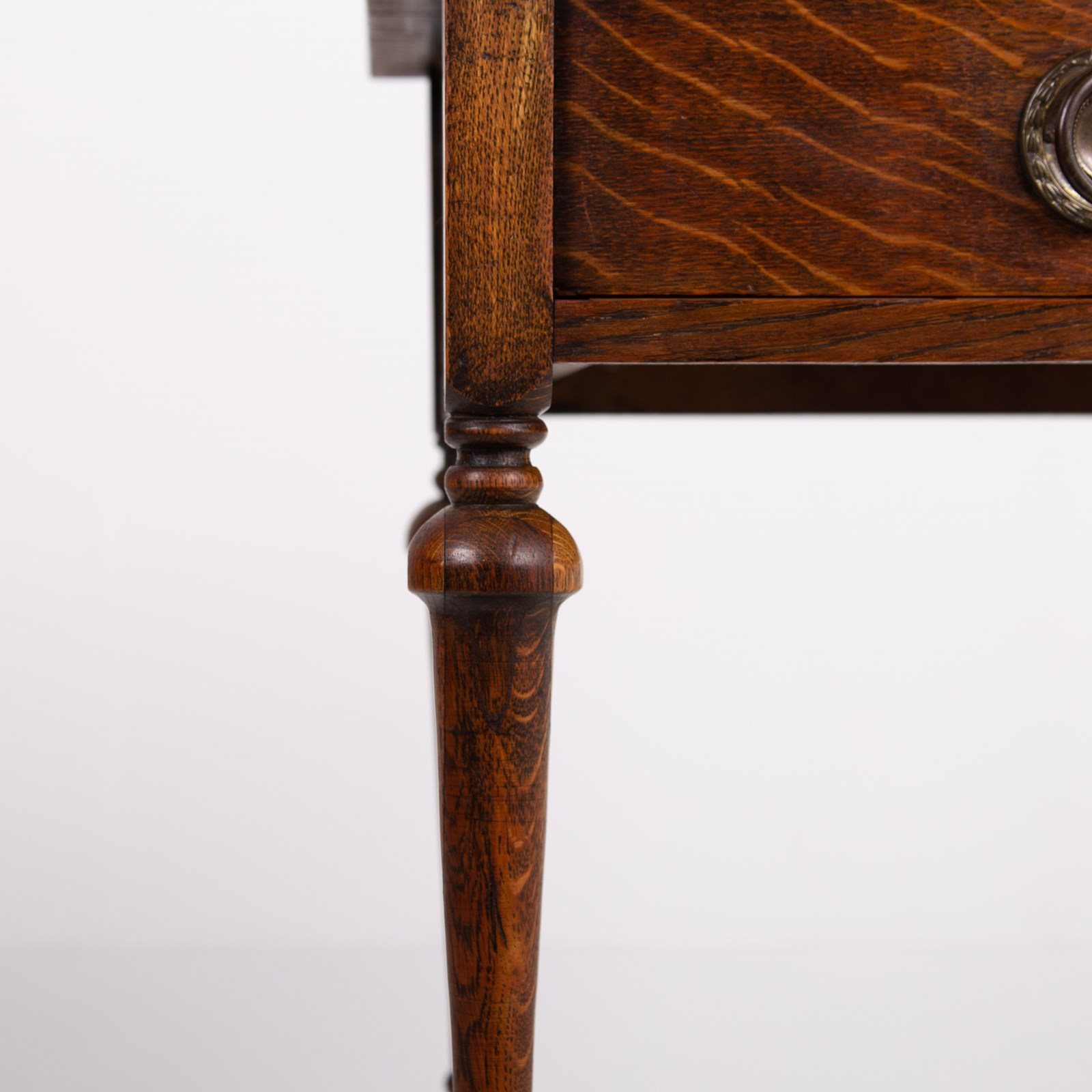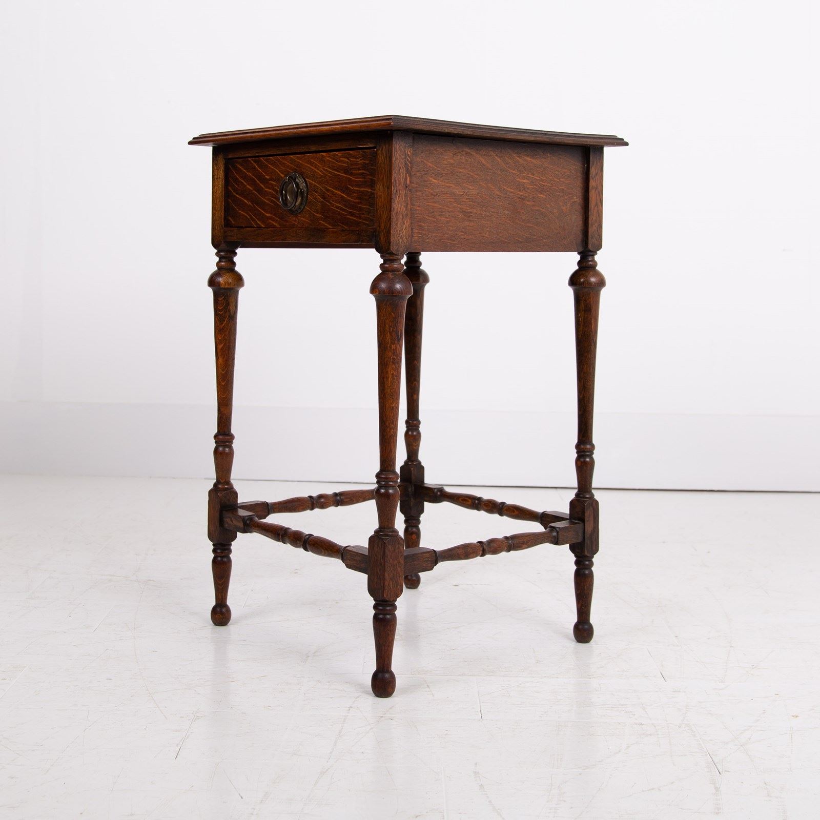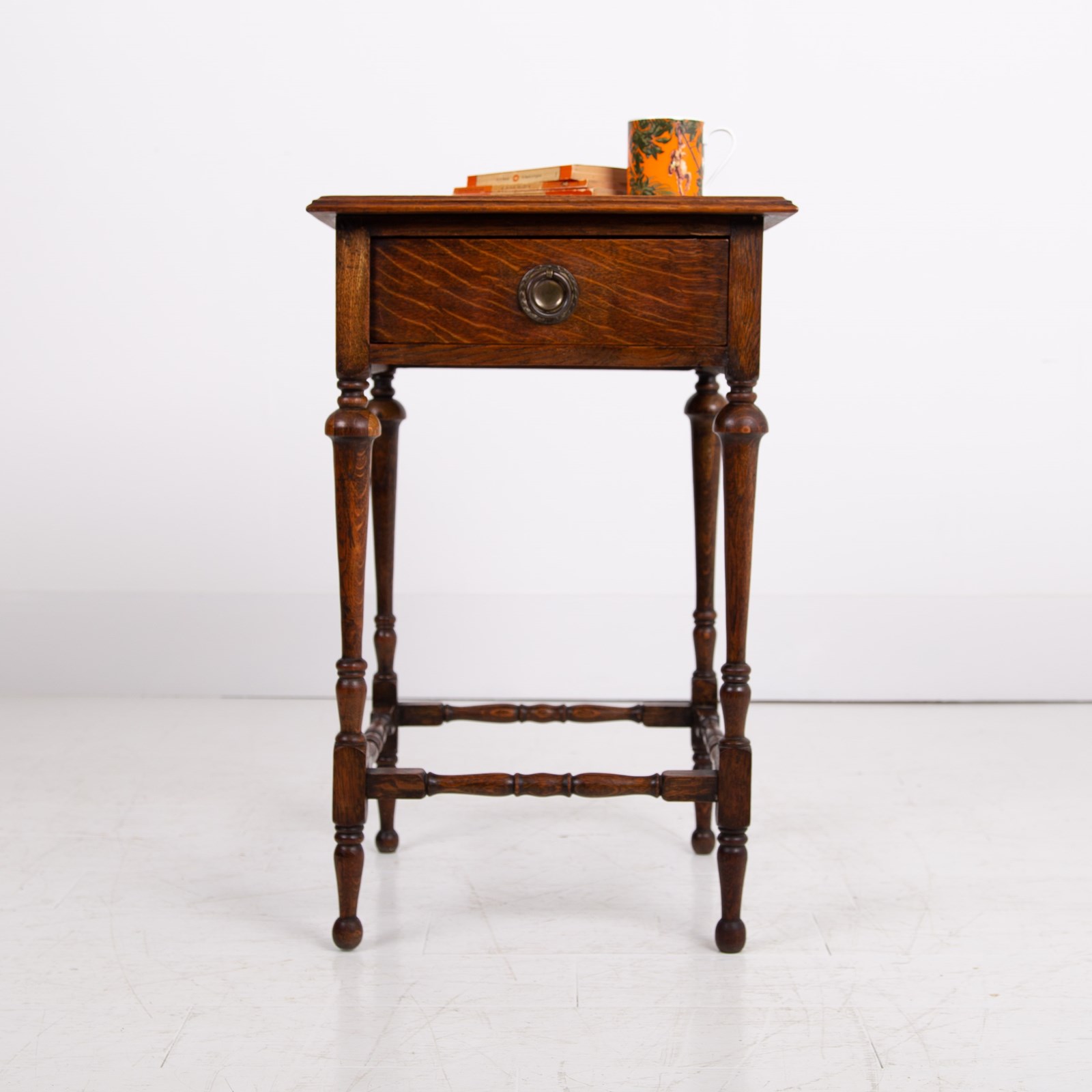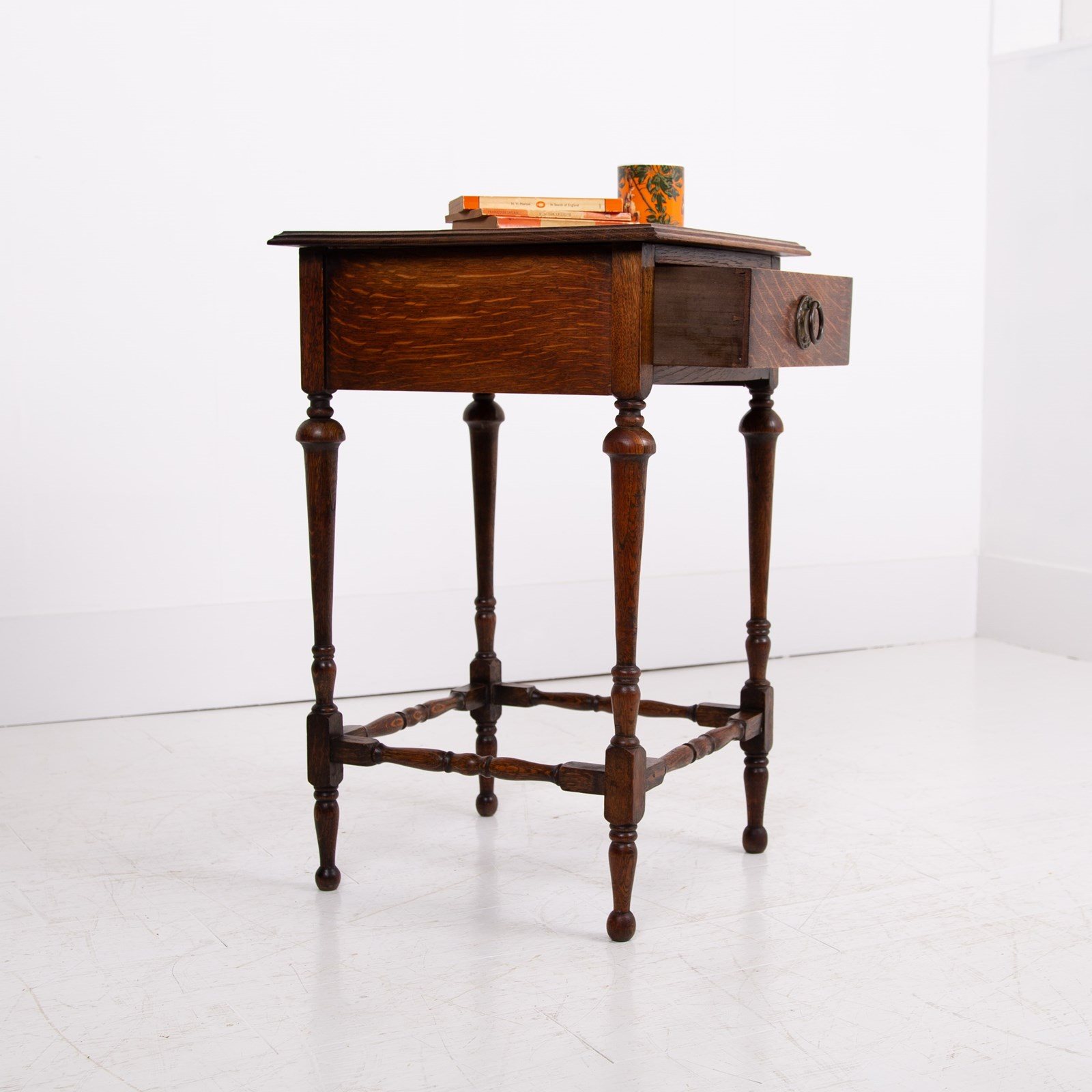 We have a small English oak side table with an ever useful drawer C1920. The table is a perfect size for a lamp, maybe plonked next to a favourite chair or into a cottage hallway. The piece sits well with its decorative turned legs and base and possesses that nice lived in look.