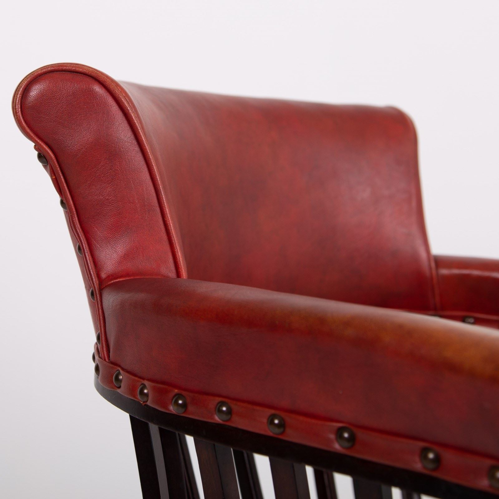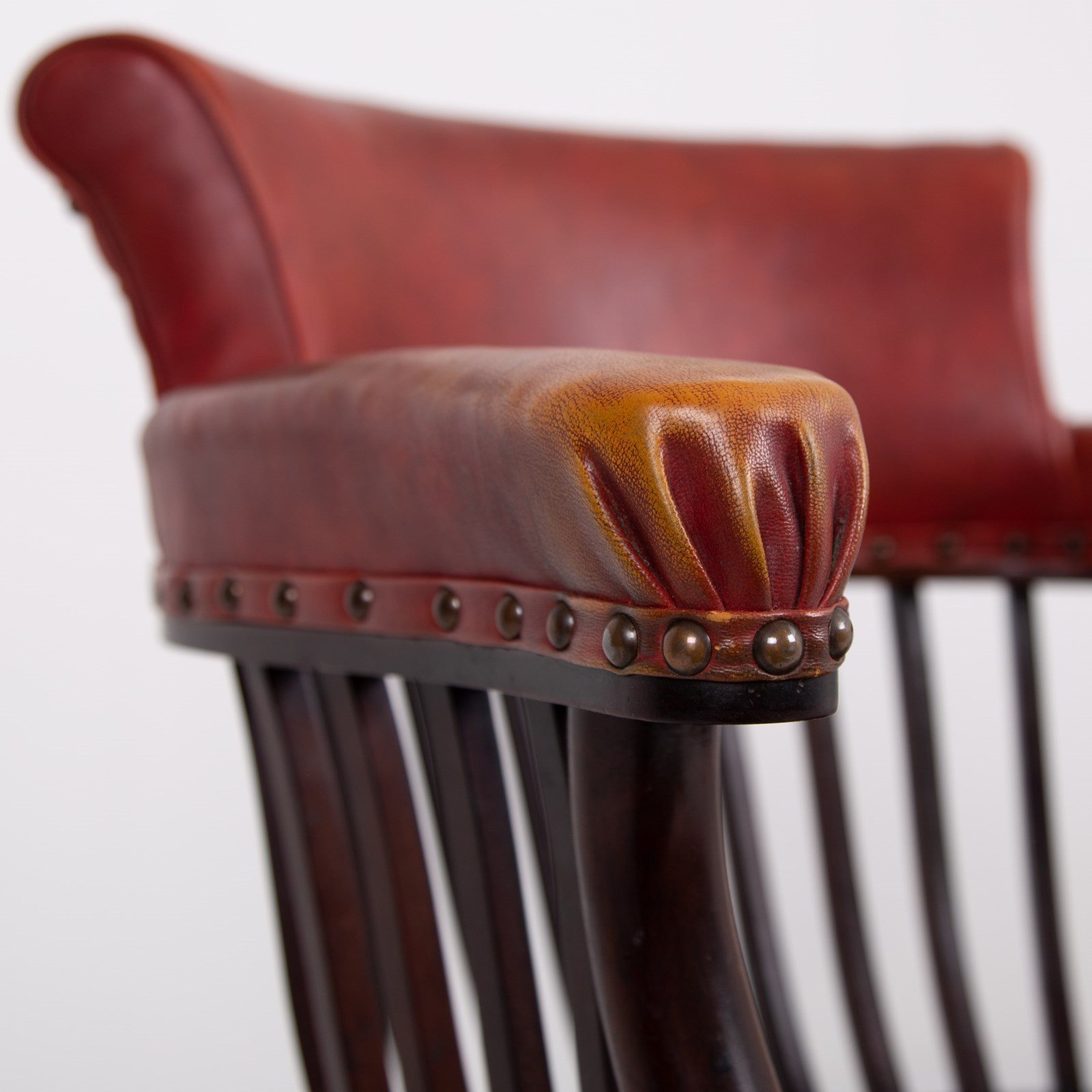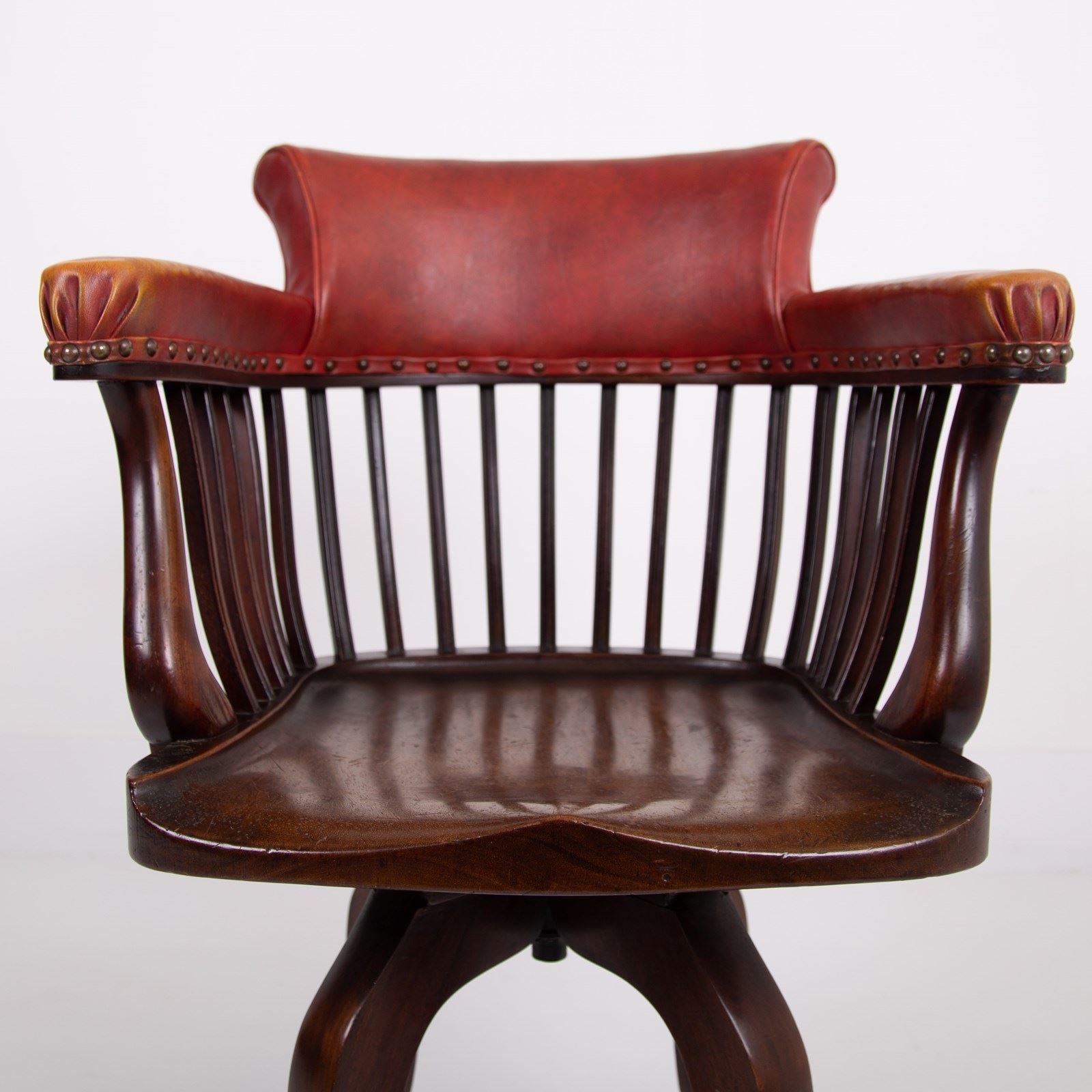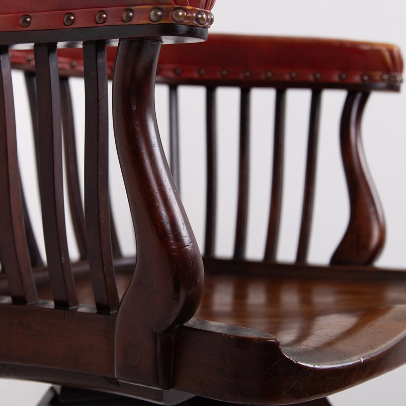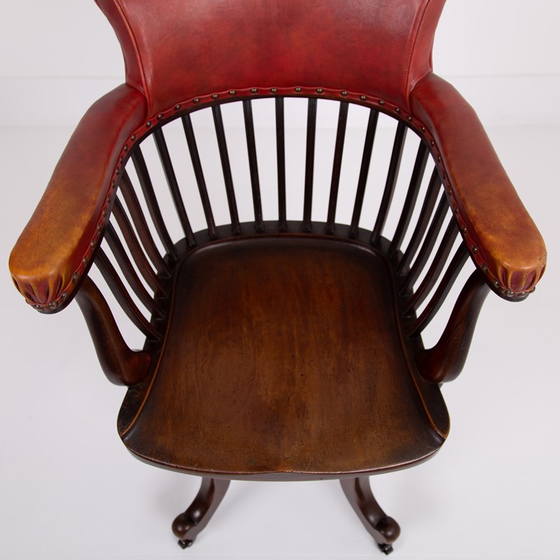 We have a well sized saddle shaped seat - attractively shaped spindles to the rear and sides and shaped arms and back which are covered in a faded red faux leather fixed with brass age tarnish studs sitting on attractive legs and a set of 4 newer period style castors.