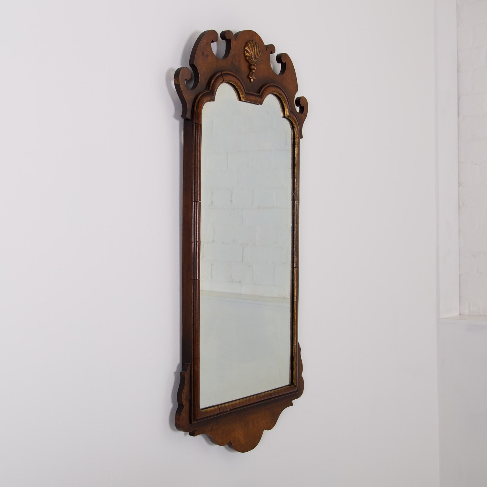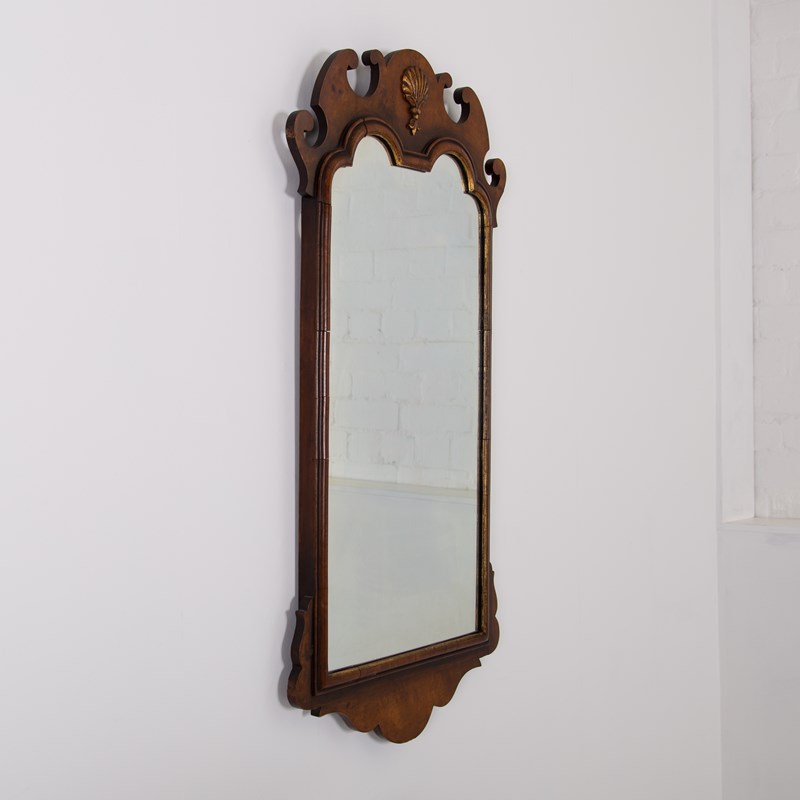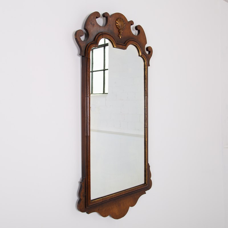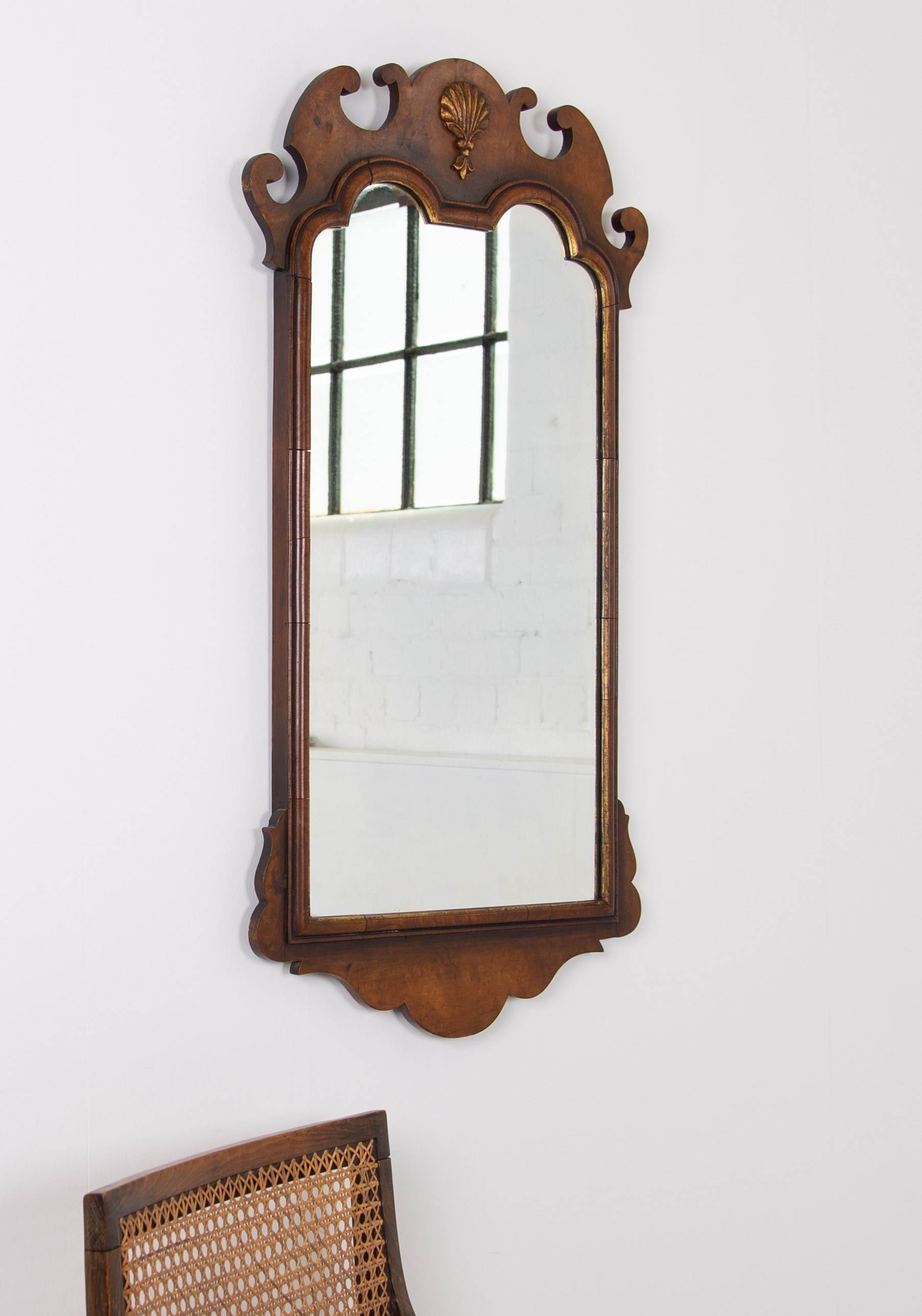 A lovely quality English walnut wall mirror of generous proportions in the Chippendale manner sitting in nice “lived in” condition. This one hangs well and works well in both a period or more modern home with its shell cartouche, inner cushion moulded gilt frame and well shaped pediment.