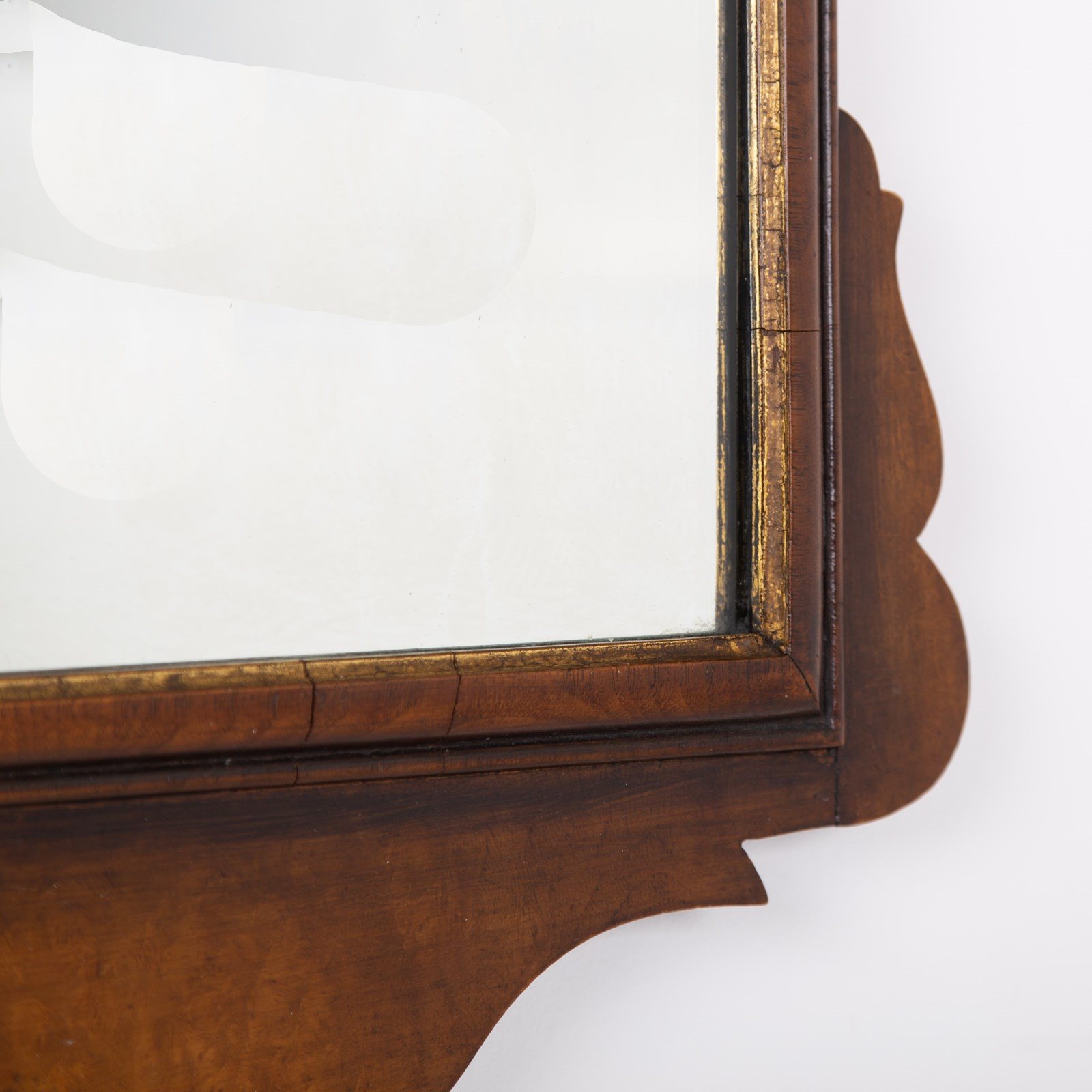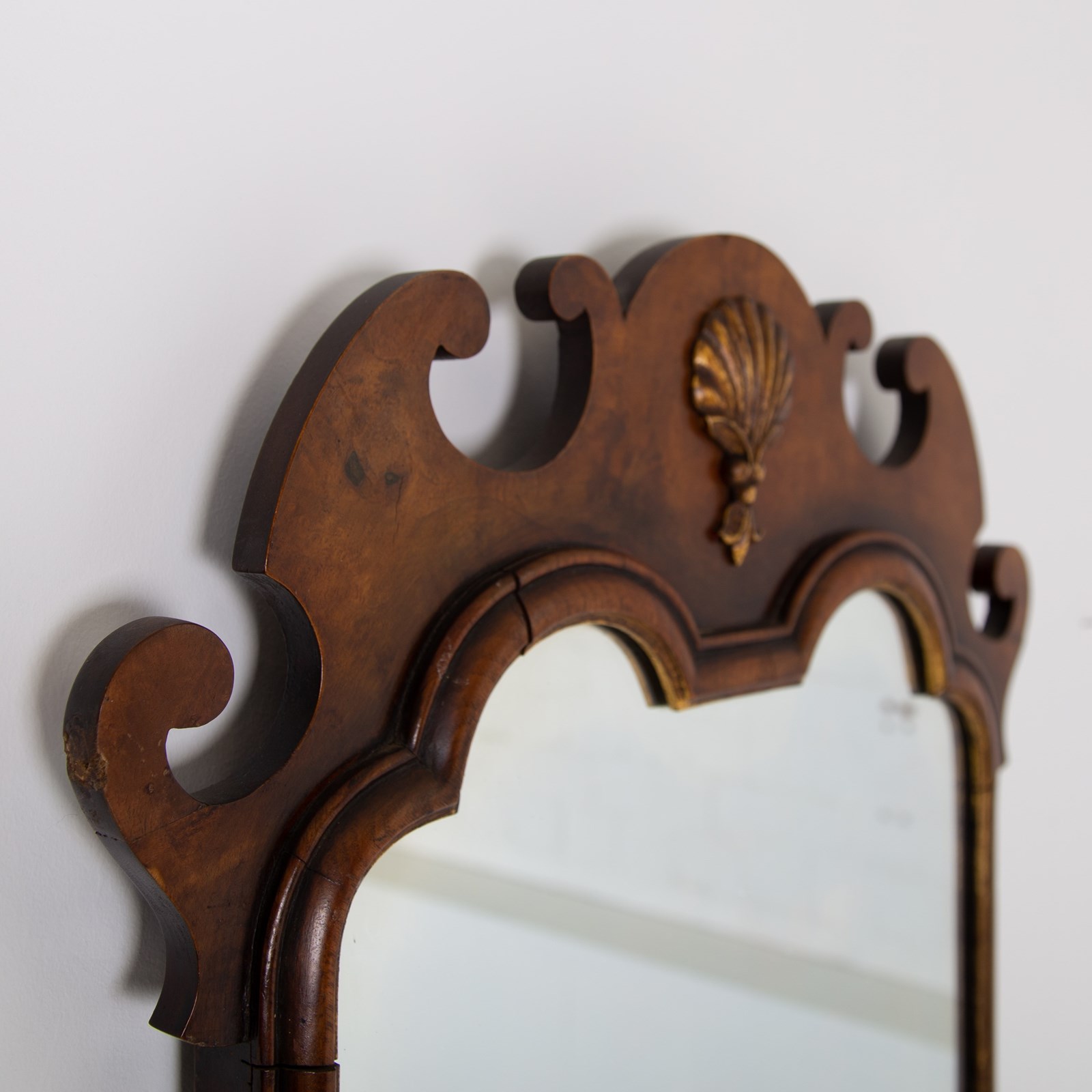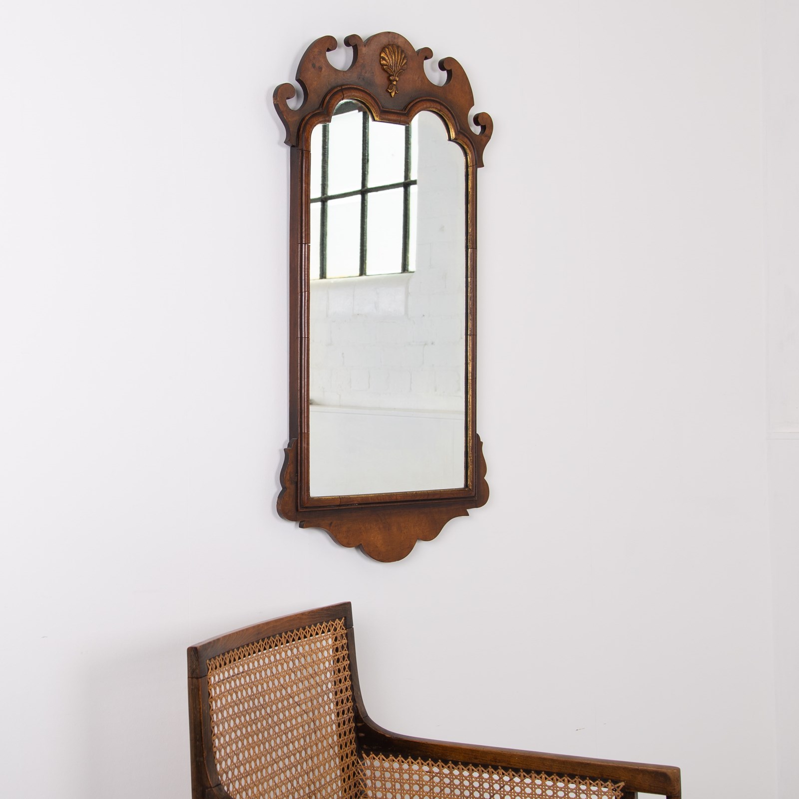 A lovely quality English walnut wall mirror of generous proportions in the Chippendale manner sitting in nice “lived in” condition. This one hangs well and works well in both a period or more modern home with its shell cartouche, inner cushion moulded gilt frame and well shaped pediment.