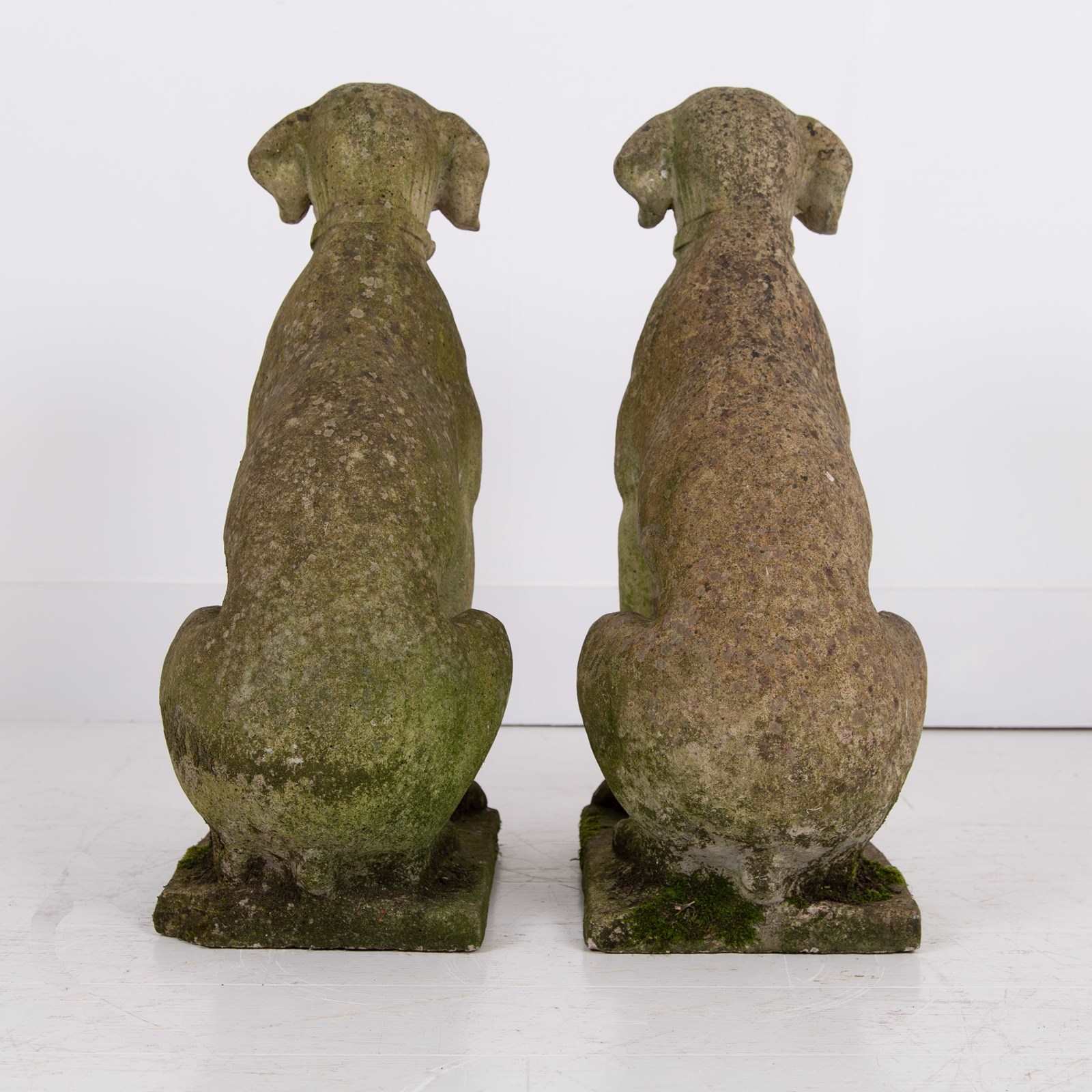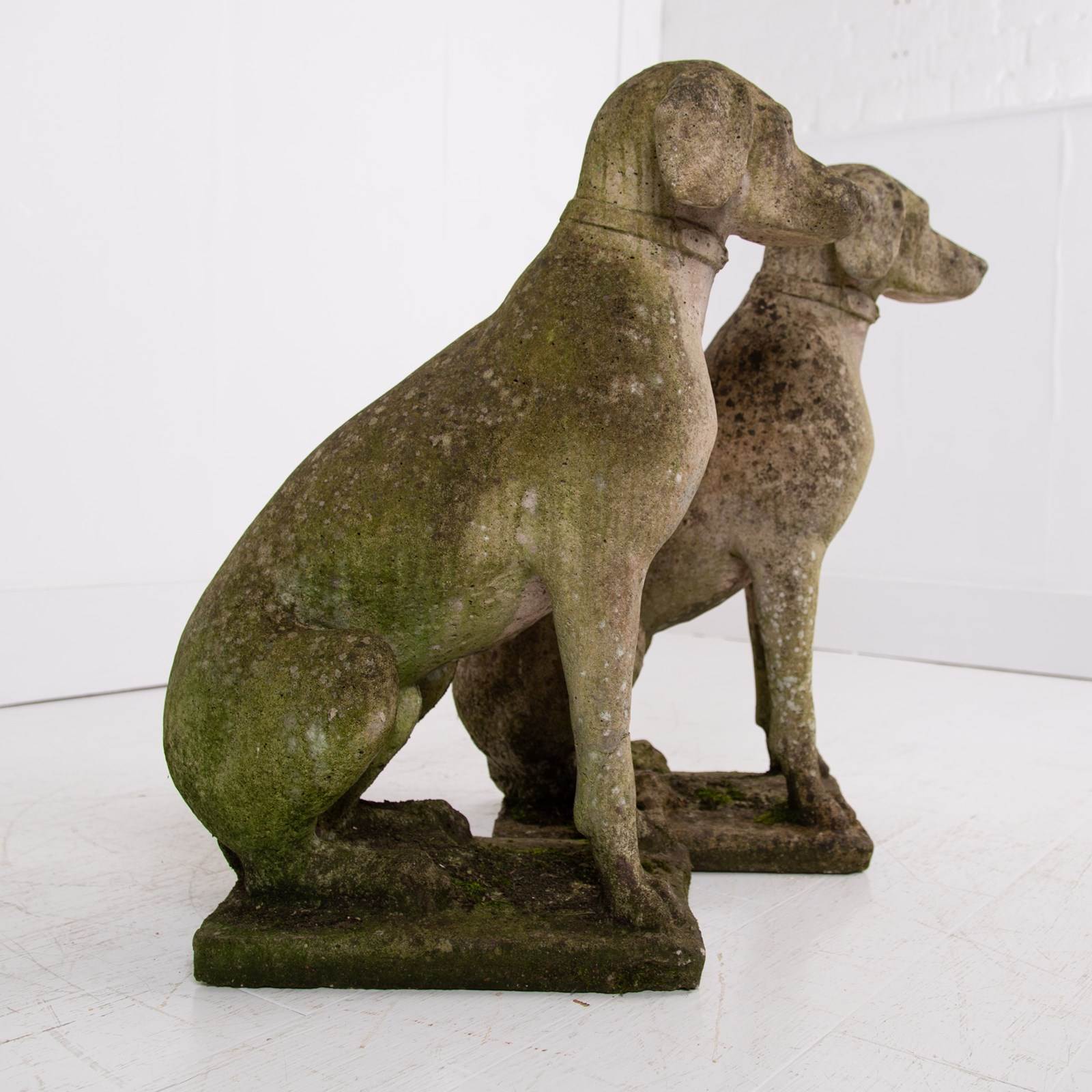 The reconstituted stone pair have charming features - just look at the snouts, the “come purchase me” eyes and those adorable paws. As mentioned we have good age colour and wear - one has an historic chip to the corner of the base. The pair sit firm and are of course heavy.