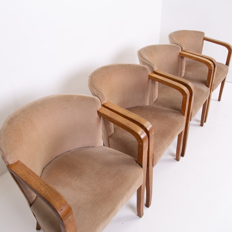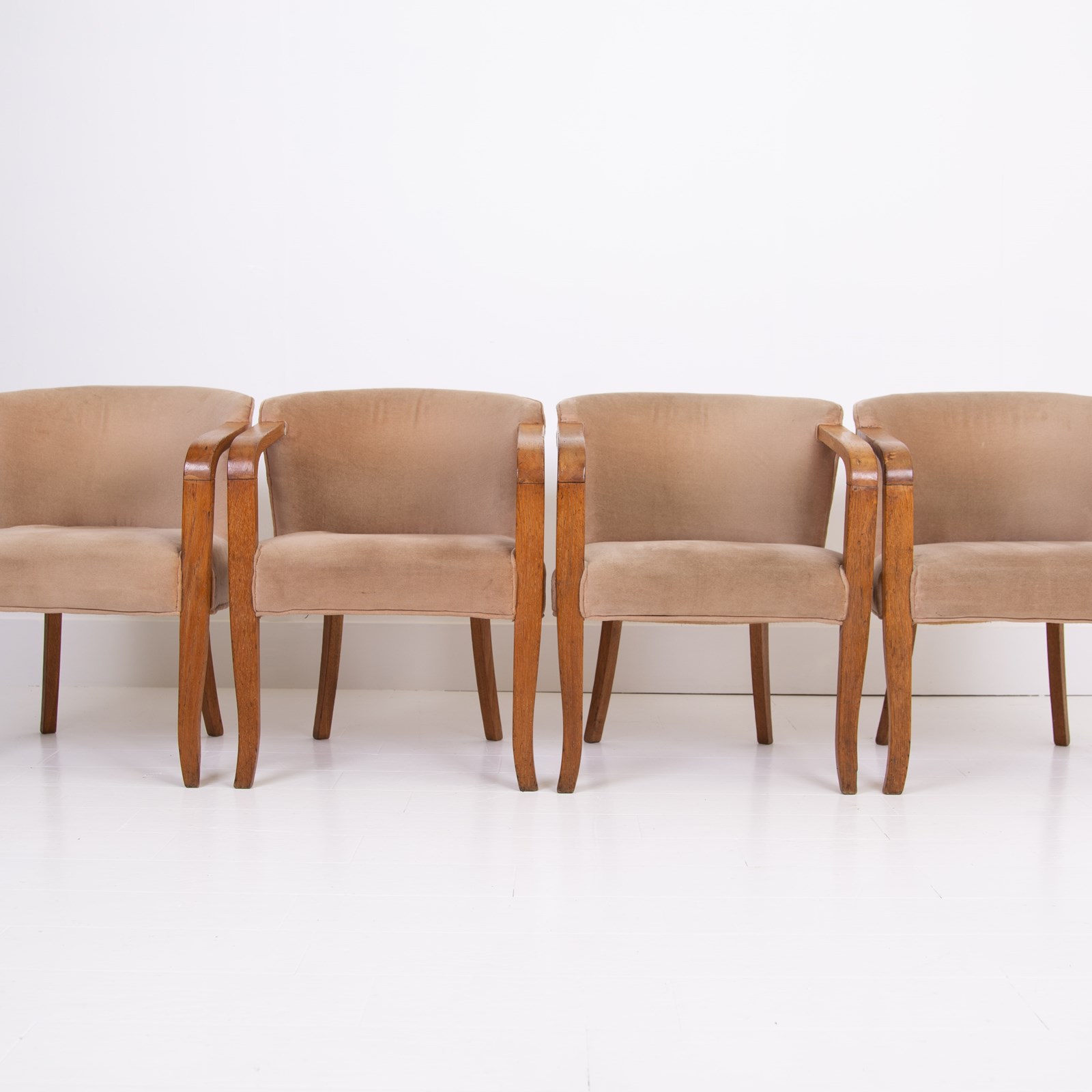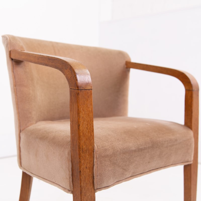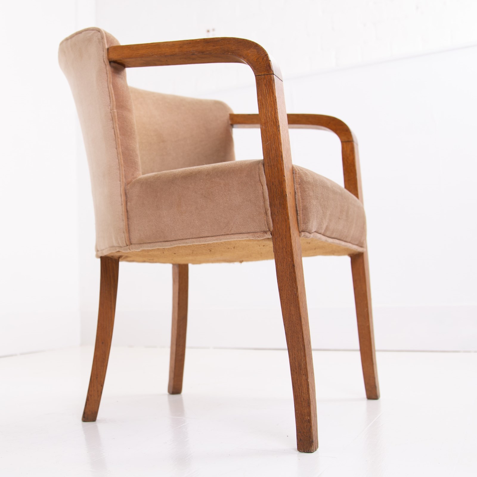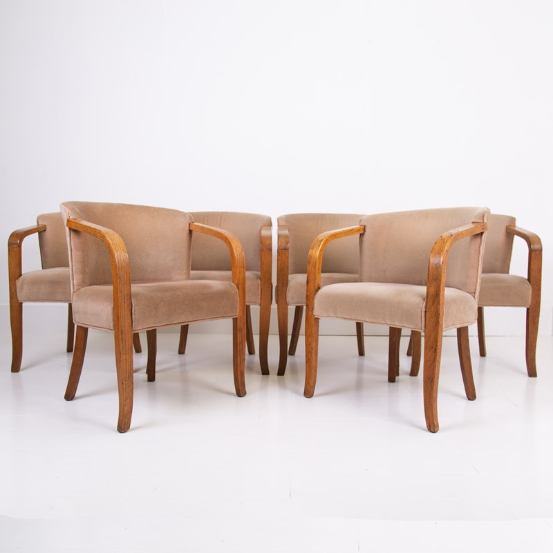 Liking the look of these a great deal and we very fortunately have 6! All have a good tone and grain to the English oak, a nice little kick to the bottom of the front legs, a wide seat and those curvy shapely arms are very much of the era. Maybe just a little hint of Deco about them as well which is not a bad thing and of good quality.