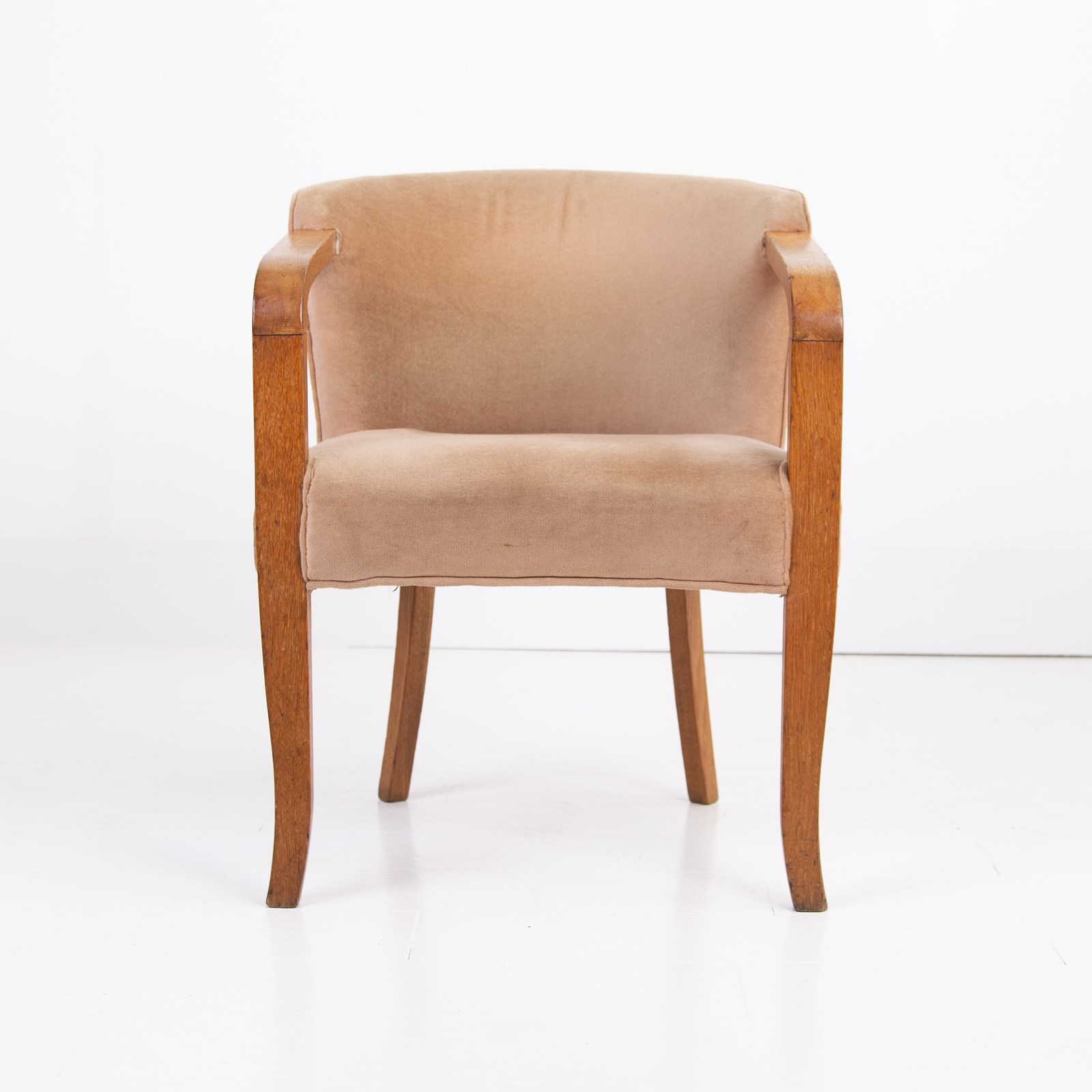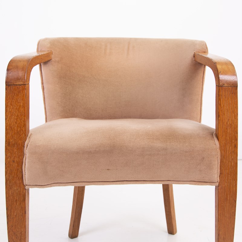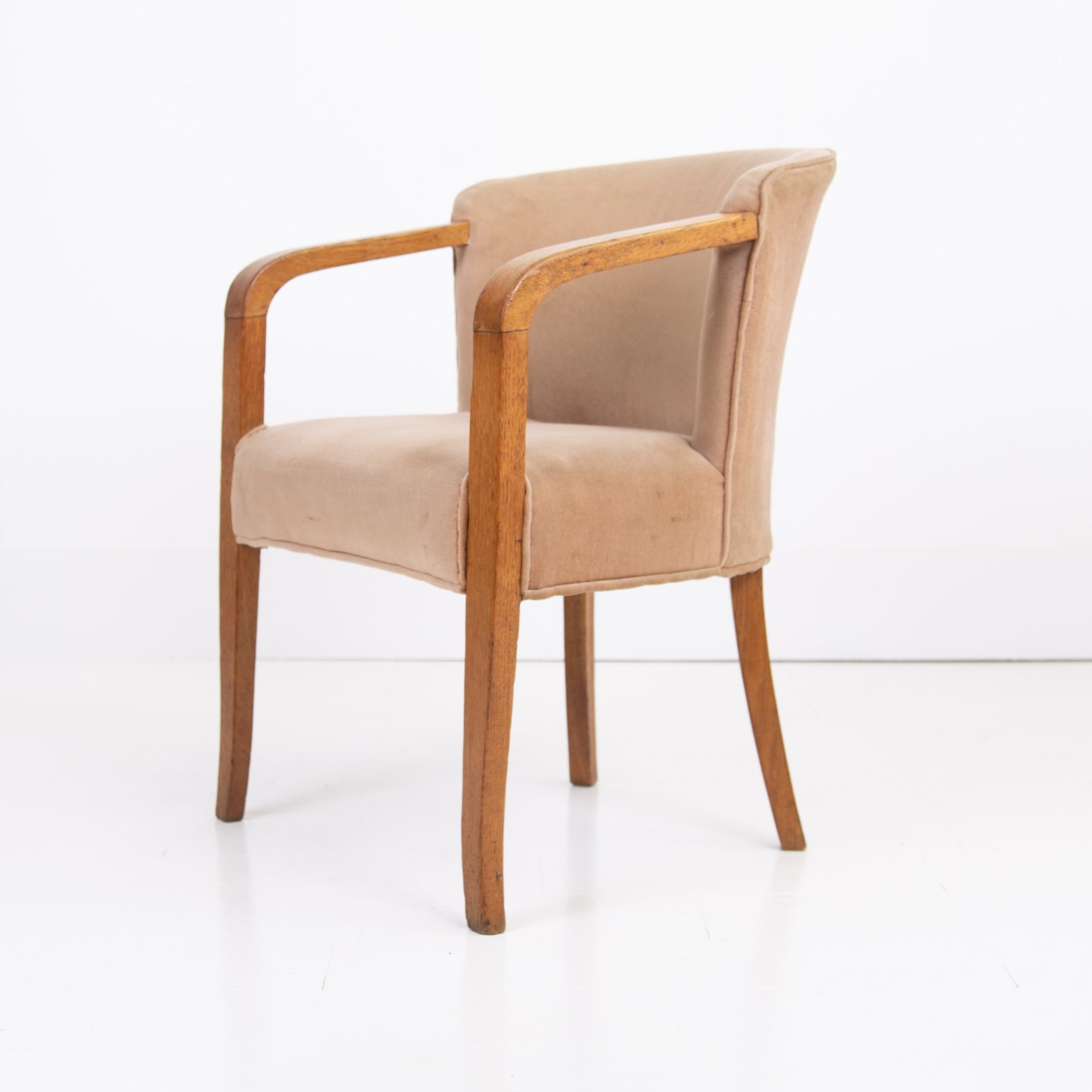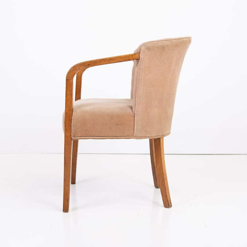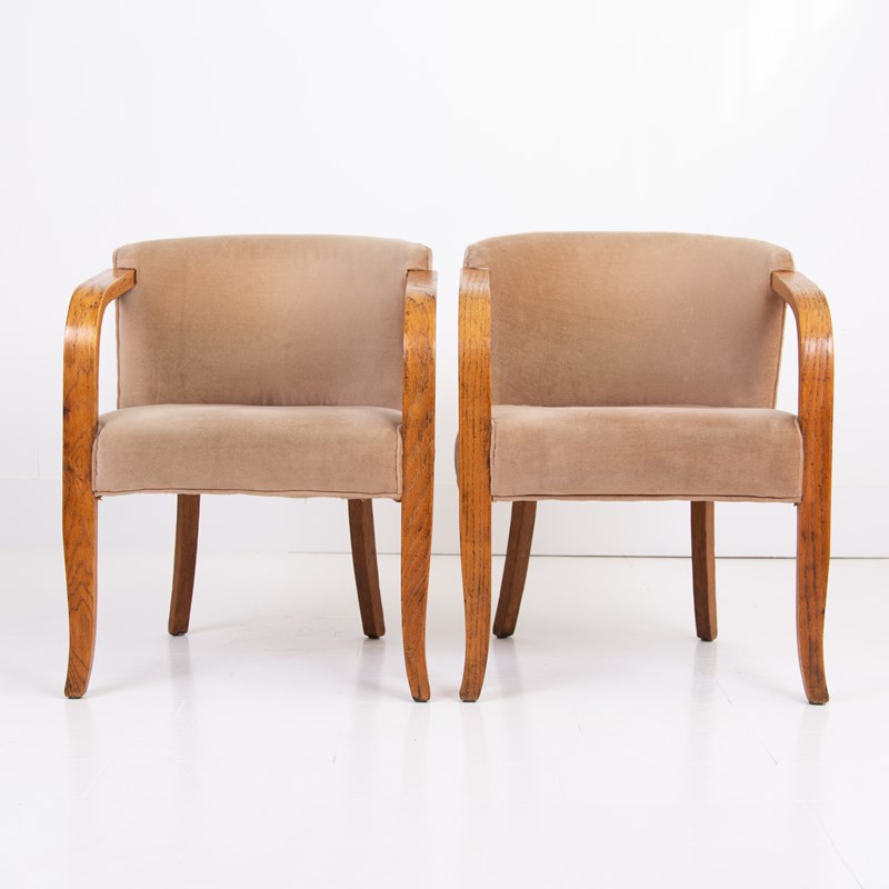 Liking the look of these a great deal and we very fortunately have 6! All have a good tone and grain to the English oak, a nice little kick to the bottom of the front legs, a wide seat and those curvy shapely arms are very much of the era. Maybe just a little hint of Deco about them as well which is not a bad thing and of good quality.