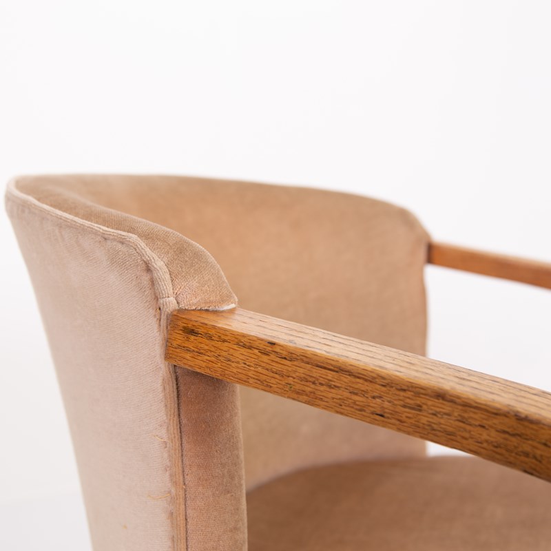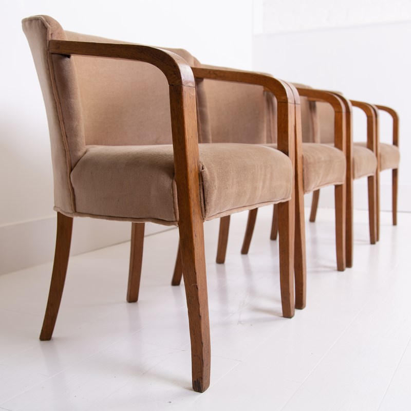 They currently sit upholstered in a beige coloured velvet which is serviceable - the odd marks, some teeny holes, seats are firm not sagging and as mentioned we have a wide berth to the seats. The oak is a golden tone with genuine day to day wear but sitting firm. Mark our upholsterer can offer reupholstery if you desire at the cost of £235 plus VAT per chair and you would require around 3 metres of fabric per chair which we can assist in sourcing with samples etc - the choice is endless. As you may have noticed two of the chairs have slightly different arms, but are the same tone and grain of oak.