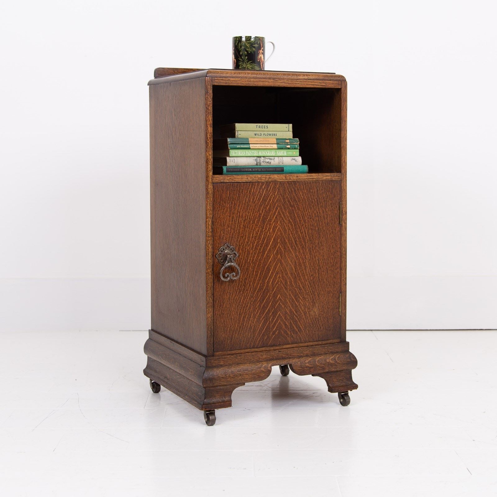 We have a good looking oak side cabinet C1930s which could be placed in the bedroom, small hallway or maybe the living room. The design is attractive on this one - we have original iron castors sitting under the ogee style bracket feet on which a single cupboard sits with an open space above this, with the top having a small upstand. The cabinet also benefits from a glass top if required…