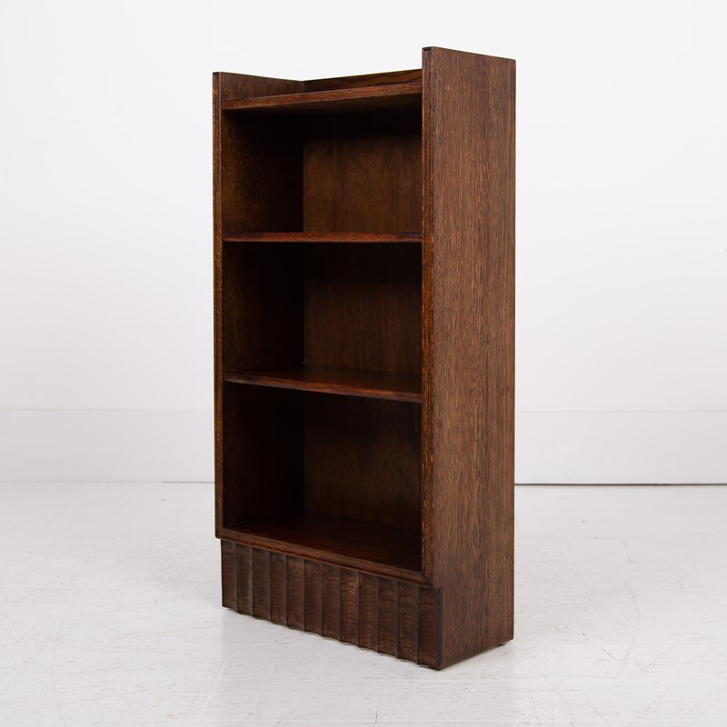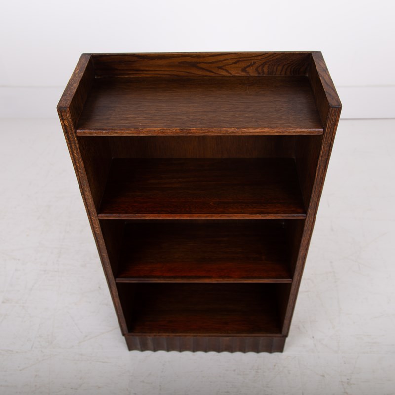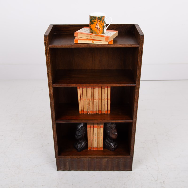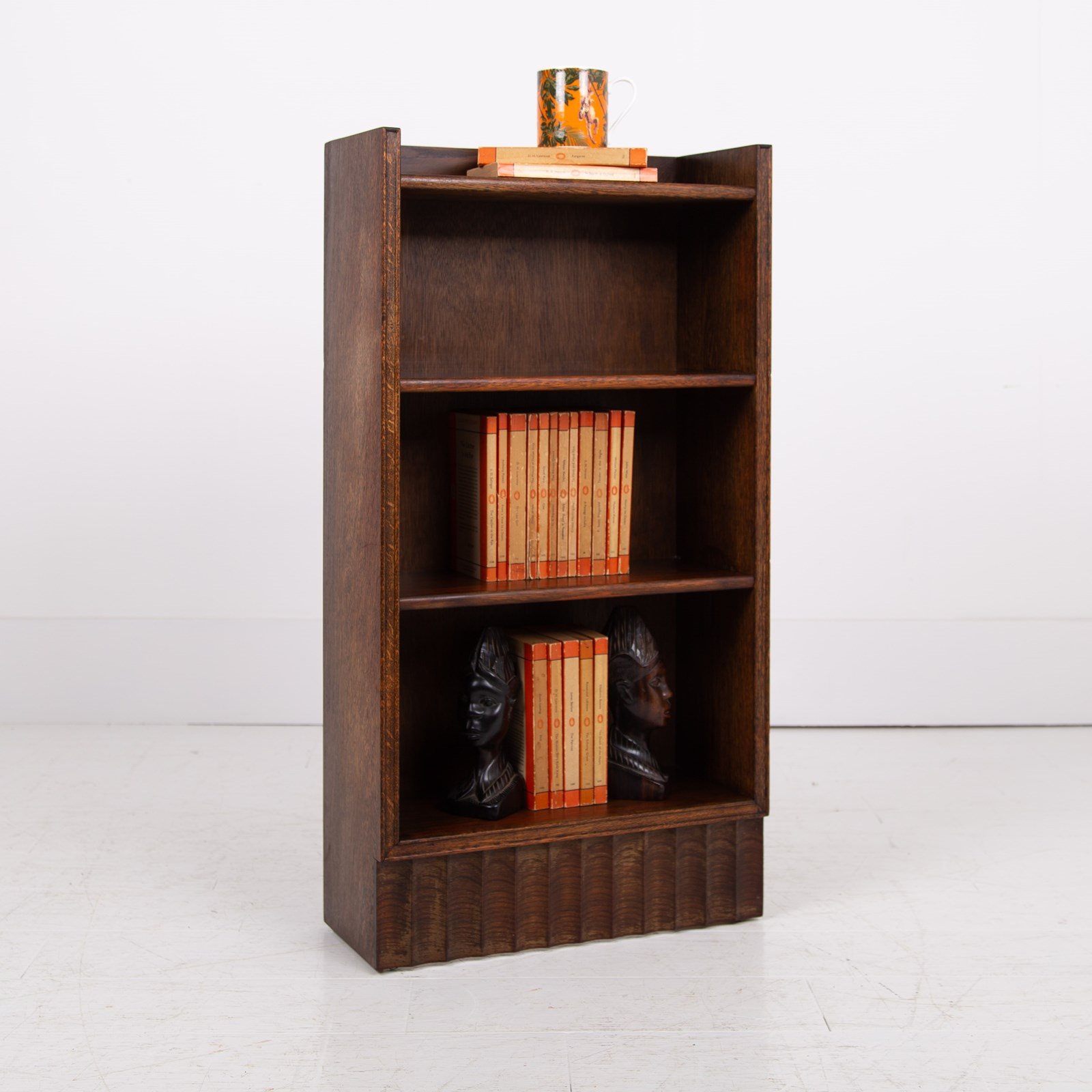 A rather delightful English solid oak open bookcase with fixed shelves of smaller proportions than most with its attractive fluted base and moulding to the edges. The bookcase is in lovely condition with light historic marks and its workshop paper label to the rear.