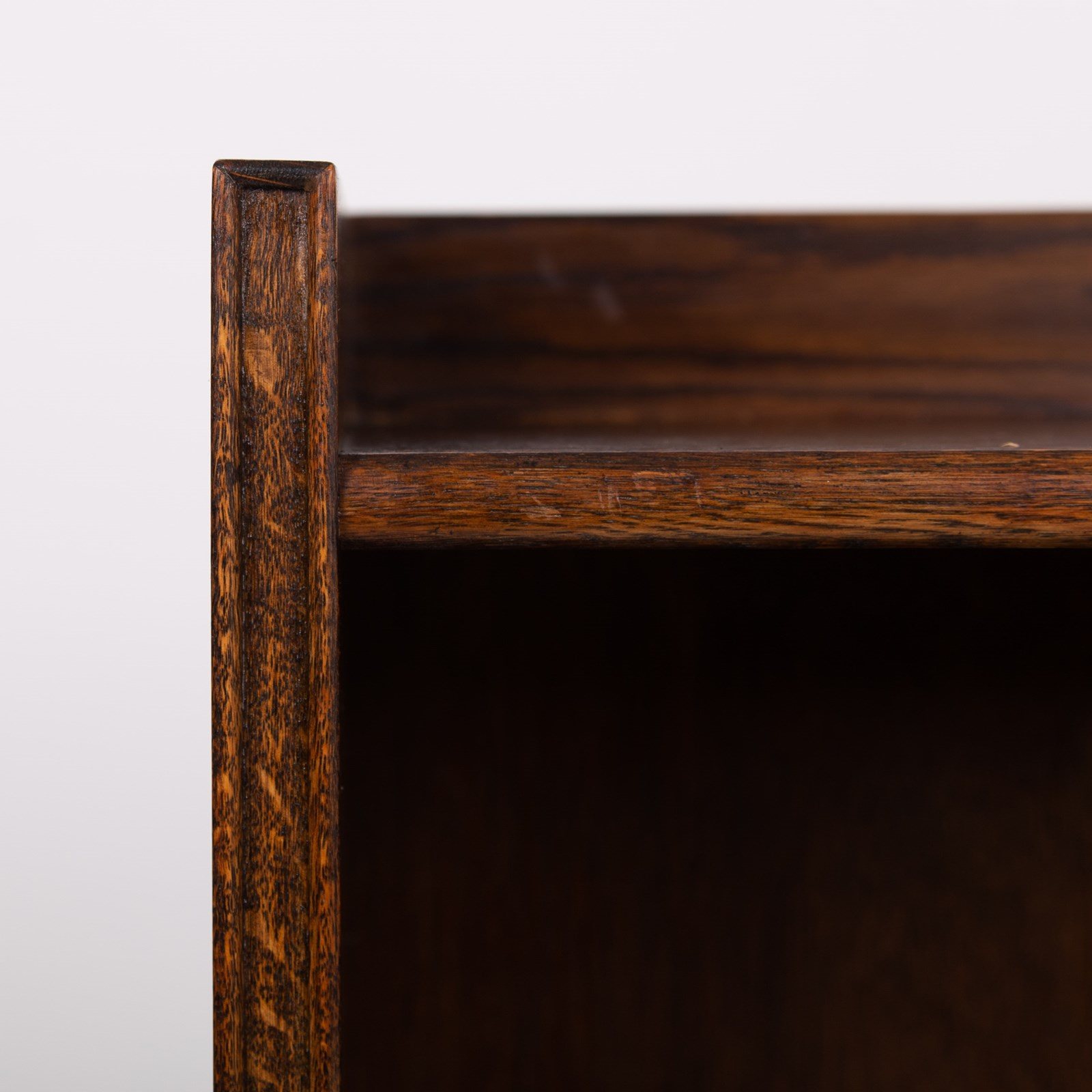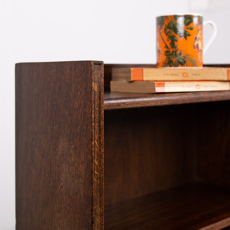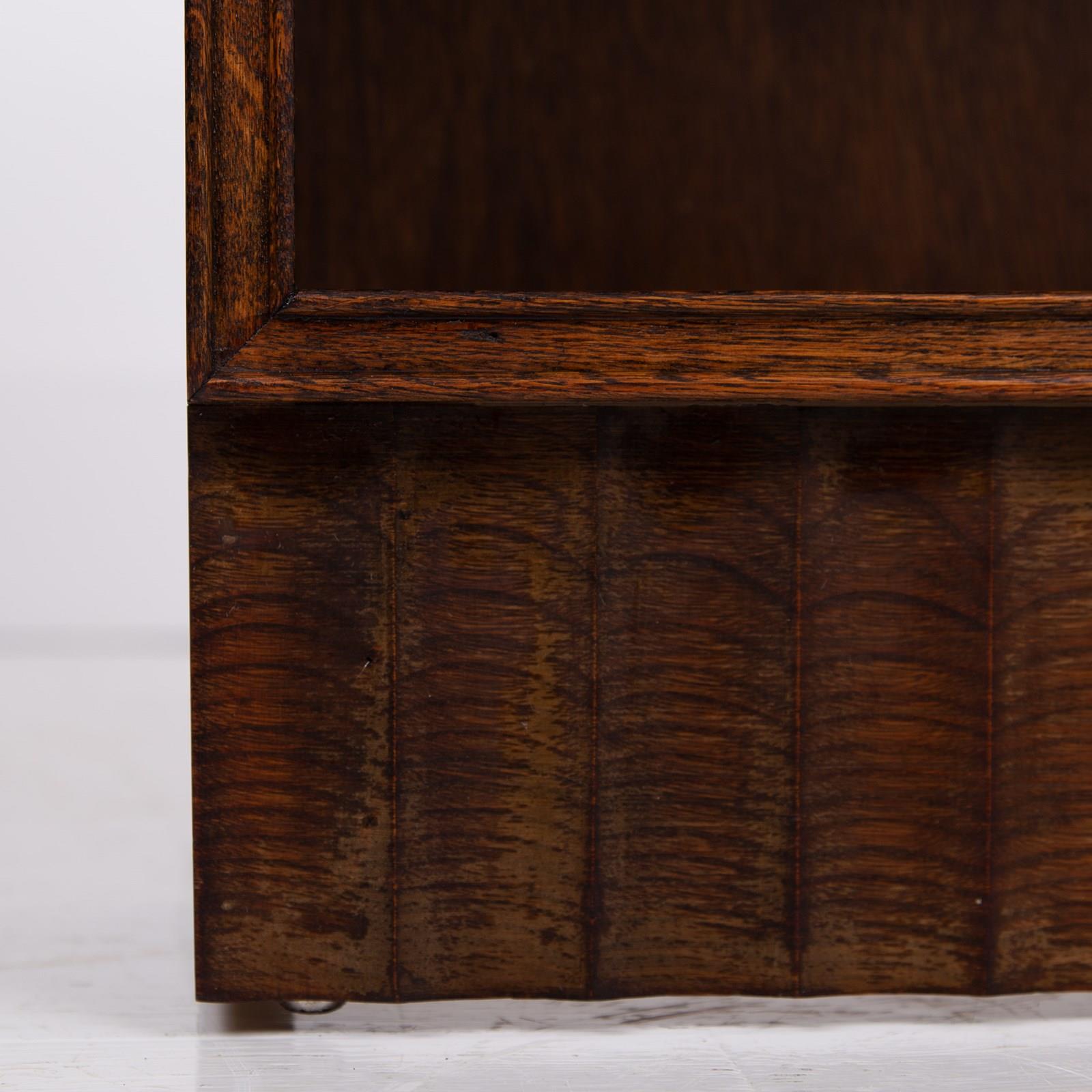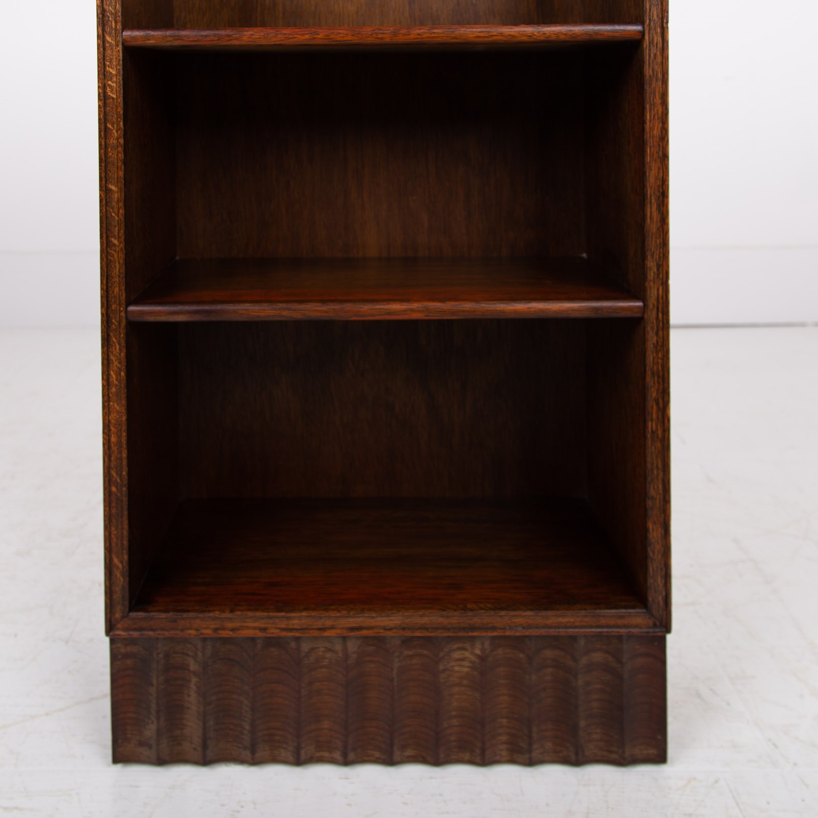 A rather delightful English solid oak open bookcase with fixed shelves of smaller proportions than most with its attractive fluted base and moulding to the edges. The bookcase is in lovely condition with light historic marks and its workshop paper label to the rear.