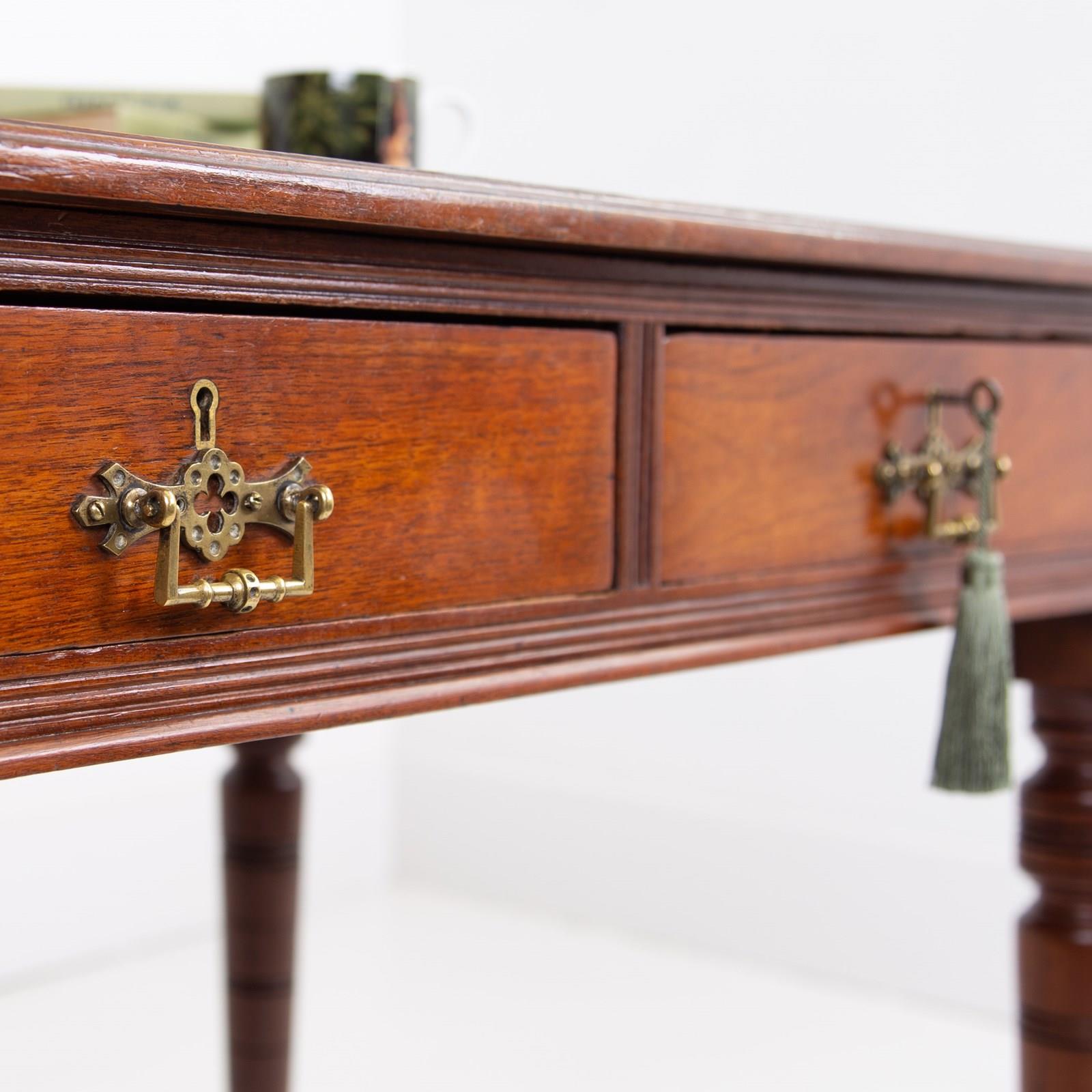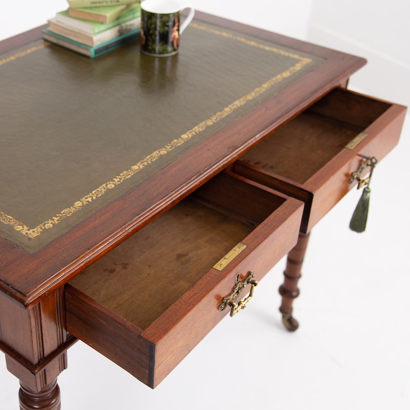 As mentioned this one is smaller in scale than most but still offers a good working surface with the inset of olive coloured, edge tooled leathered and a pair of useful well sized drawers with working lock and key - if you care to hide a secret or two…