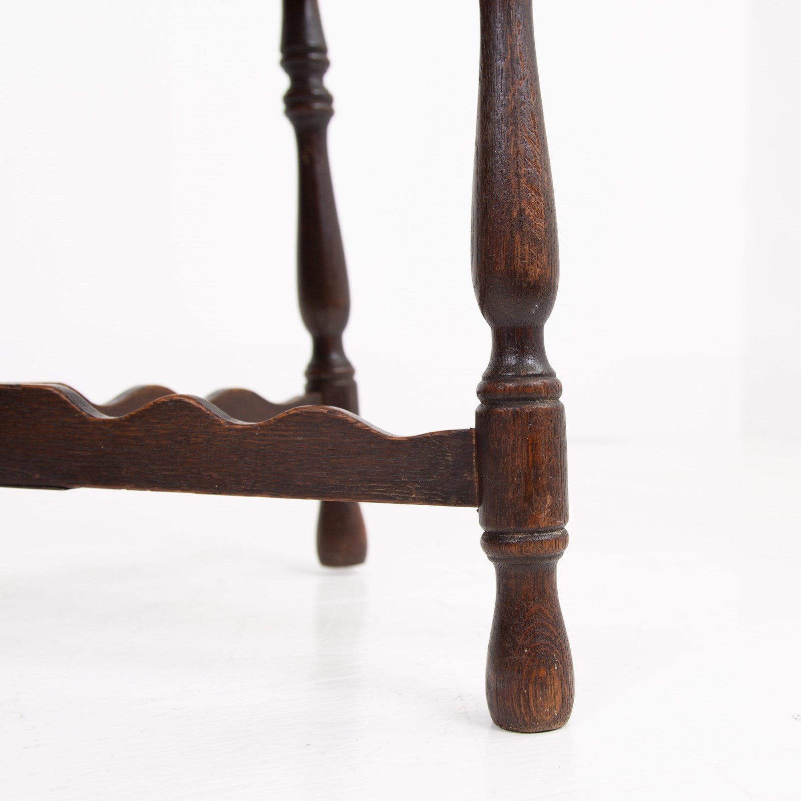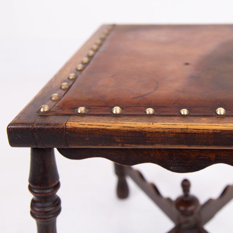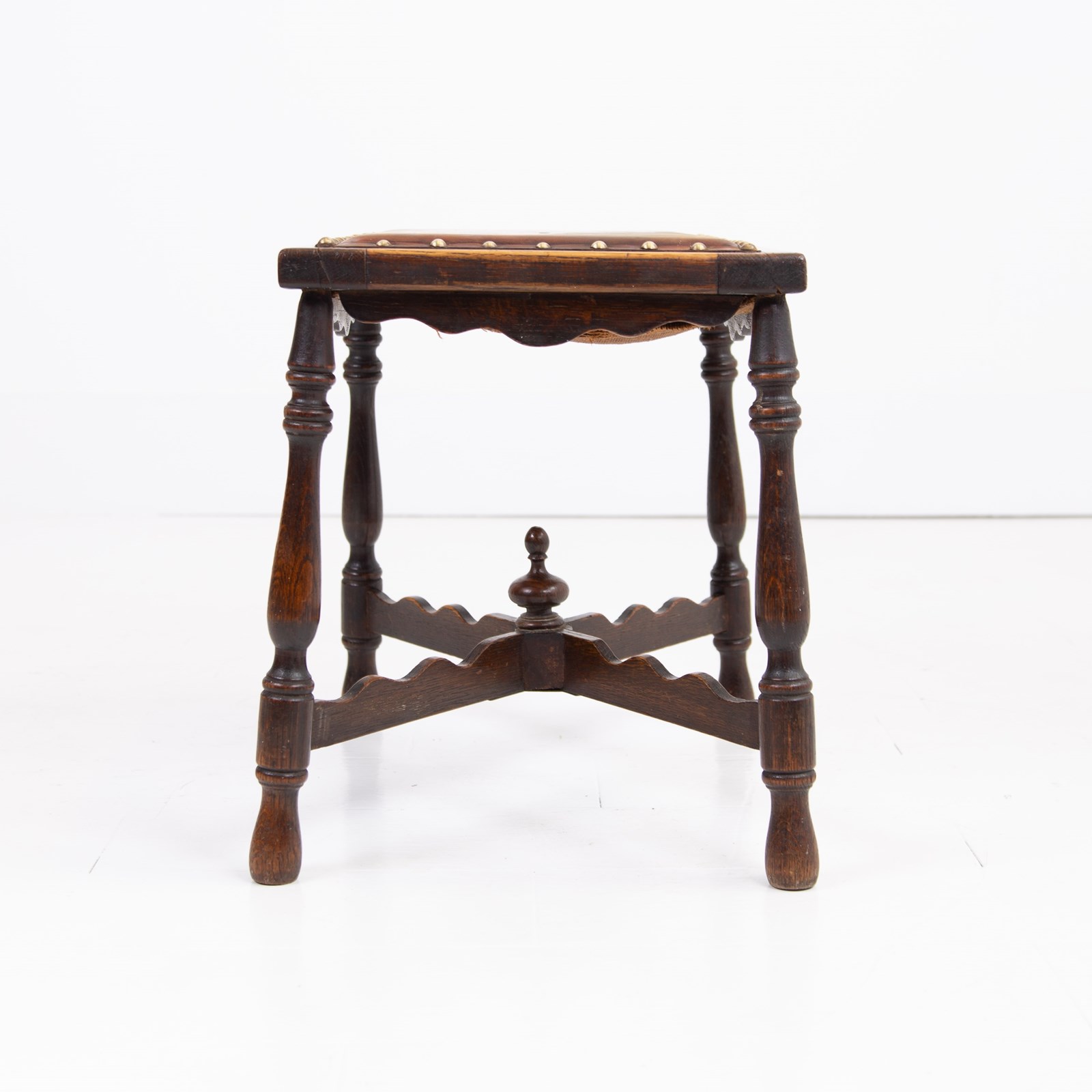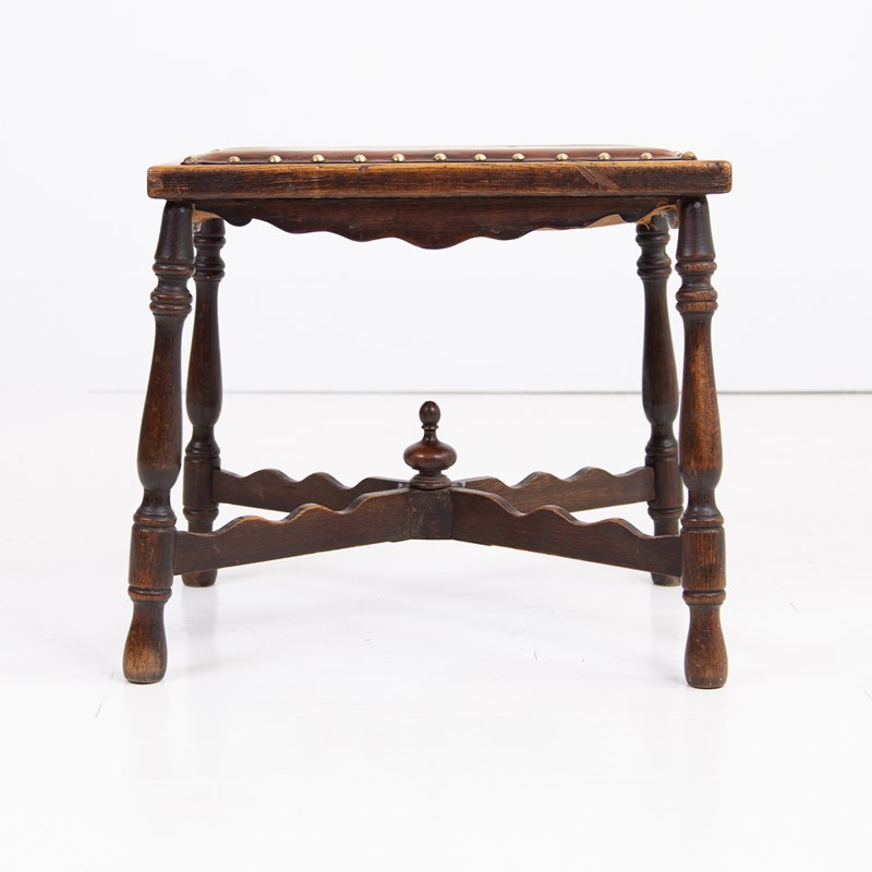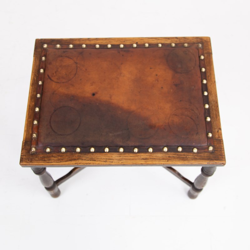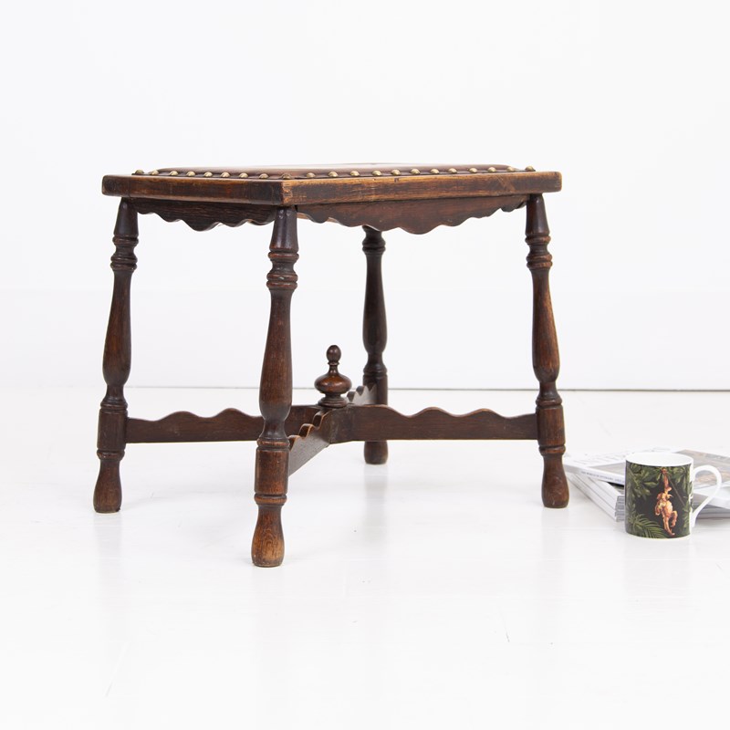 It's without doubt a lovely and charming little leather topped footstool with its turned oak splayed legs and pleasing on the eye stance.