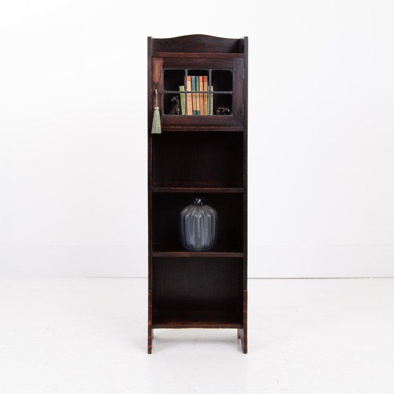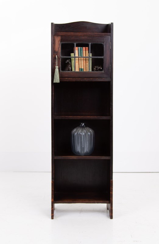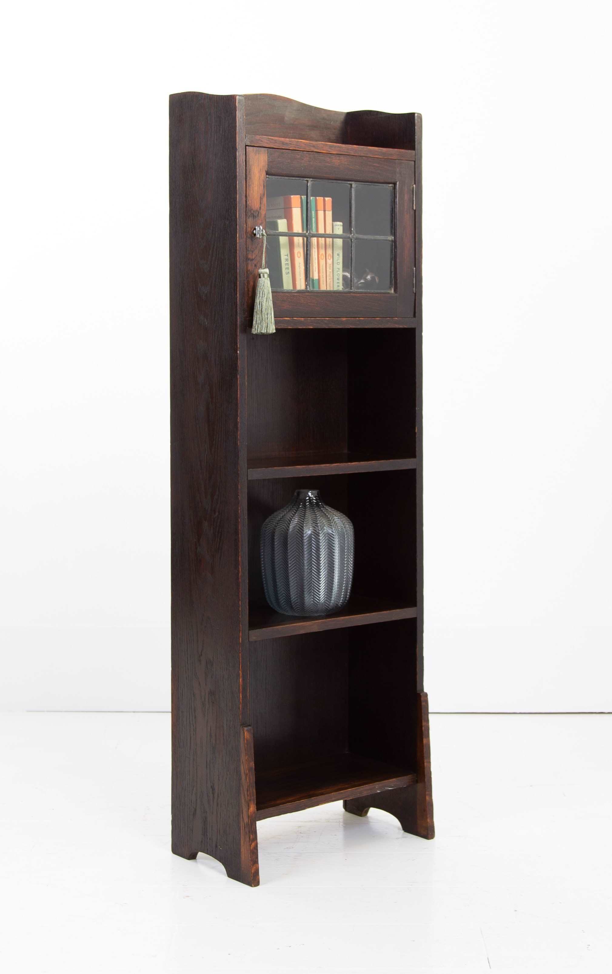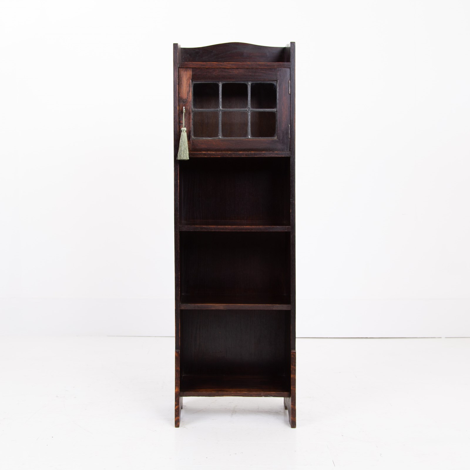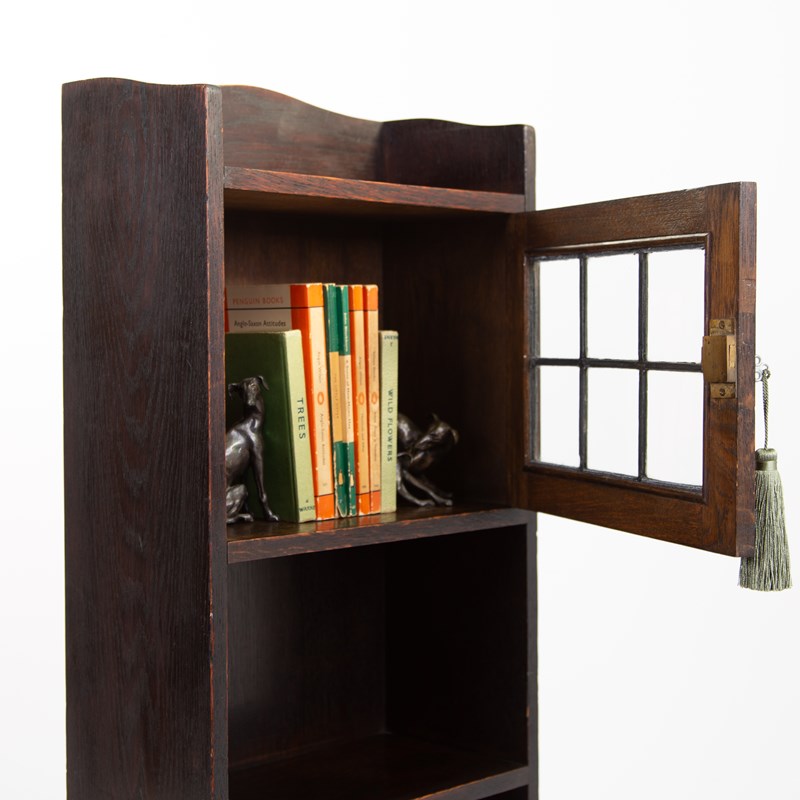 Liking this Liberty piece - it's of a lovely scale and super simple design C1910 with the Liberty London label to the back of the cabinet. It is of a smaller, very placeable scale having an oak open bookcase with leaded glazed cupboard above, lockable with open shelves below and simple shaped feet.