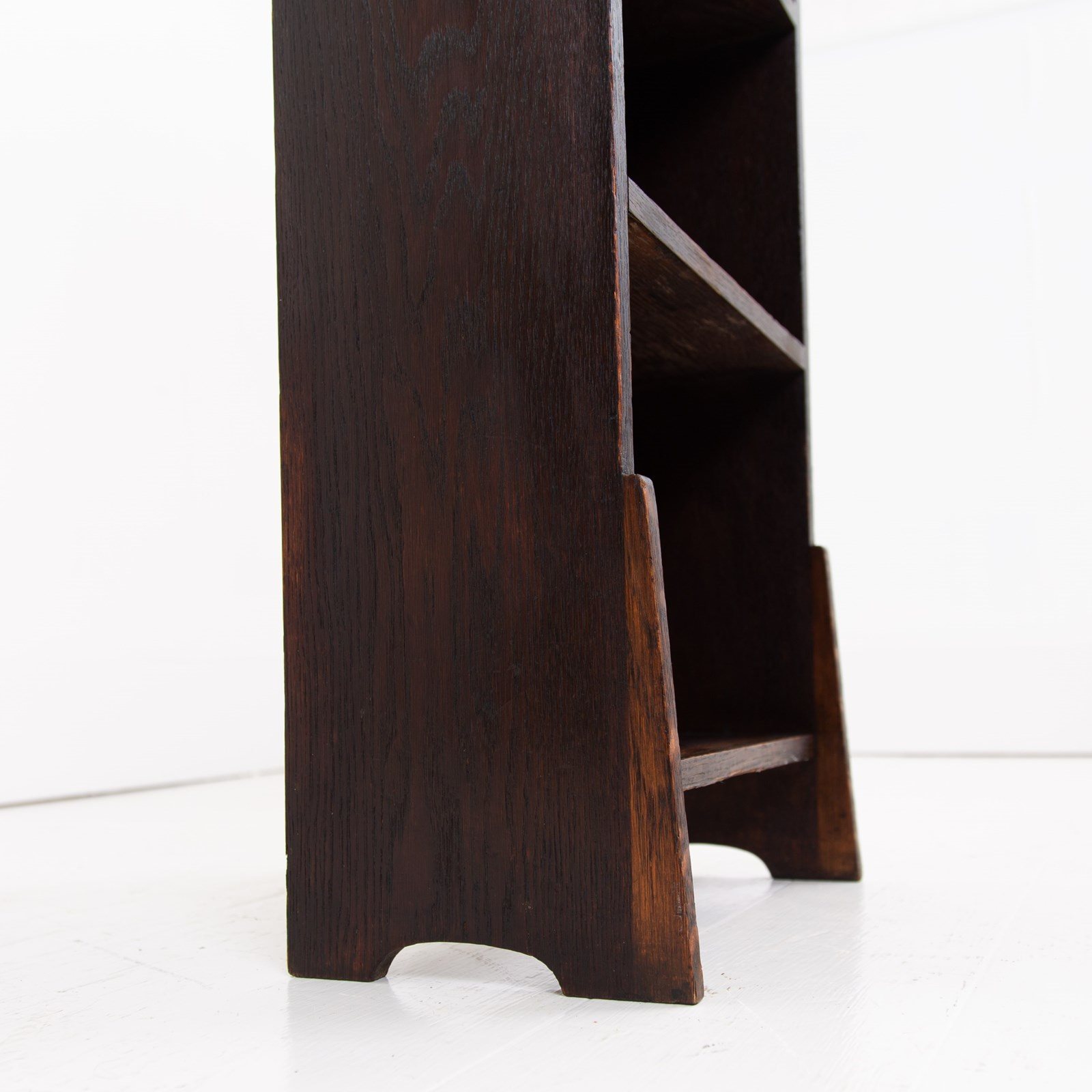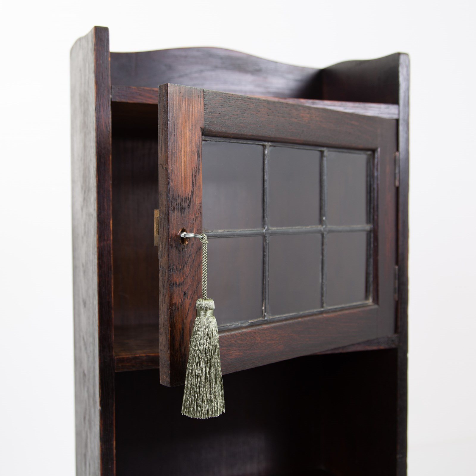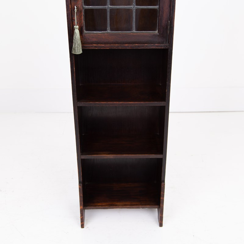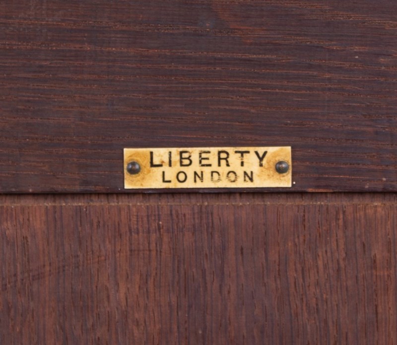 Liking this Liberty piece - it's of a lovely scale and super simple design C1910 with the Liberty London label to the back of the cabinet. It is of a smaller, very placeable scale having an oak open bookcase with leaded glazed cupboard above, lockable with open shelves below and simple shaped feet.