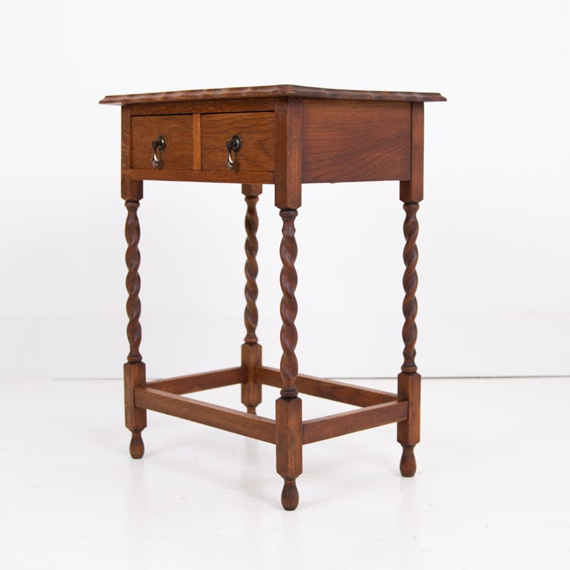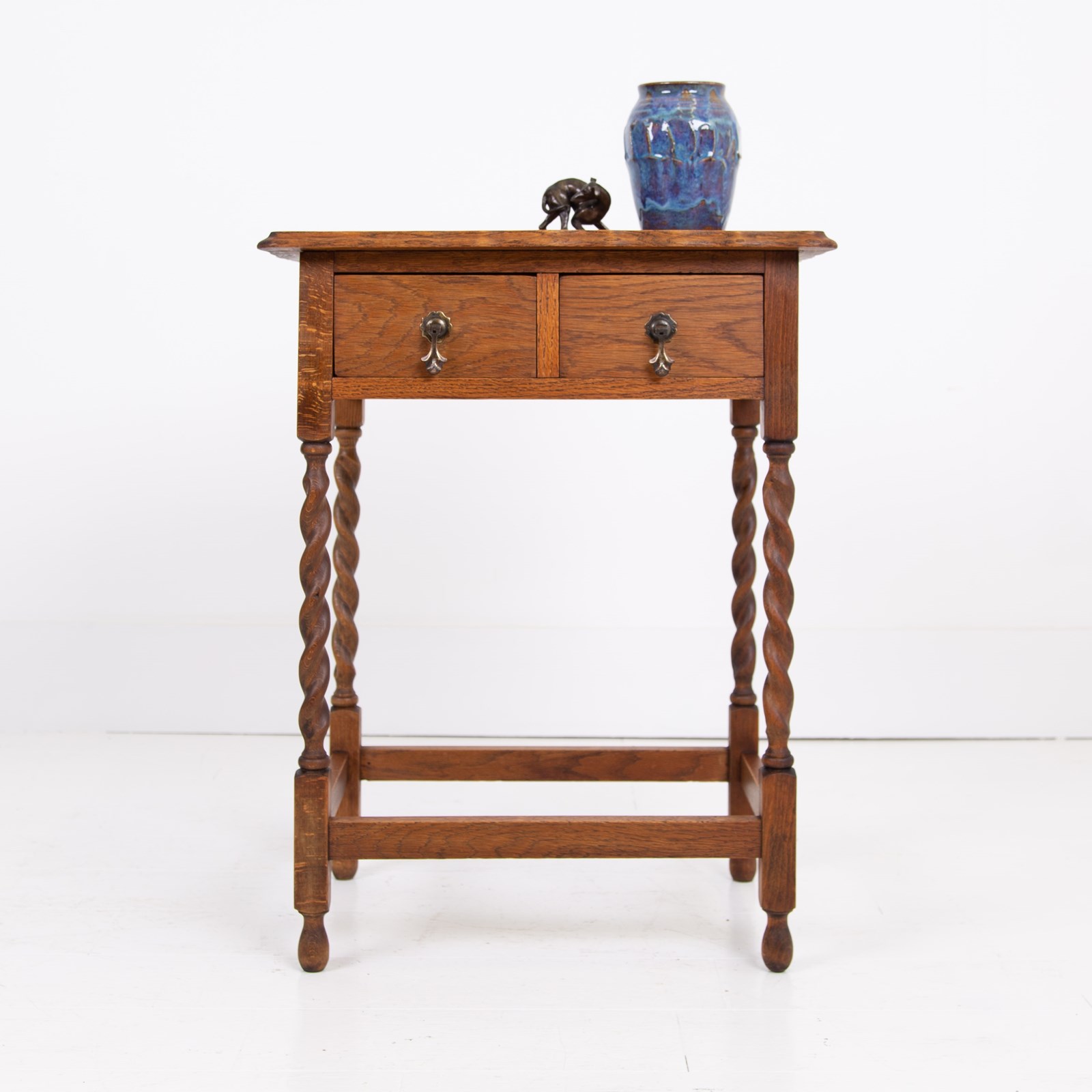 A rather lovely 2 drawer English oak table of smaller proportions than most and surprisingly heavy for its size. We have 2 deep drawers with solid brass drop knobs sitting on oak barley twist legs with a pie crust top.