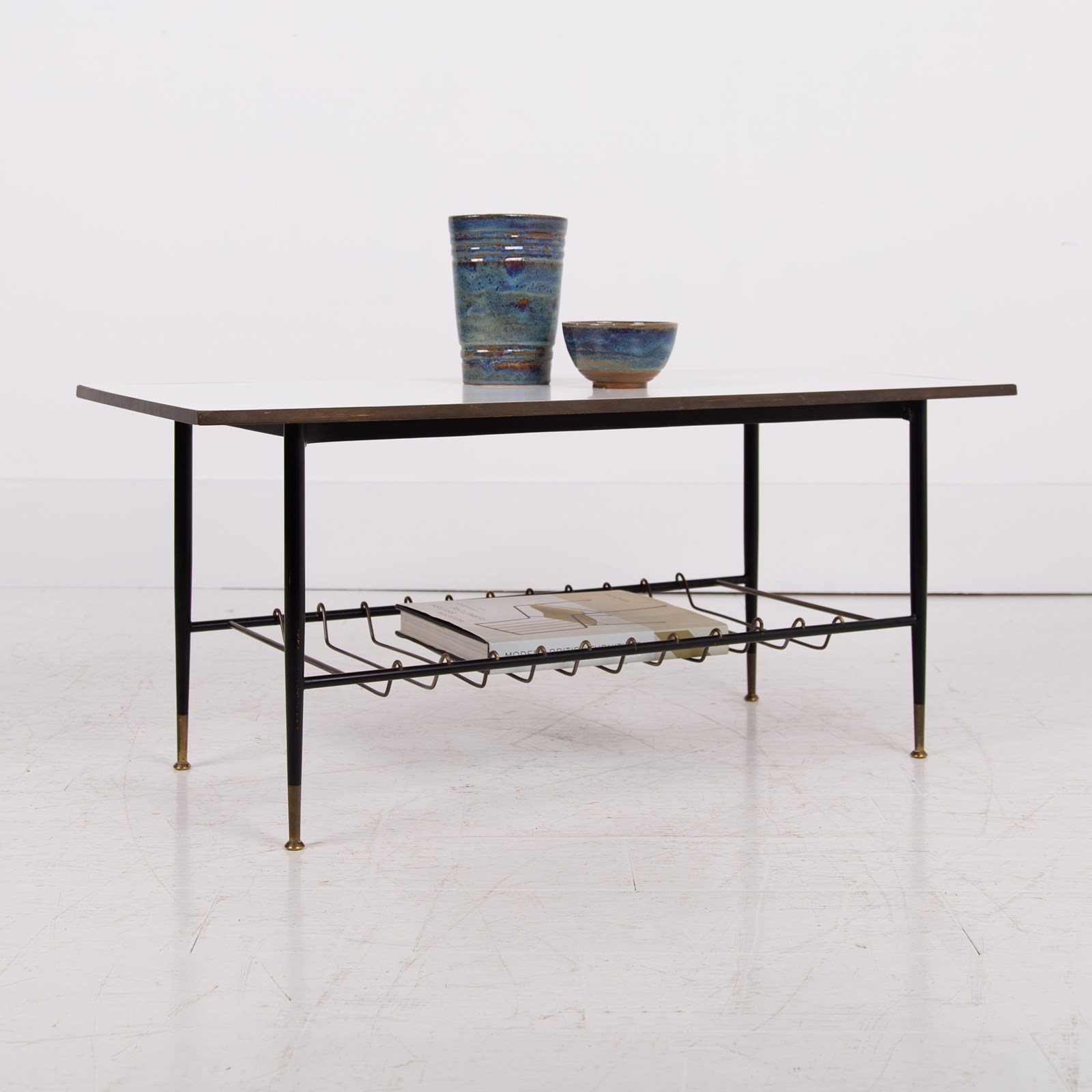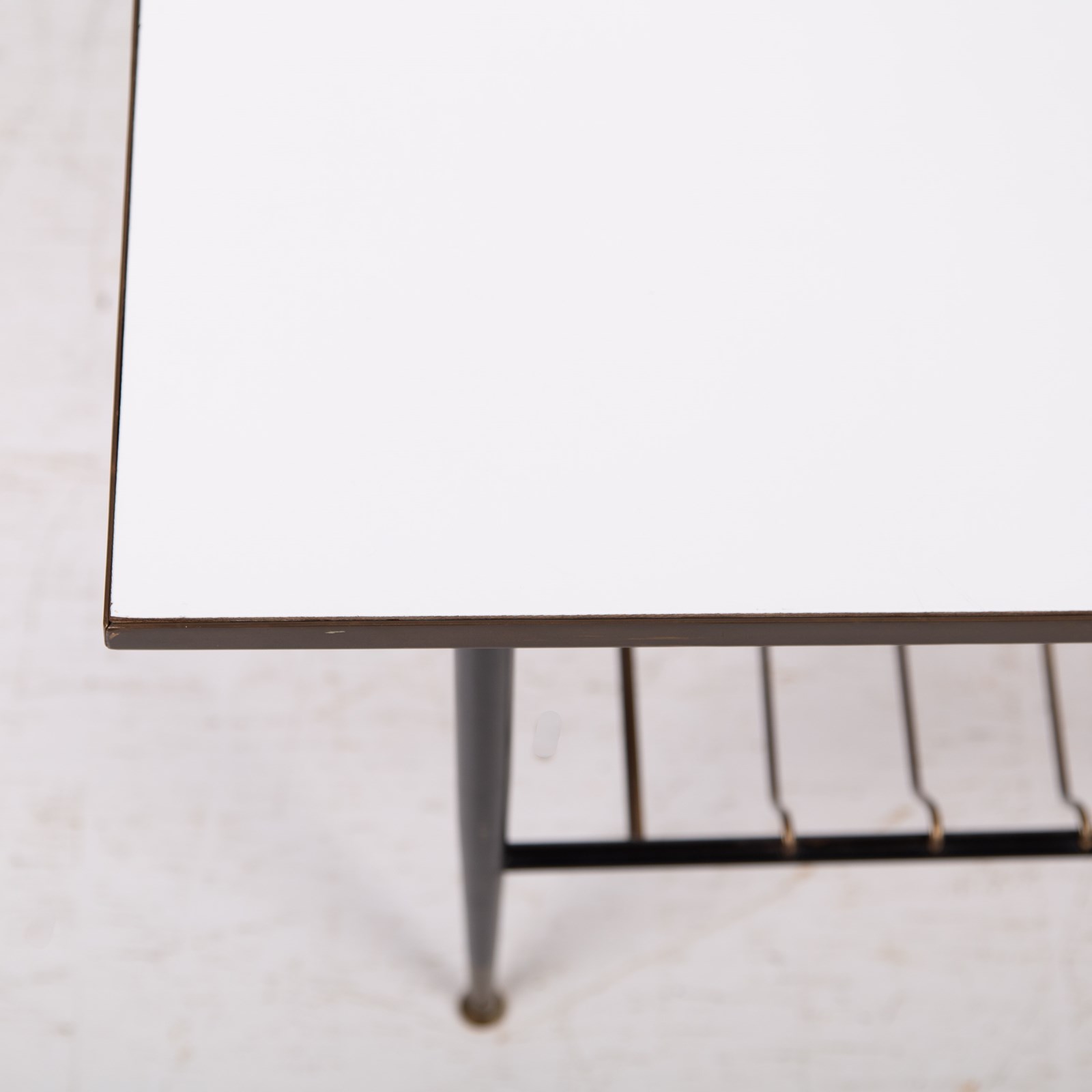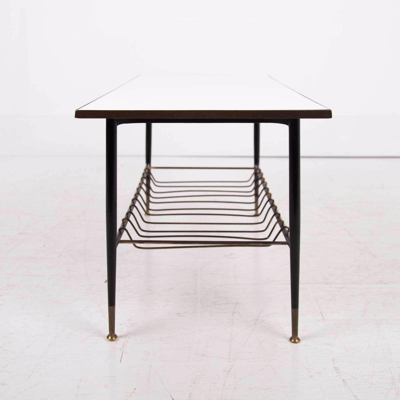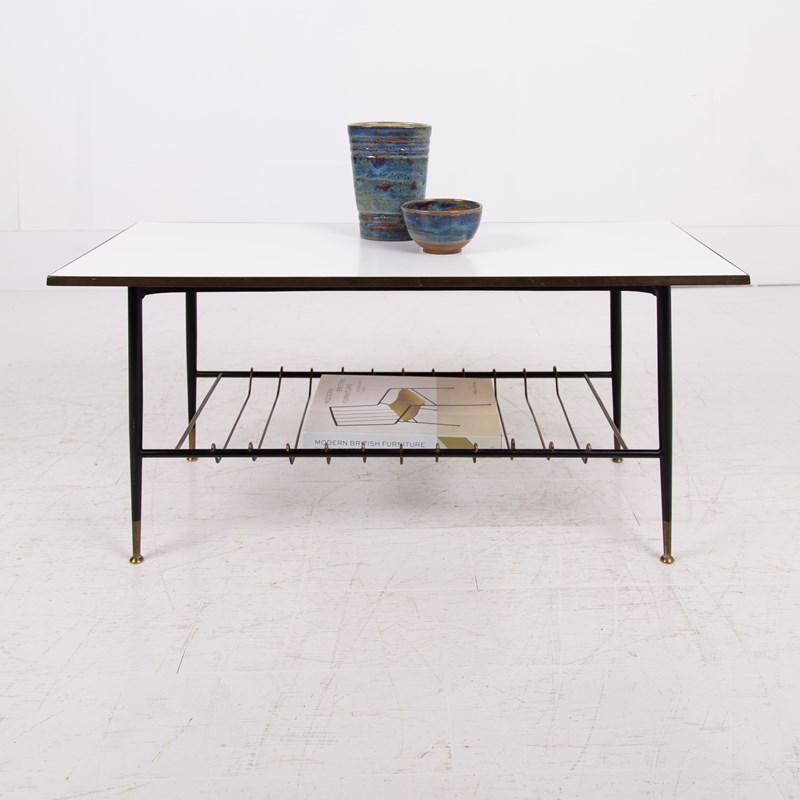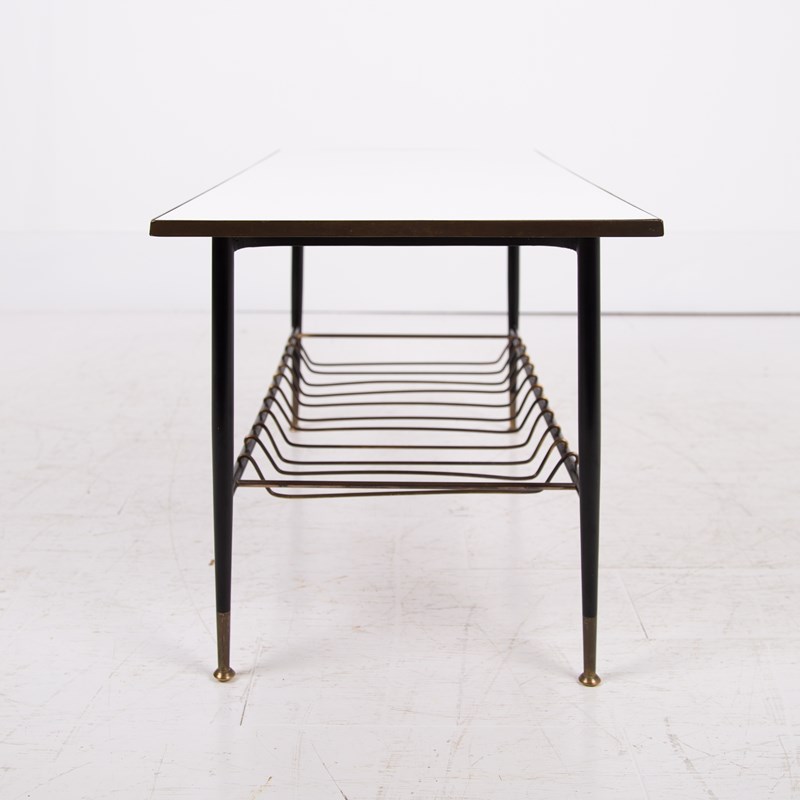 An extremely stylish and rare vintage coffee/side table of super quality. This one dates from the 1960-70’s and is beautifully made from brass, with its white Formica top and brass magazine rack underneath. The frame is solid brass with black legs with the feet caps in natural solid brass finish and are nicely tarnished. This one is in a rather excellent condition for its age with light day to day marks. The quality is truly evident throughout.