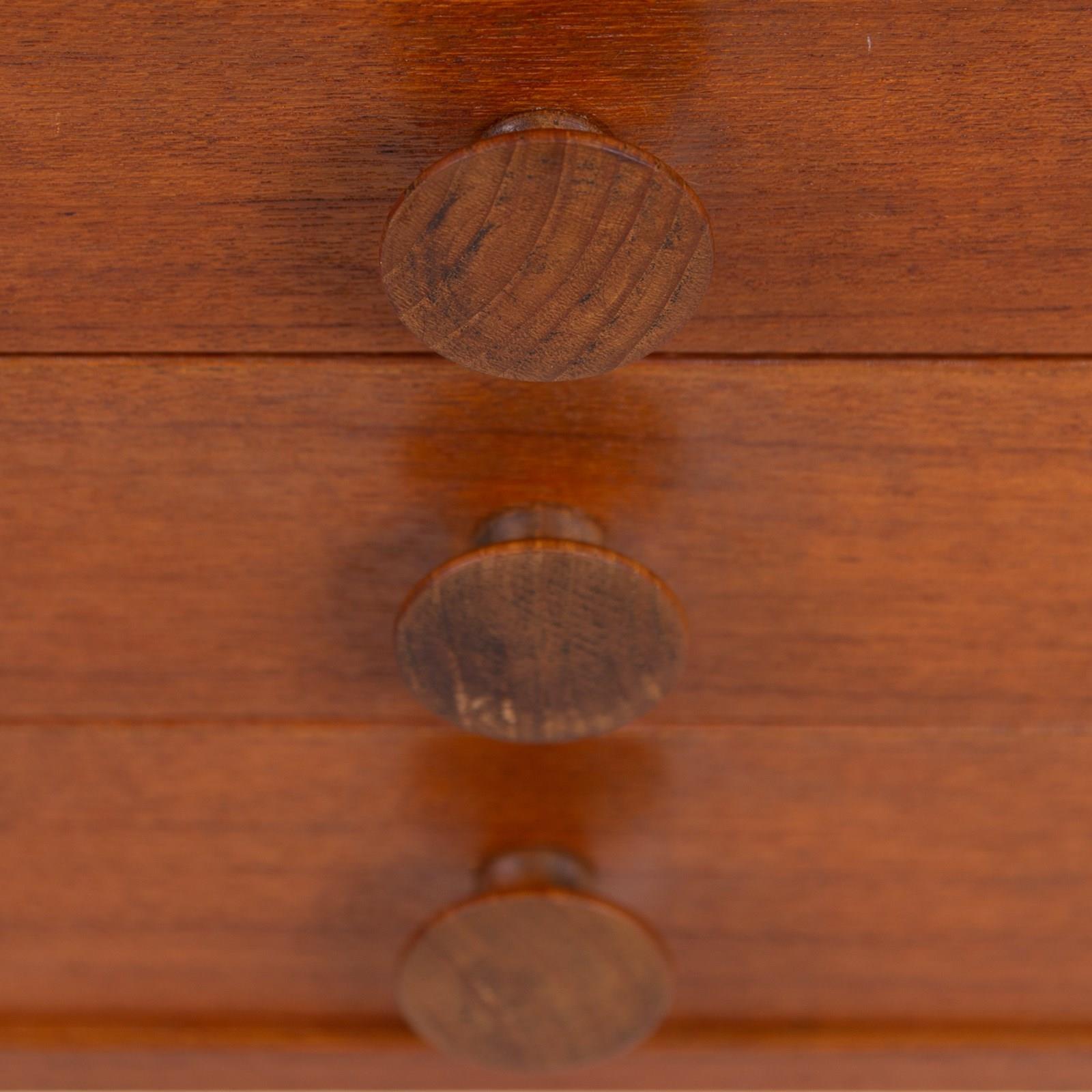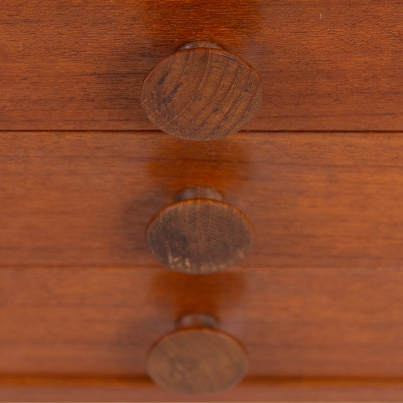 The condition is good with no splits, flakes or cracks to the afromisa or teak veneer. All drawers are running well and have been cleaned inside with just some faint ink marks, as mentioned a working lock and key is present. The top is aged marked but nothing fresh or nasty.