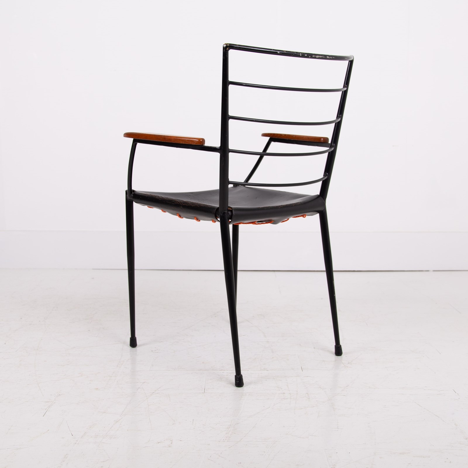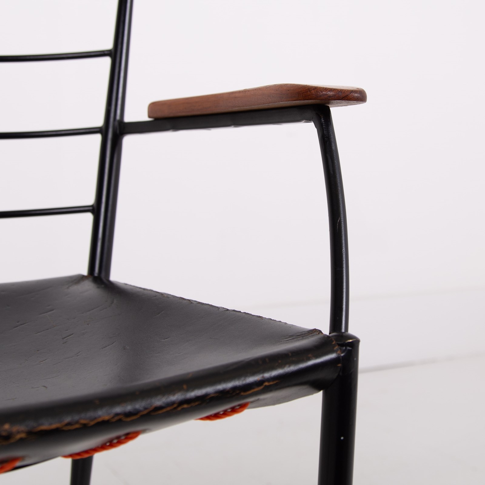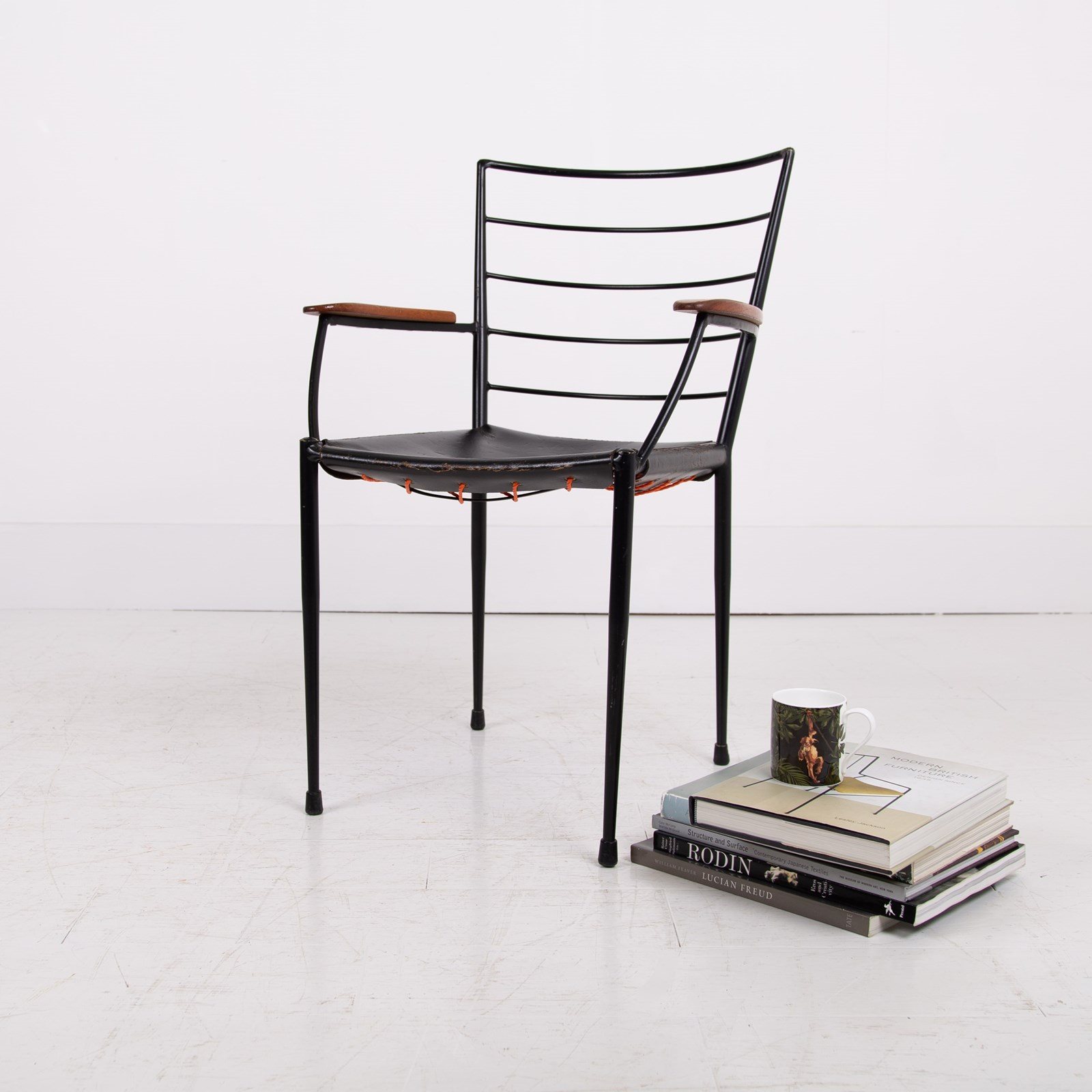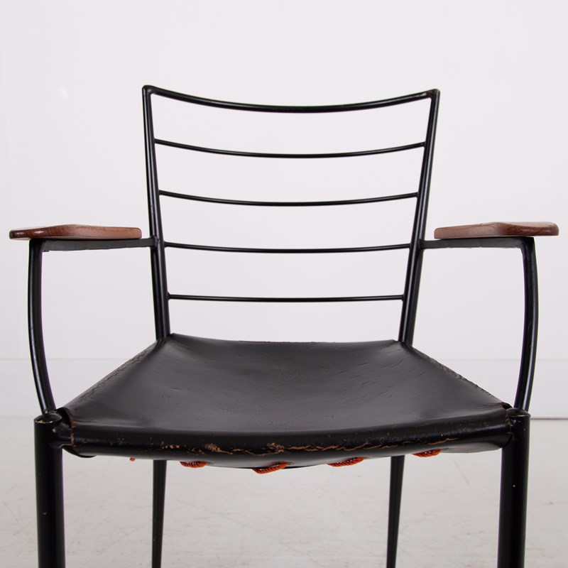 The chair which I am sure you know was designed in the 1960s by designer Robert Heal to compliment the Staples Ladderax storage system. The leather is held in place as a sling seat by strong rope. The frame being black coated steel - very much to compliment the era and style.