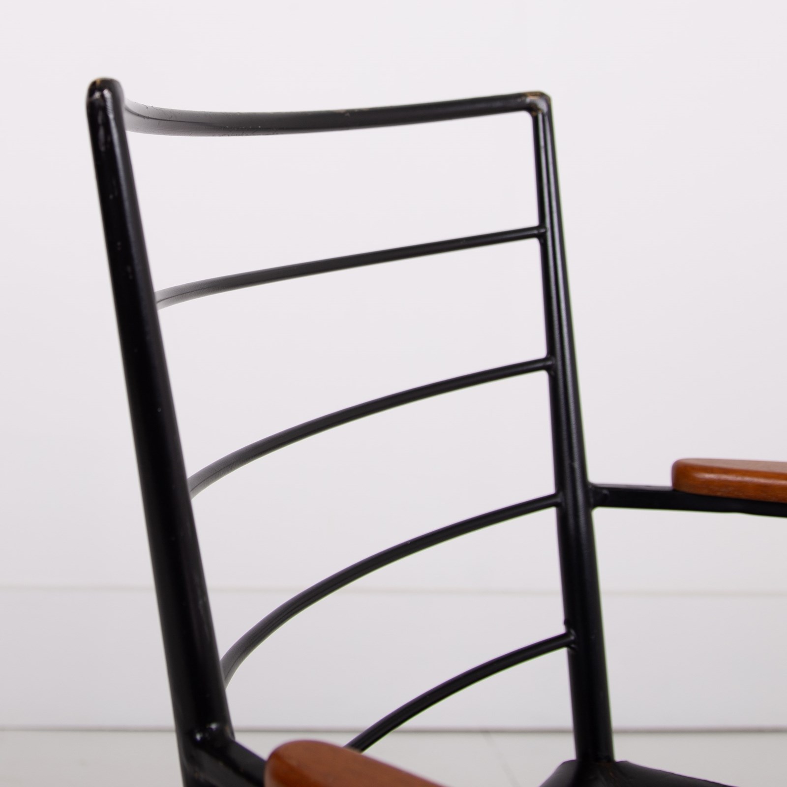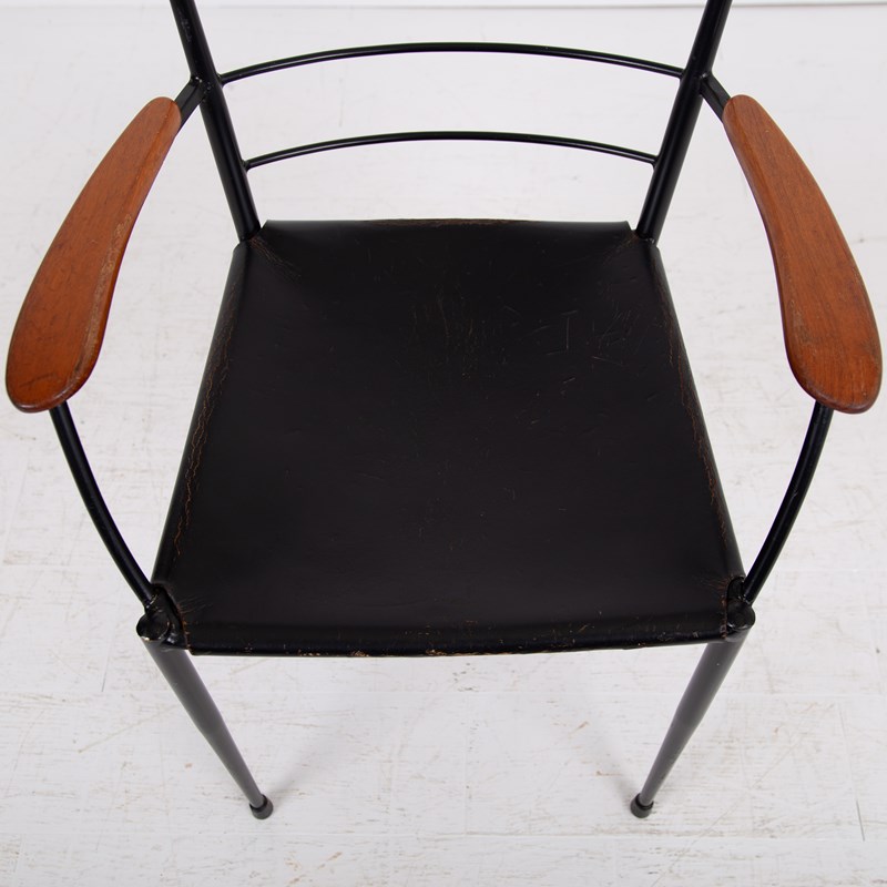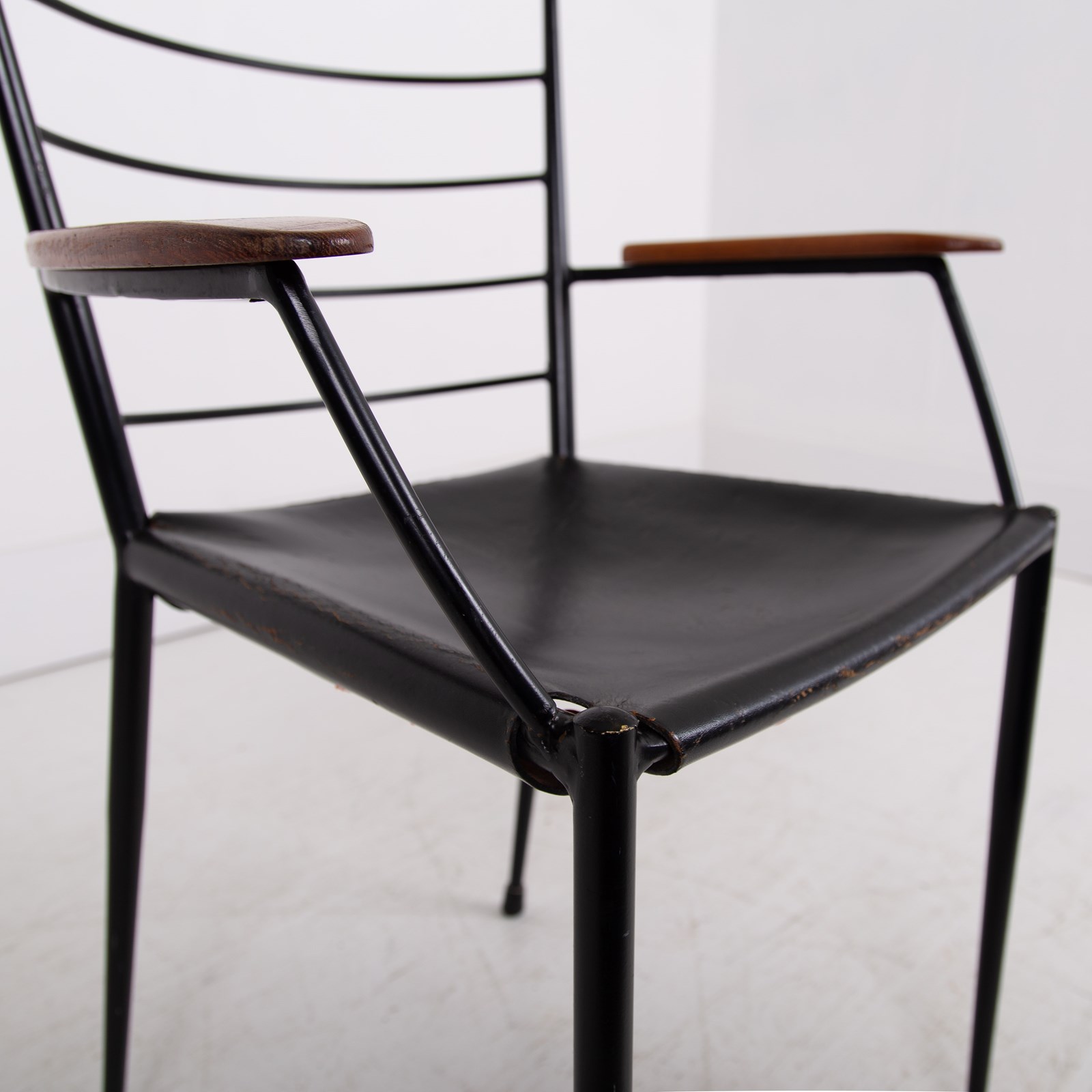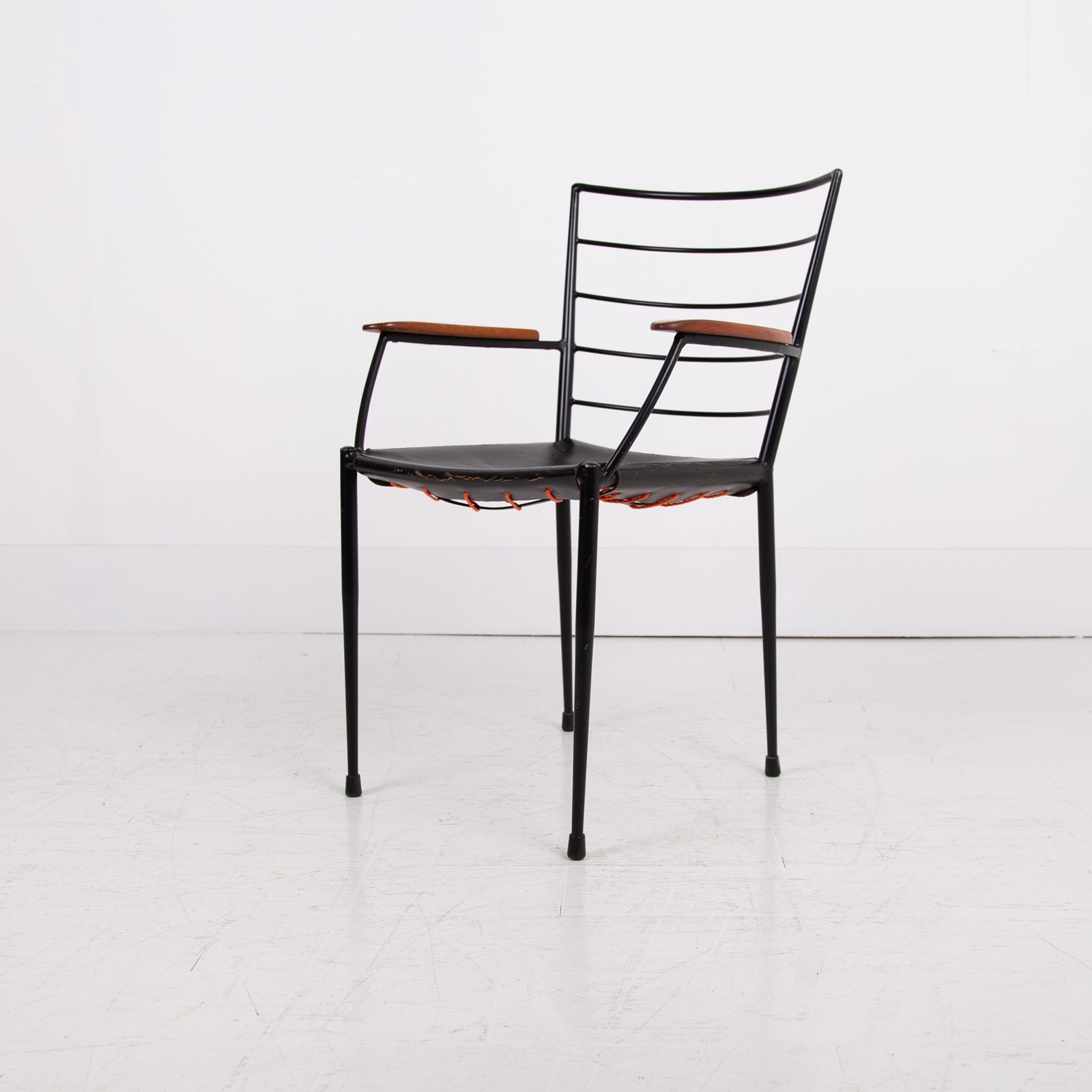 The chair which I am sure you know was designed in the 1960s by designer Robert Heal to compliment the Staples Ladderax storage system. The leather is held in place as a sling seat by strong rope. The frame being black coated steel - very much to compliment the era and style.