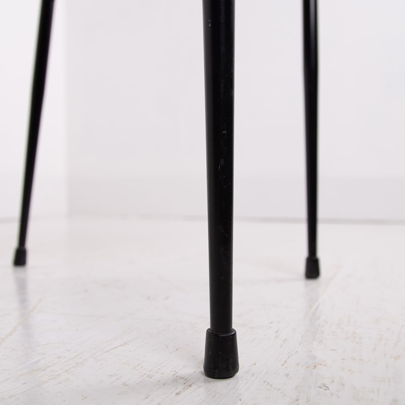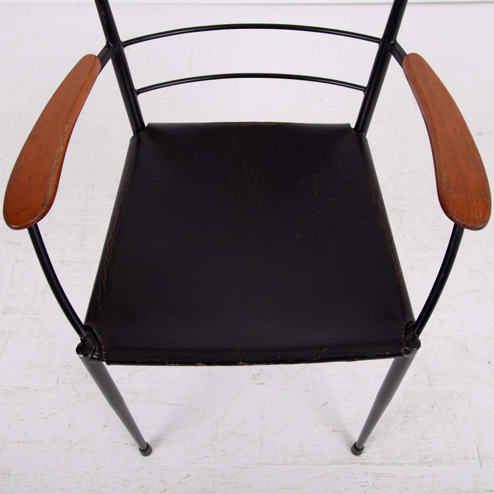 It is in good condition, the original leather has gained historic changes to its tone and finish over time but “sits” fine. The black frame has genuine wear as do the arms. Ready for placing.