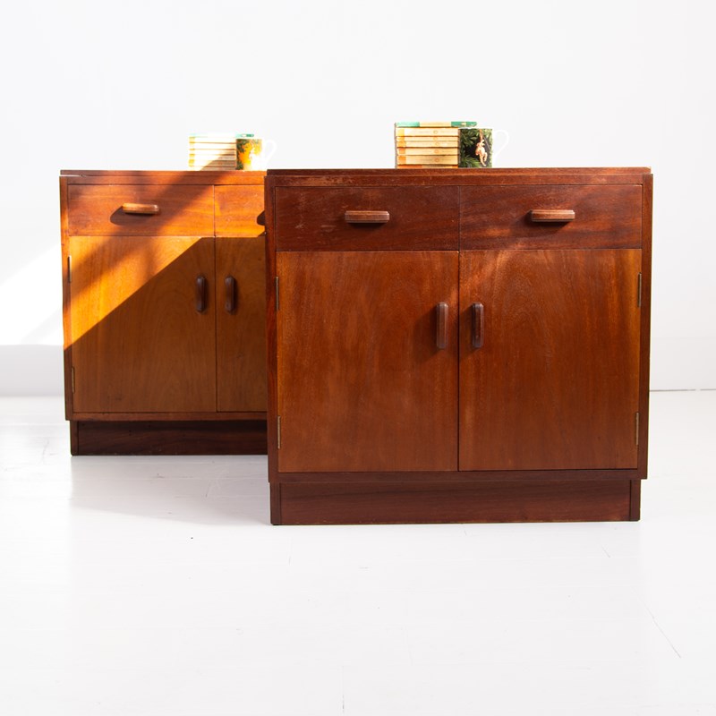 The cabinets, very likely made by Gordon Russell or Alfred Cox - we have had similar with the Russell stamp are of a good scale with 2 drawers with those well shaped handles, a deep and shelved cupboard underneath which opens by way of similar designed handles. The top is teak edged with a green insert which is attractively age crazed and both cabinets have been carefully cleaned and prepared ready for placing. Please expect aging and patina but nothing nasty, heavy and solid for their size too.