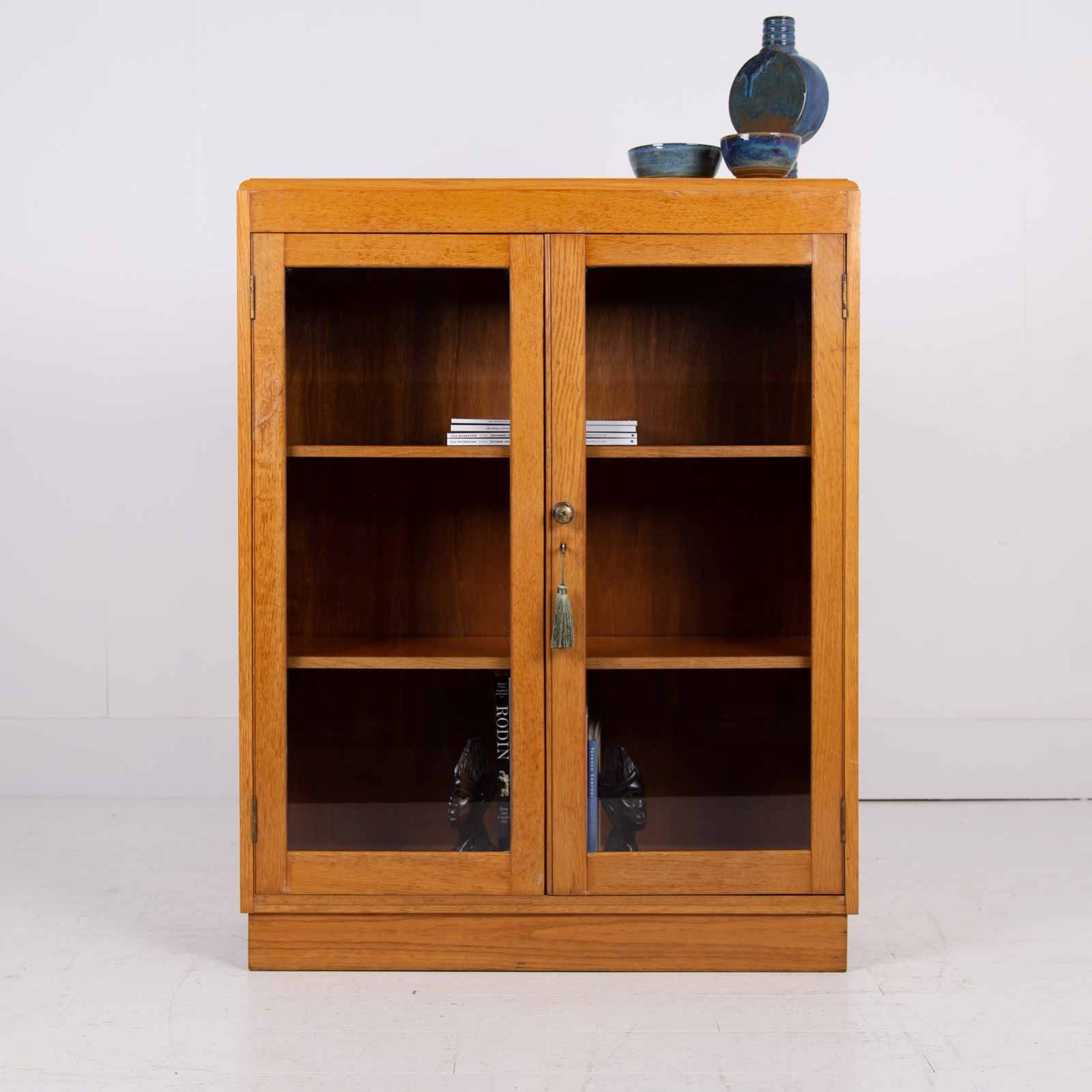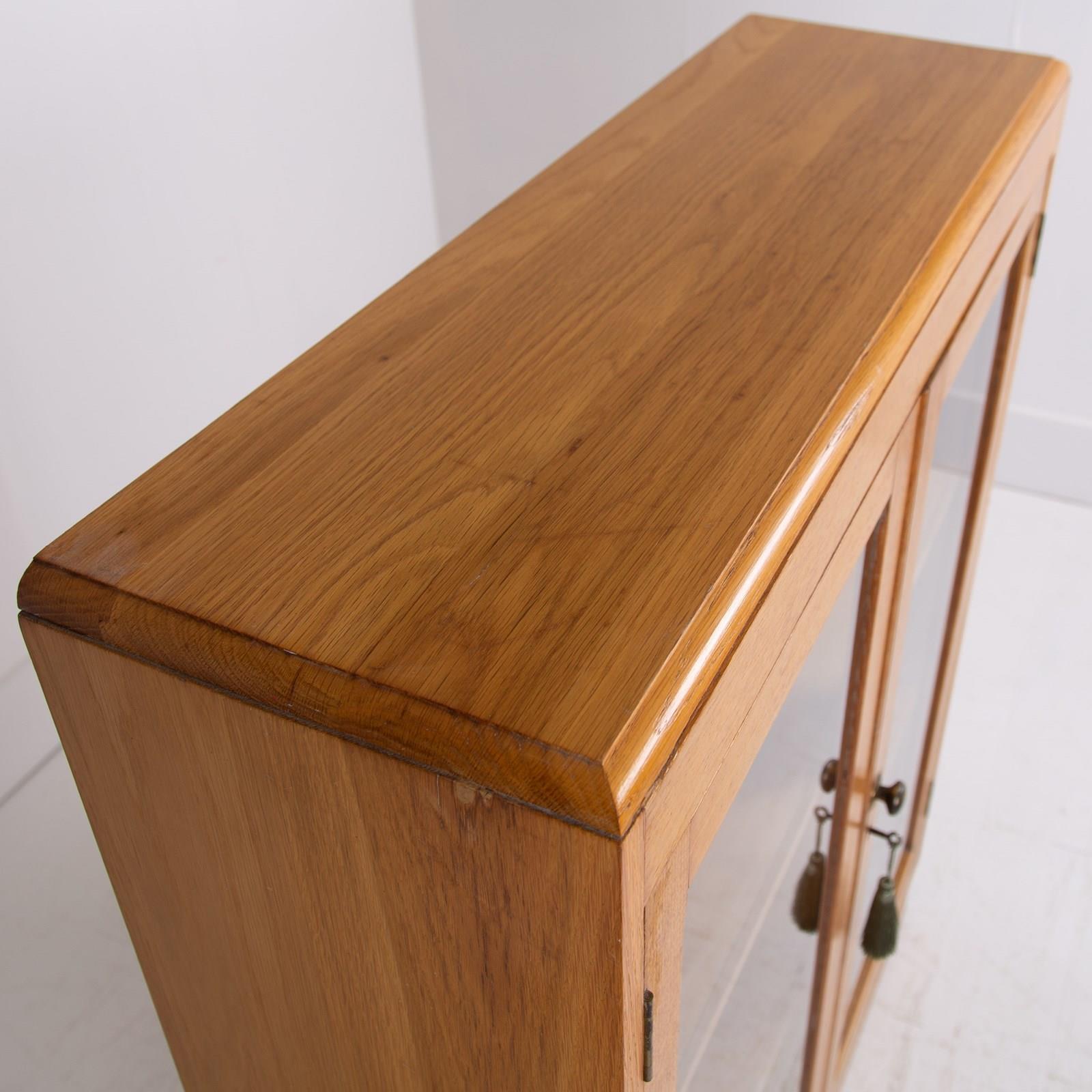 It sits in a lighter oak than some with two glazed oak framed doors, has a working lock and key and aged brass knob. Inside we have 2 adjustable shelves oak fronted and we have ensured the piece is ready for placing, expect light usage nothing nasty.