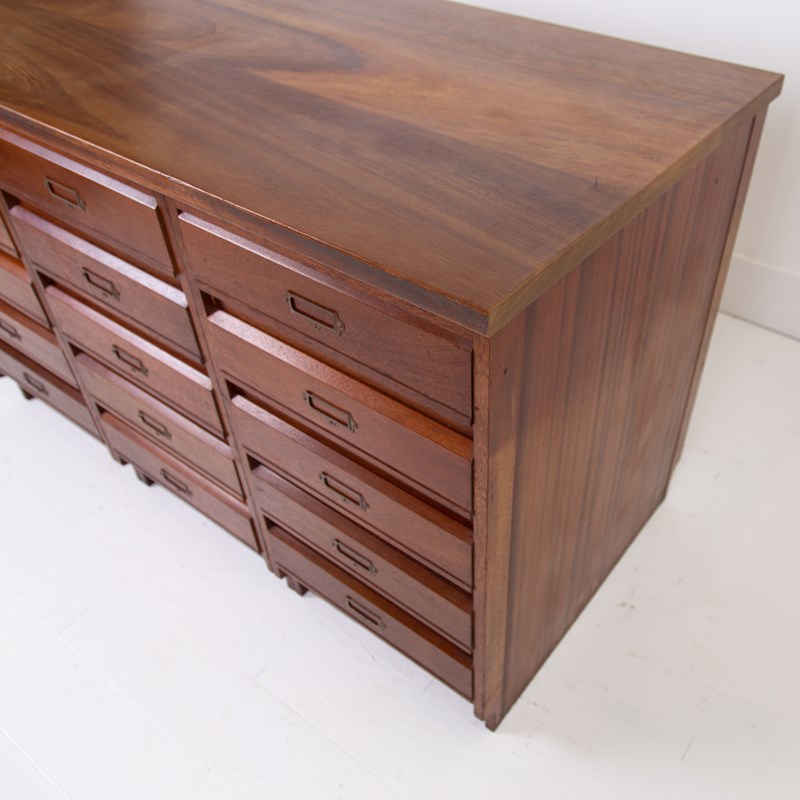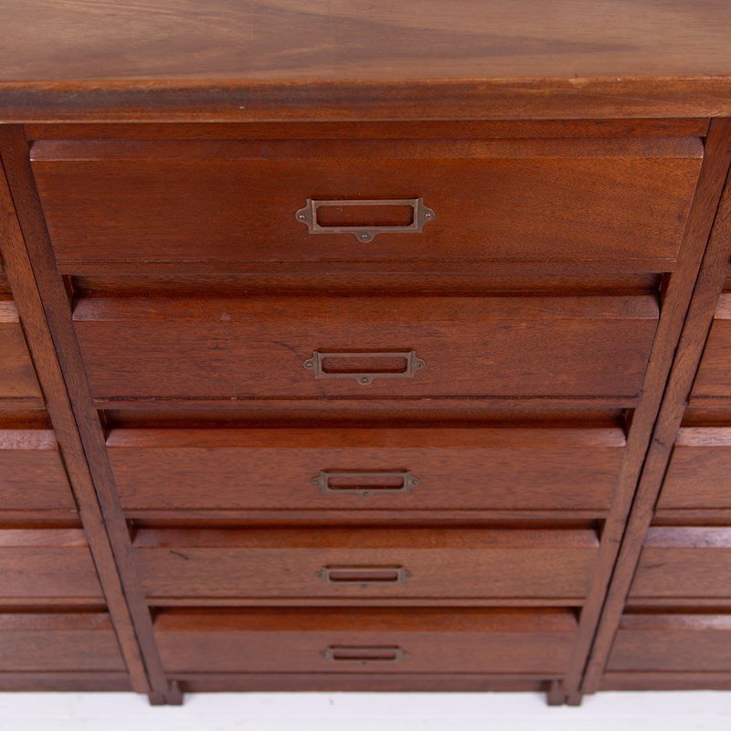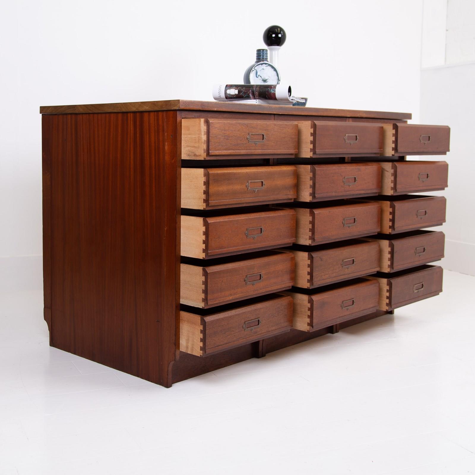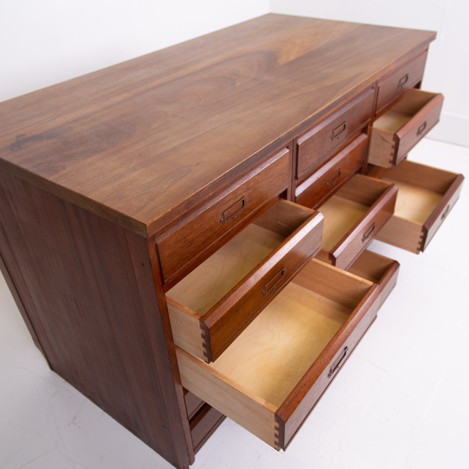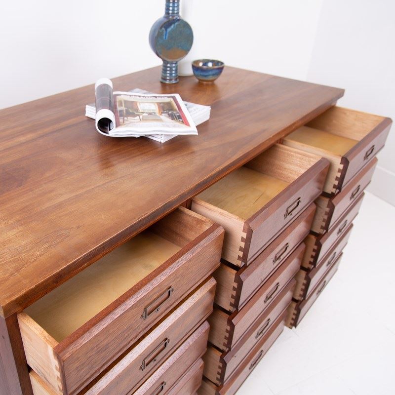 These would have been specially made for the university and are all dated 1952 the design echoes the era very well with nice angles and form especially to the 15 drawers. As mentioned these rare pieces survive in good order, with the 15 drawers running well. All the drawer fronts have the original brass tarnished label holders in place. Expect day to day lab use to the sides, bottoms and the thick tops, these are not new. We have ensured the cabinet is clean and tidy and ready to place.