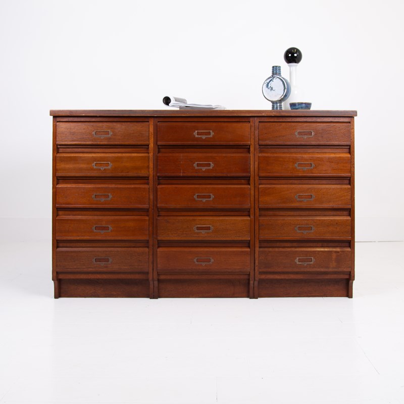 Dated 1952 and used in the Geology Lab of a university – we have 2 of these matching, 15 drawer cabinets which survive in great order.