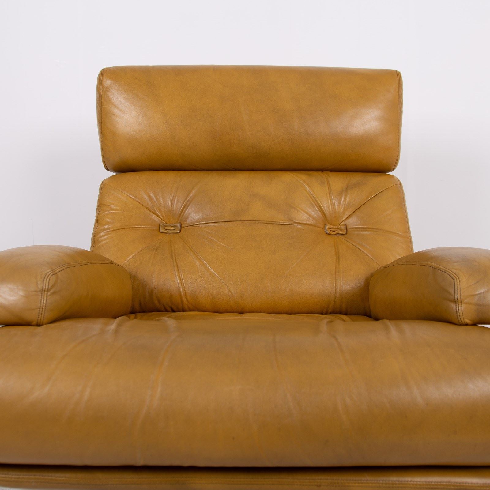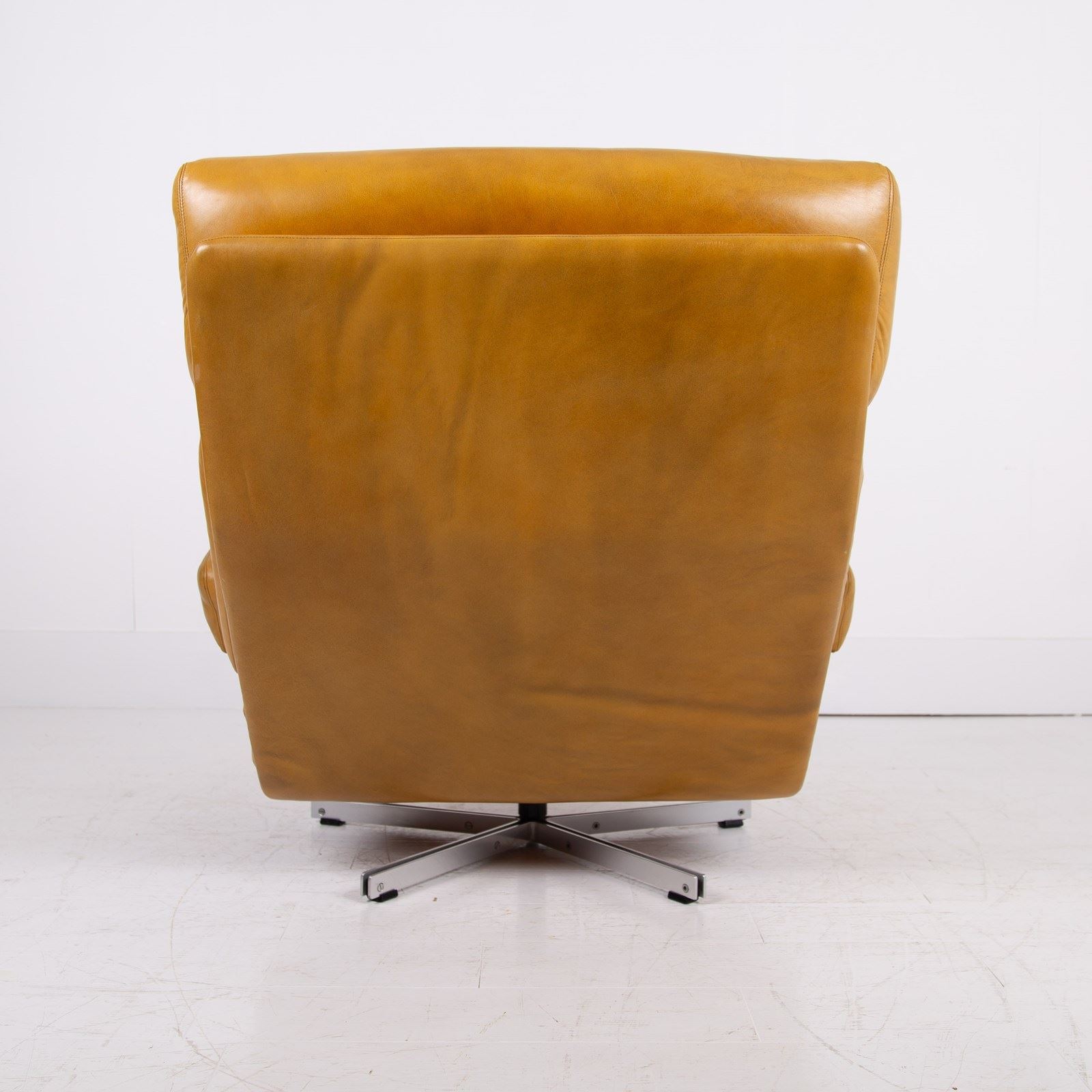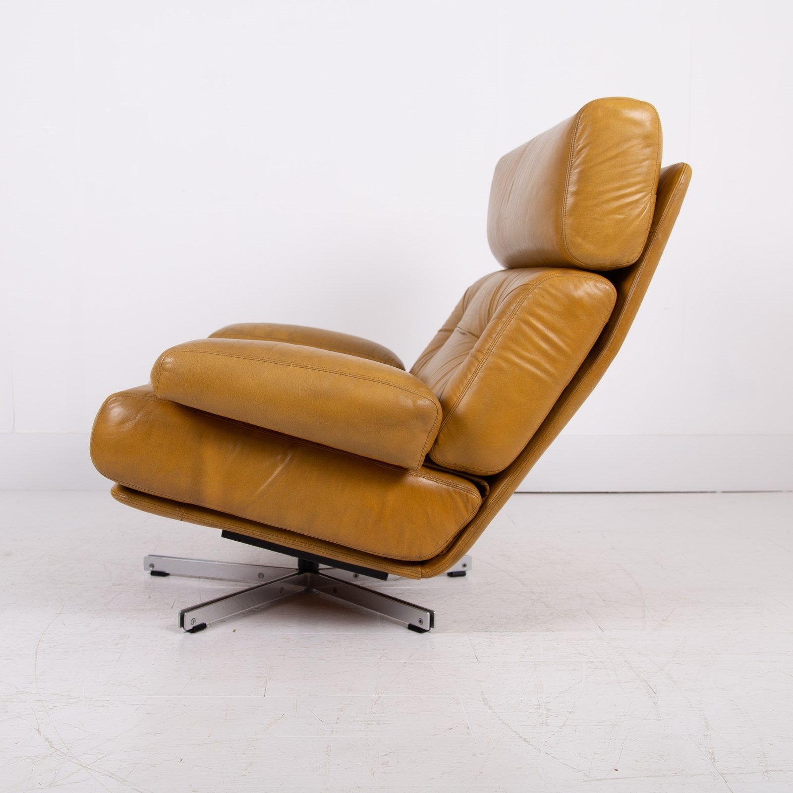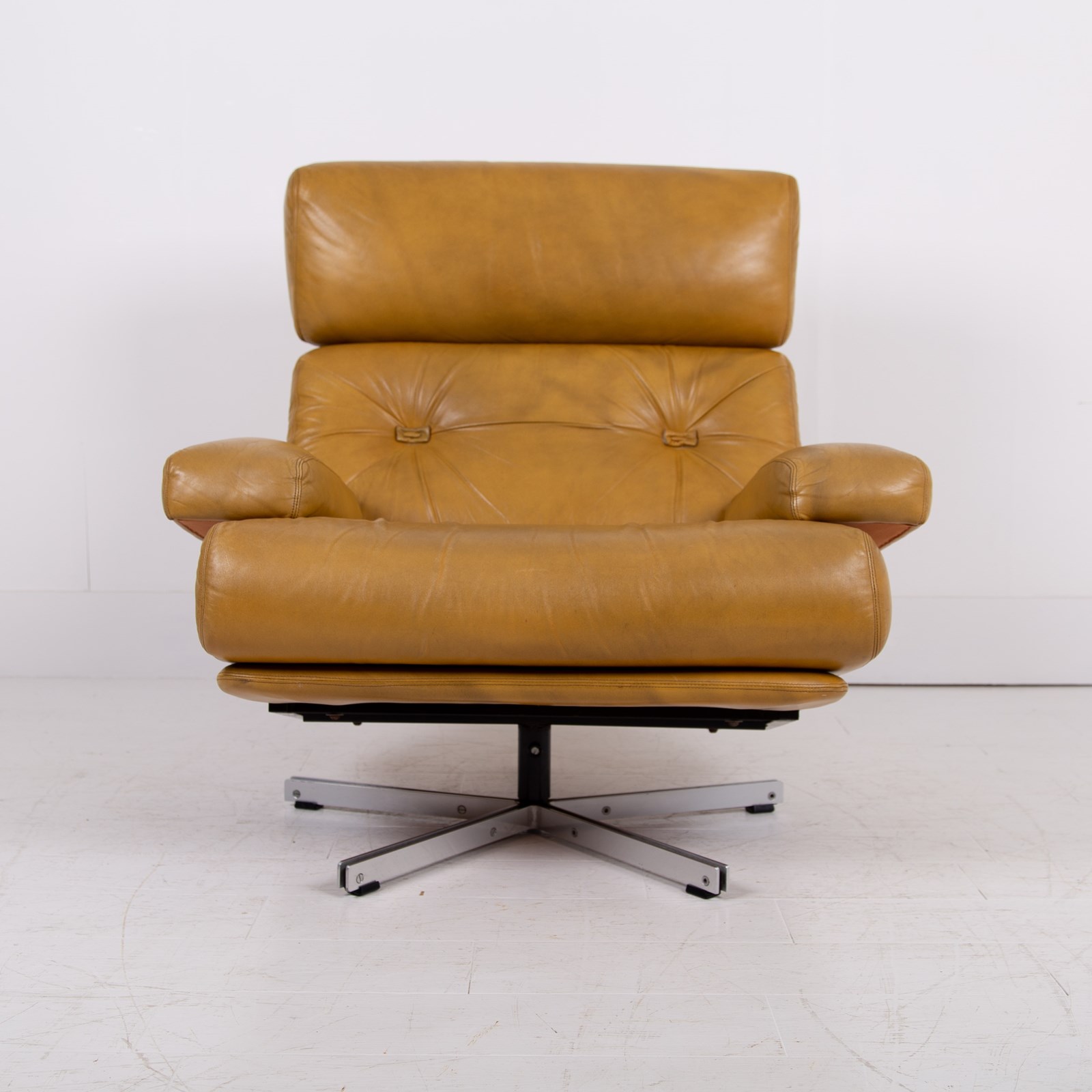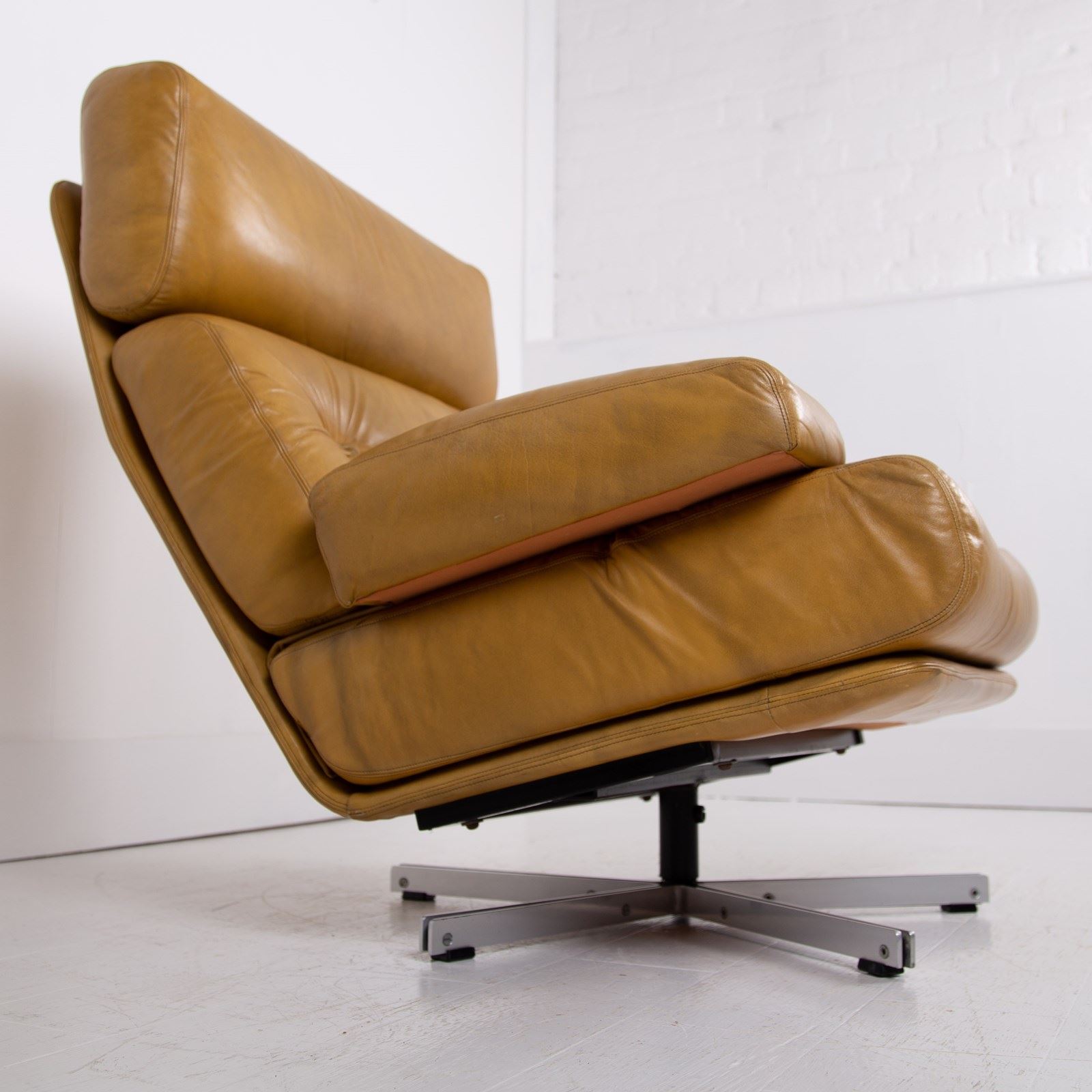 This chair benefits from being carefully used and possessing a cracking profile. The images really display the quality of the craftsmanship and also the quality of the materials used. We are constantly purchasing this type of chair and this one is in a great condition with sensible aged creasing and wear to the deep speckled mustard leather, please note that the leather would have been “antiqued” when originally produced, hence the variation in tones. No rips or tears, the swivel is working fine, no cracks to the base and it smells fine. The chair has been carefully cleaned and nourished with a leather balm to give it a soft natural glow rather than a heavy handed gloss finish.