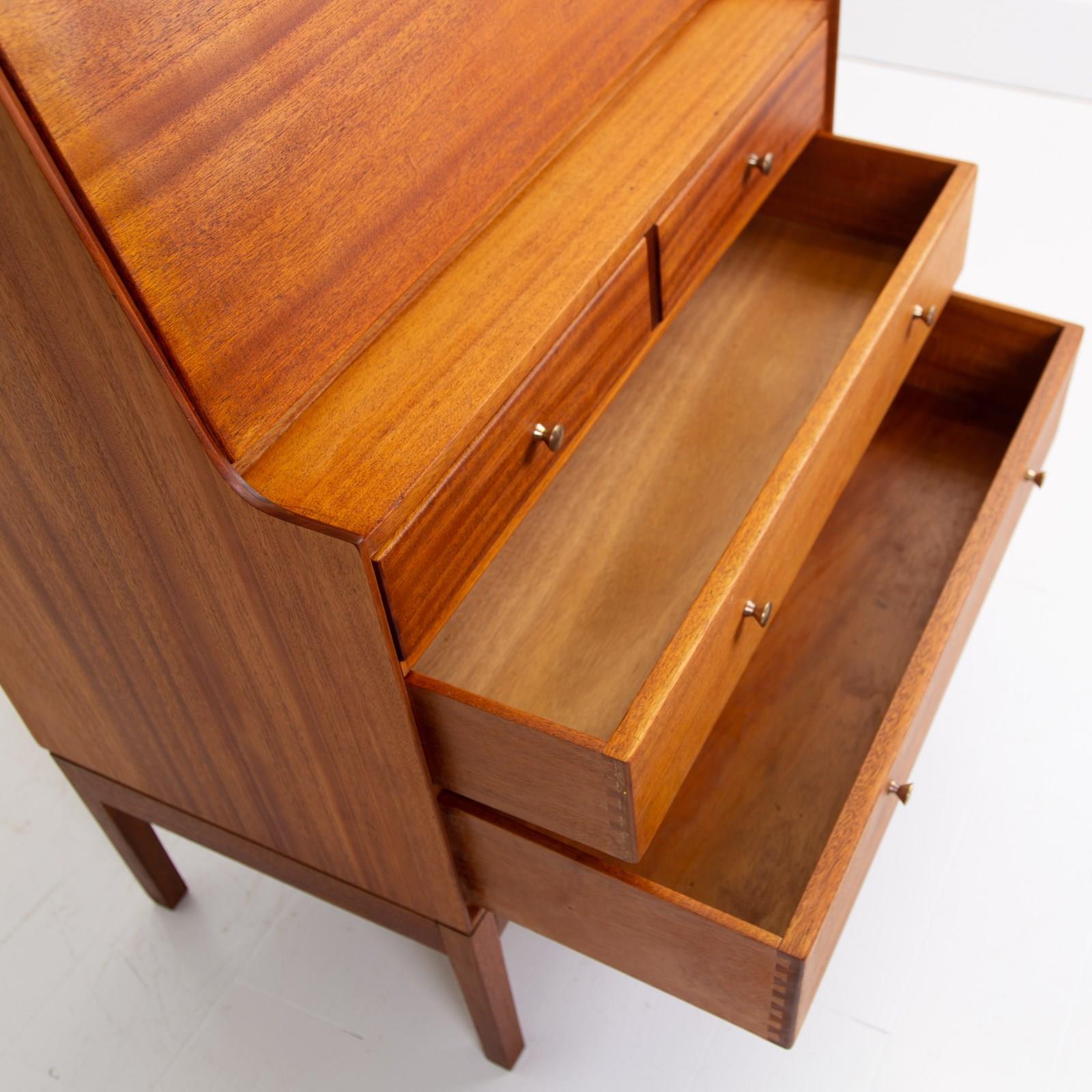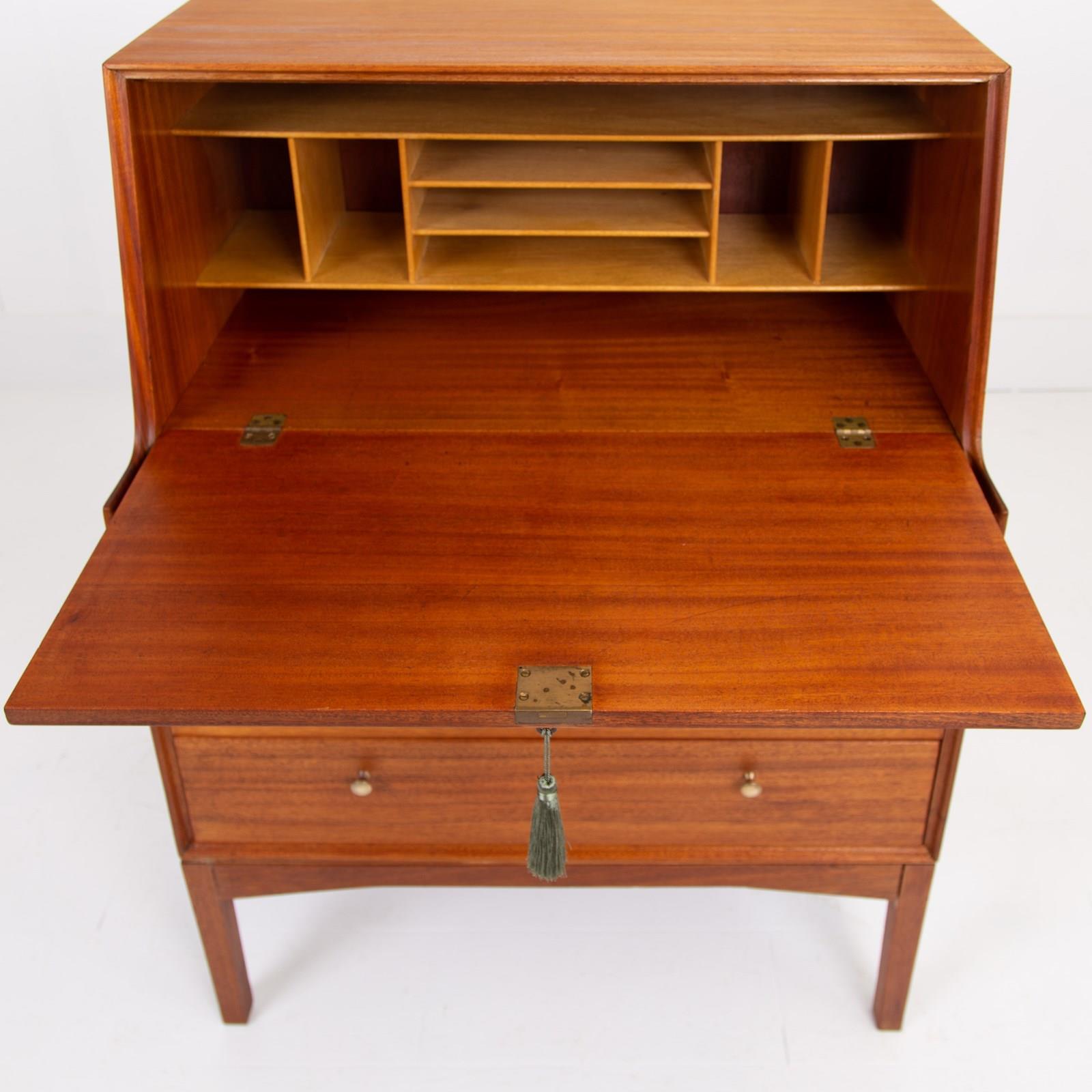 A stylish, extremely well made and rare bureau in teak, designed by John Morton and was made by LM furniture of Wallingford in the 1960’s. Small makers label to the inside of the top right hand side drawer.