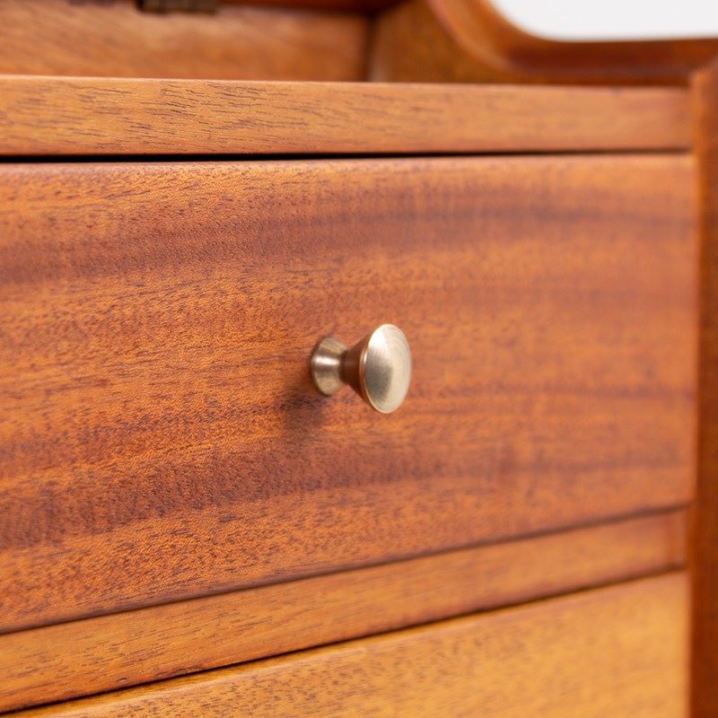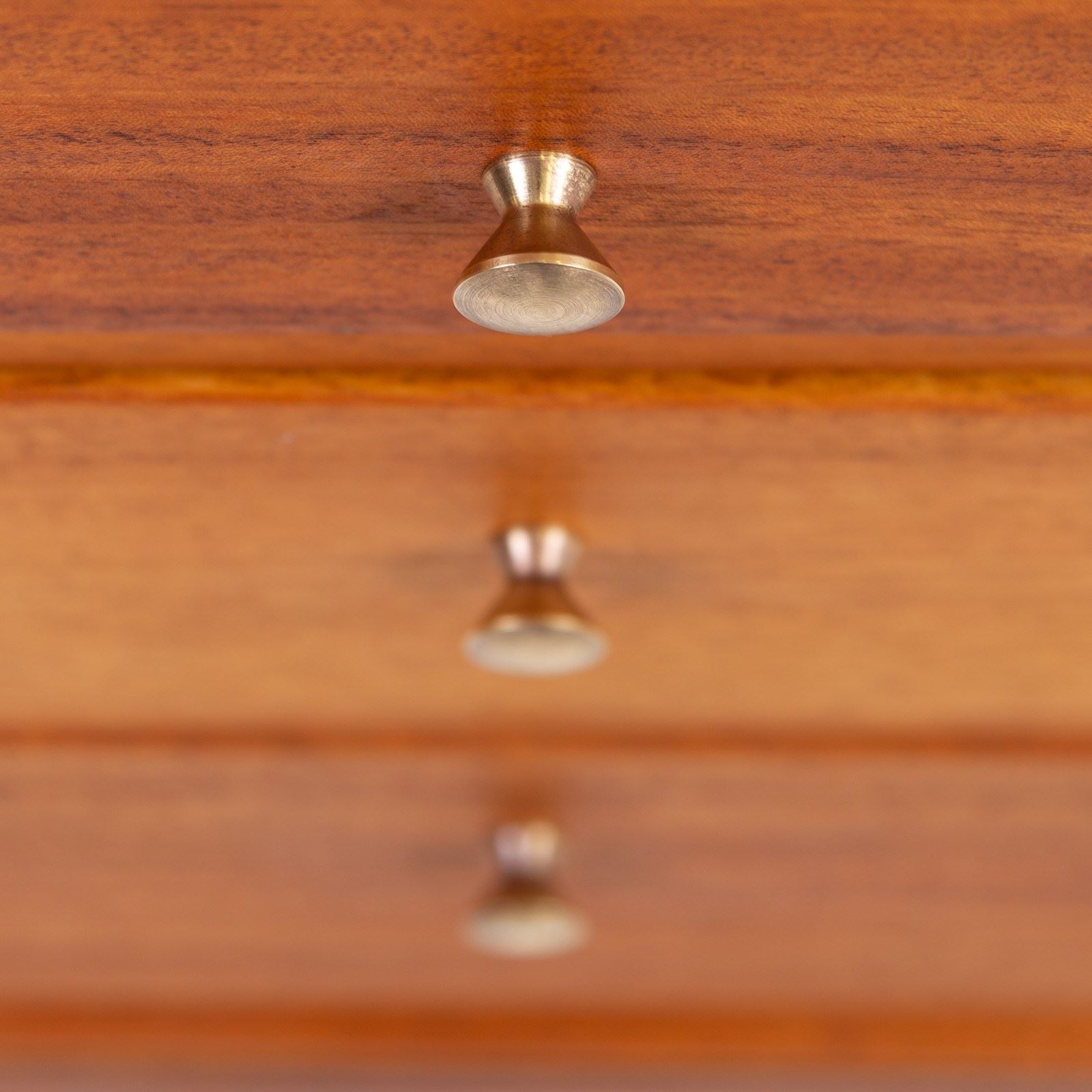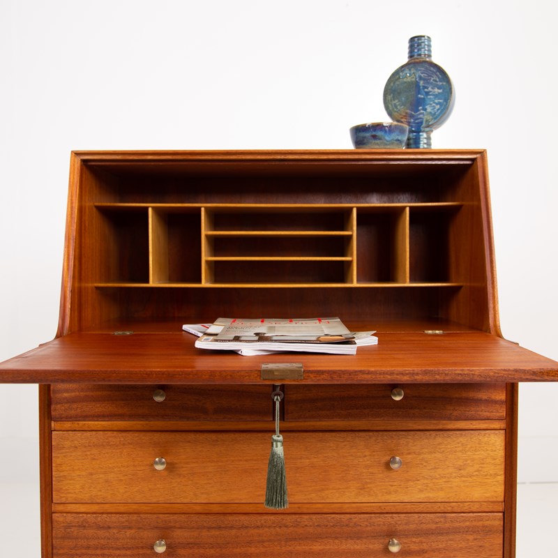 The bureau is a fine example of great design and good craftsmanship and very much echoes the era well with effortless poise, clever use of good timber, in this case teak, and addition of quality hardware - the brass spun knobs are without doubt rather wonderful. The piece has been carefully cleaned and repolished in our workshop and is ready to place. Expect the odd blemish and a few marks inside but nothing nasty with a working lock and key present if you wish to keep a secret or two…