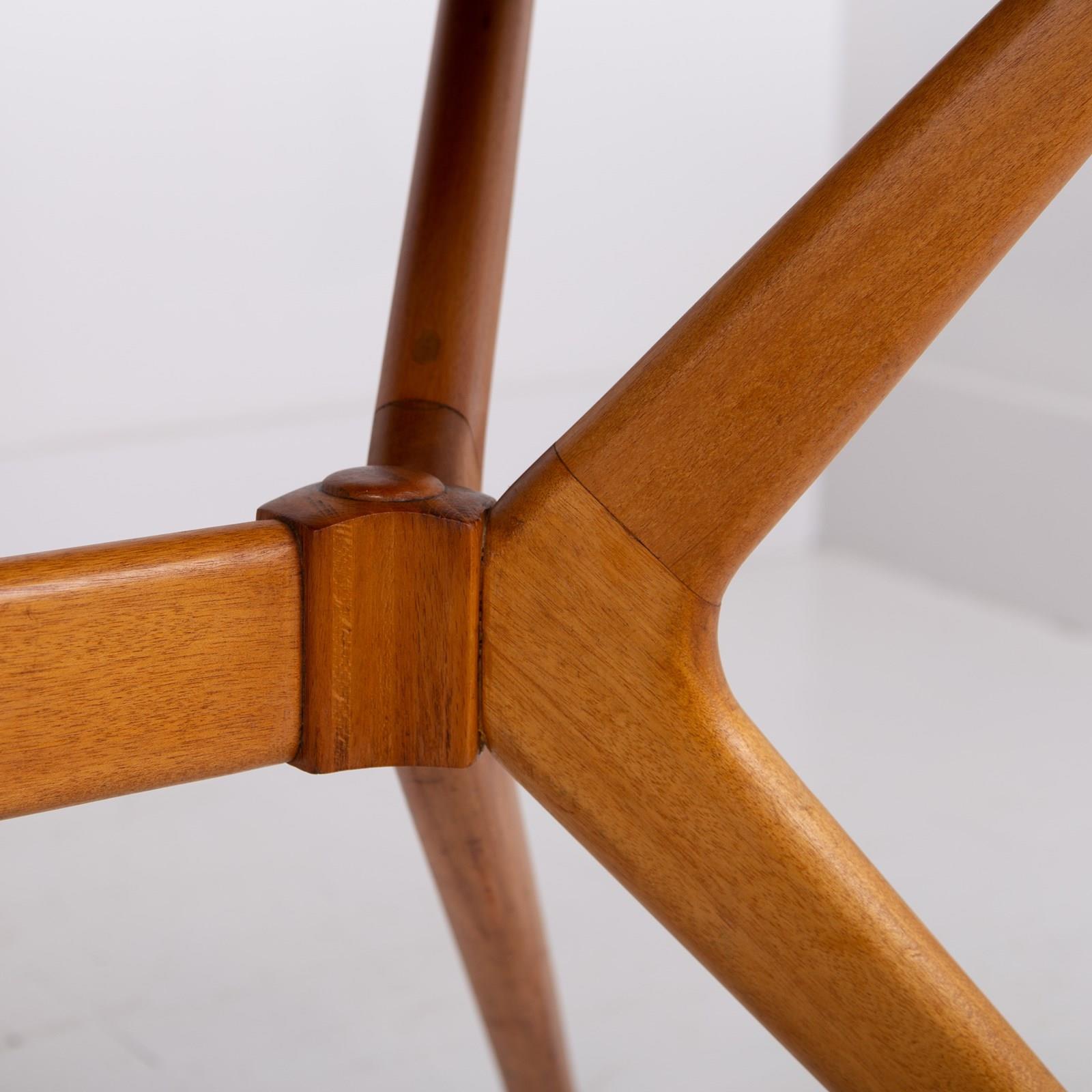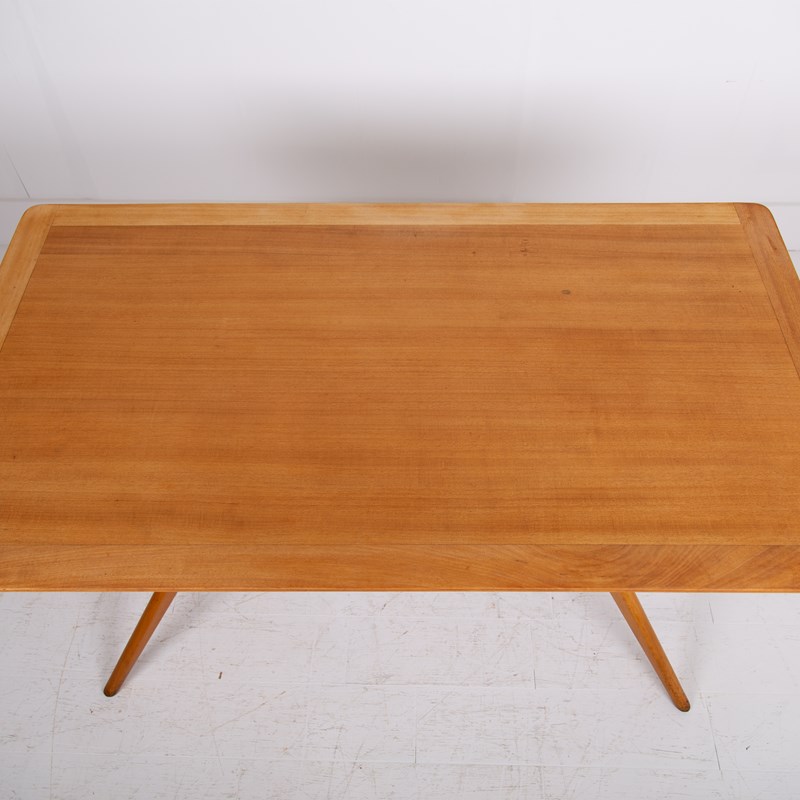 We have a Mid Century G-Plan 'Helicopter' table/desk featuring a teak top with a teak sculptural base. The angled, splayed legs connect through a central stretcher, creating a striking silhouette that exemplifies Mid Century British design.