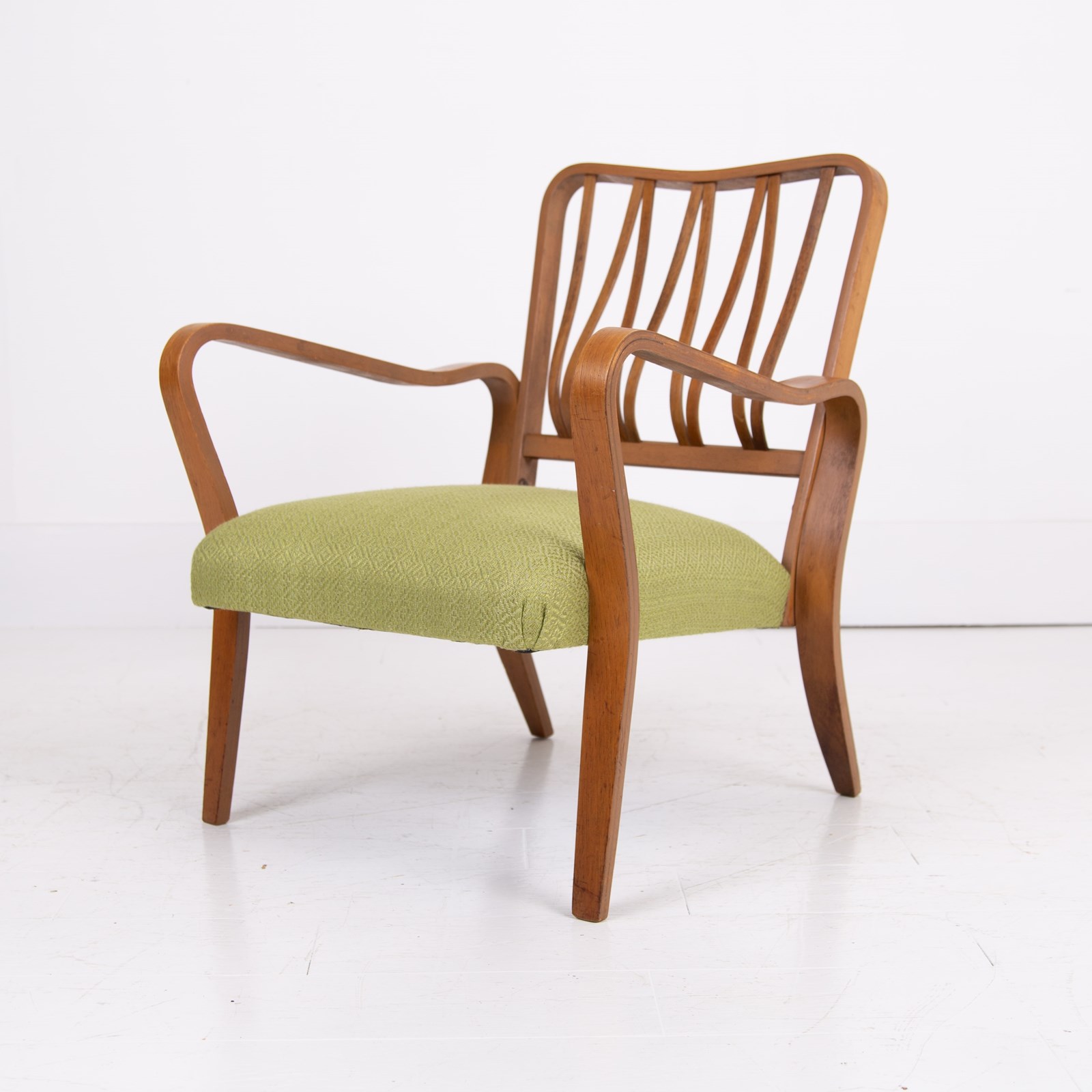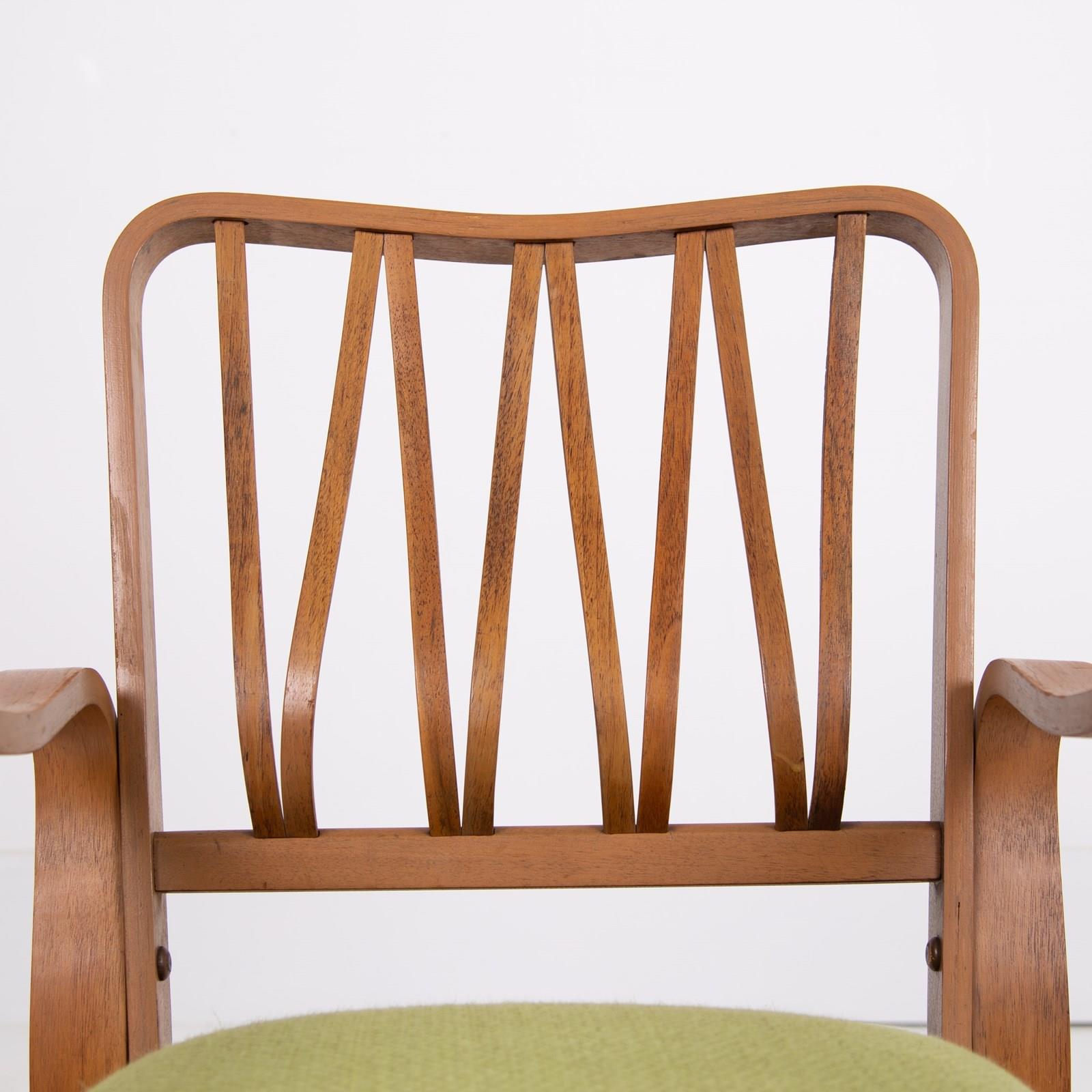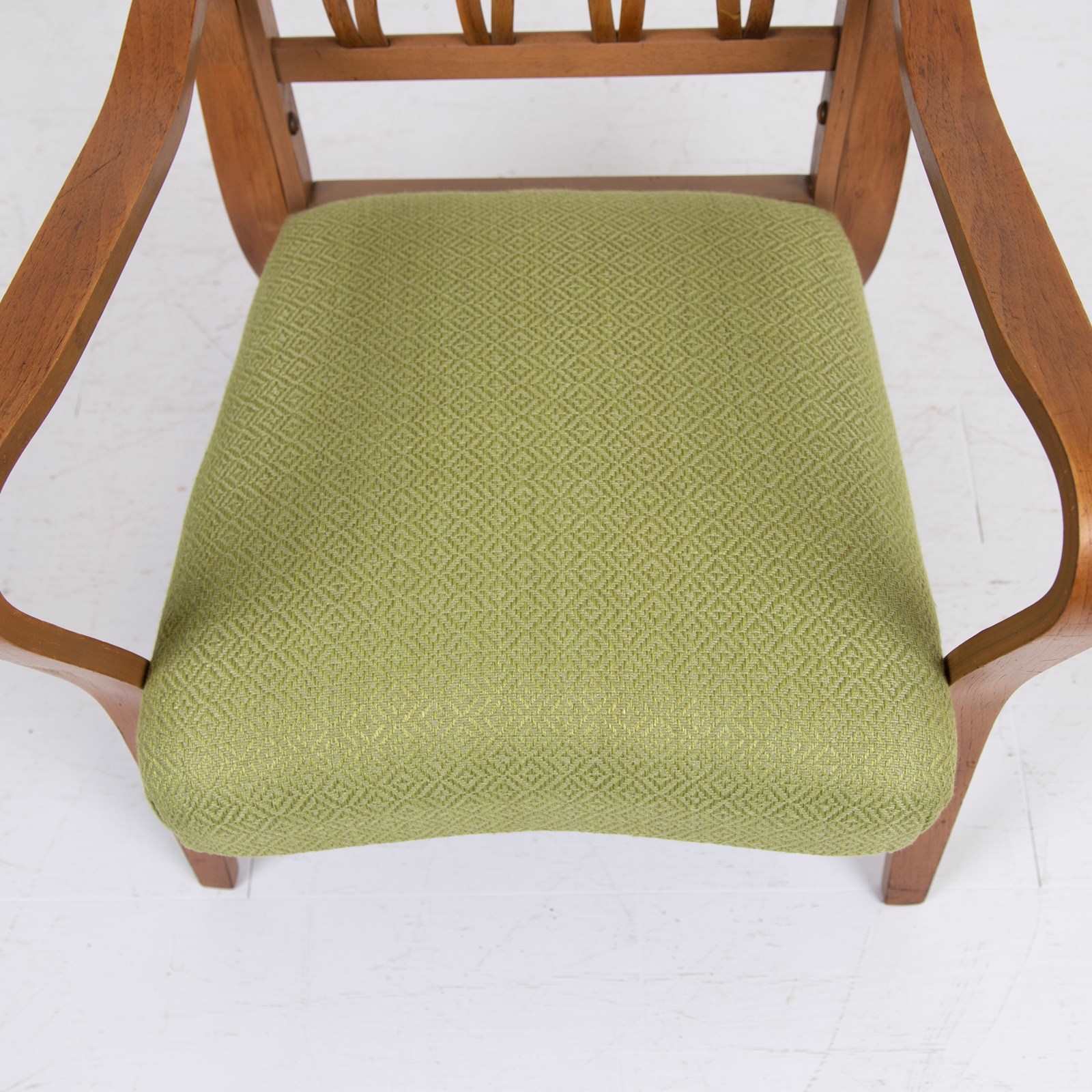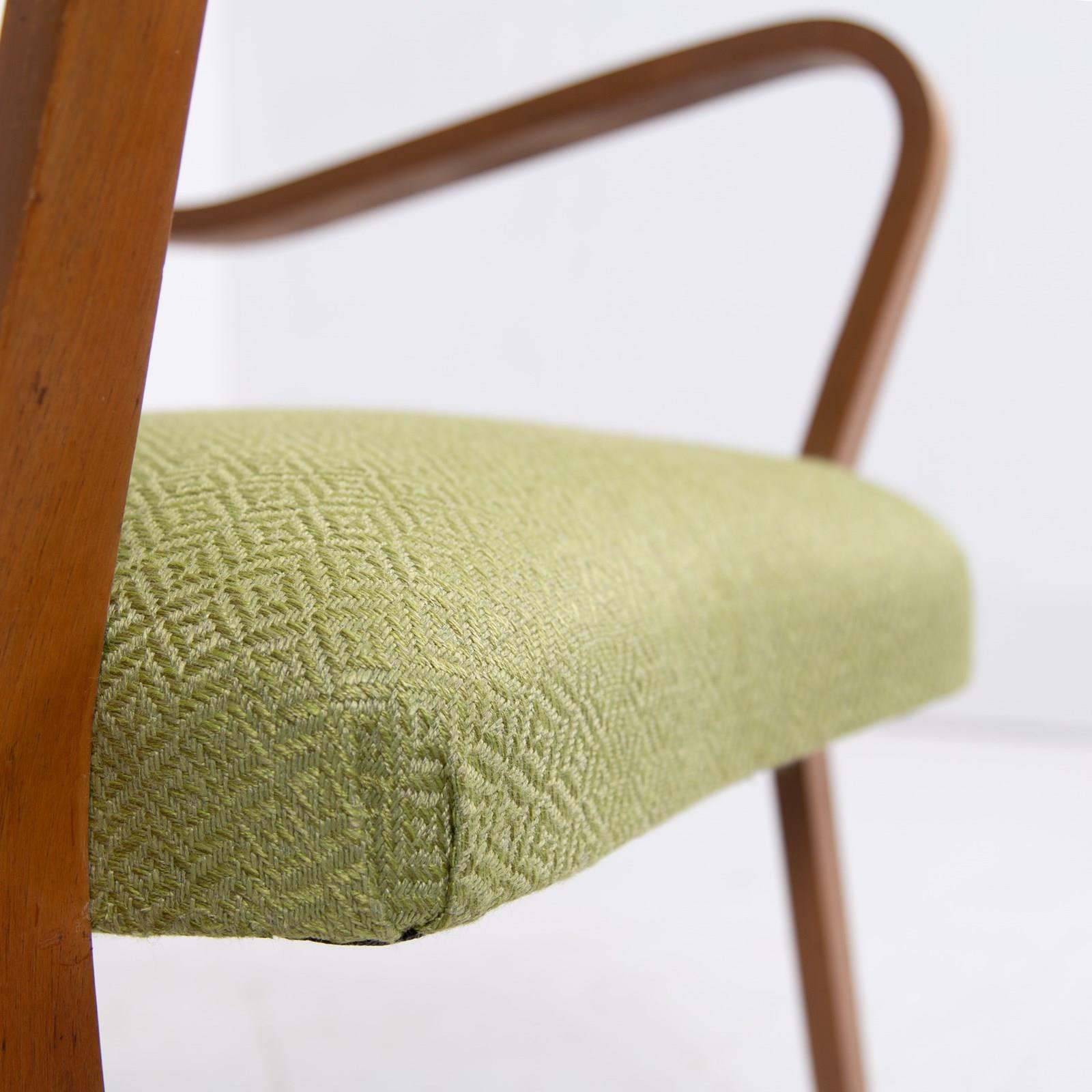 The lovely bentwood frame is highly original and has been carefully prepared with a light coat of museum wax in our workshop. The seat has been professionally reupholstered with new filling and topped with a quality Duresta woven fabric in bitter lime green which works well with the design.