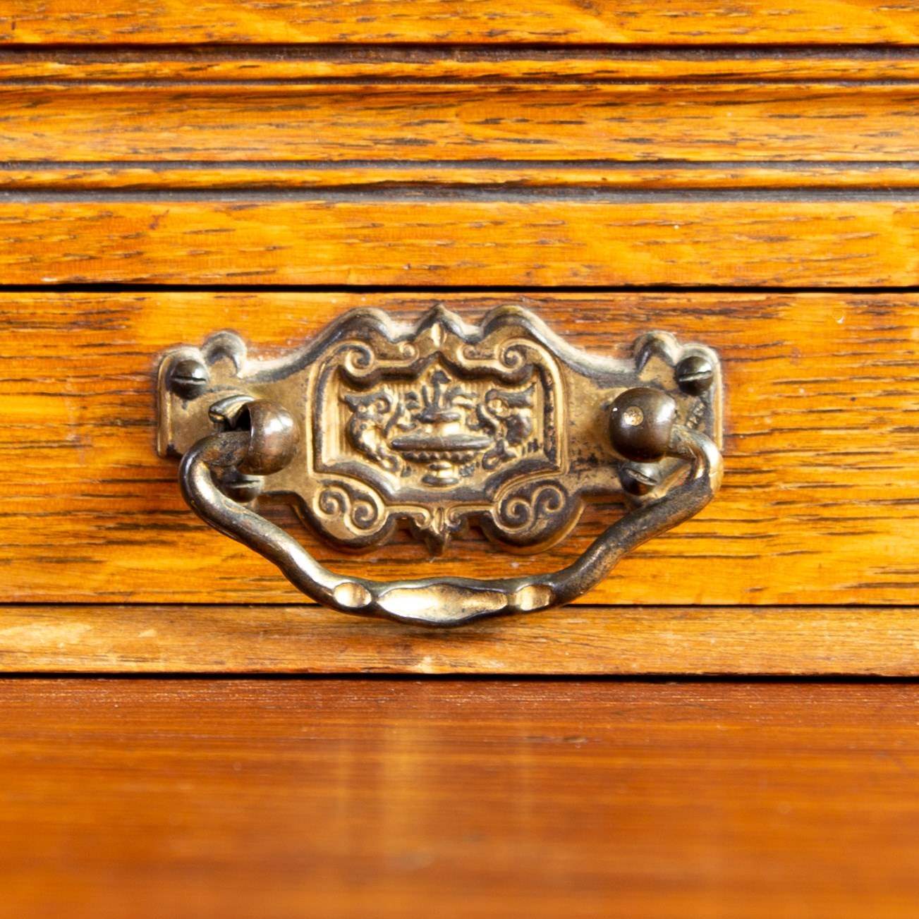 The condition is good with some aging to the piece as shown in the images. The little drawer to the base possesses its original plated handle and the interior is clean. The key is for “show” only and does not work the lock but looks the part all the same and assists with the opening of the doors. Expect aging to the piece please.
