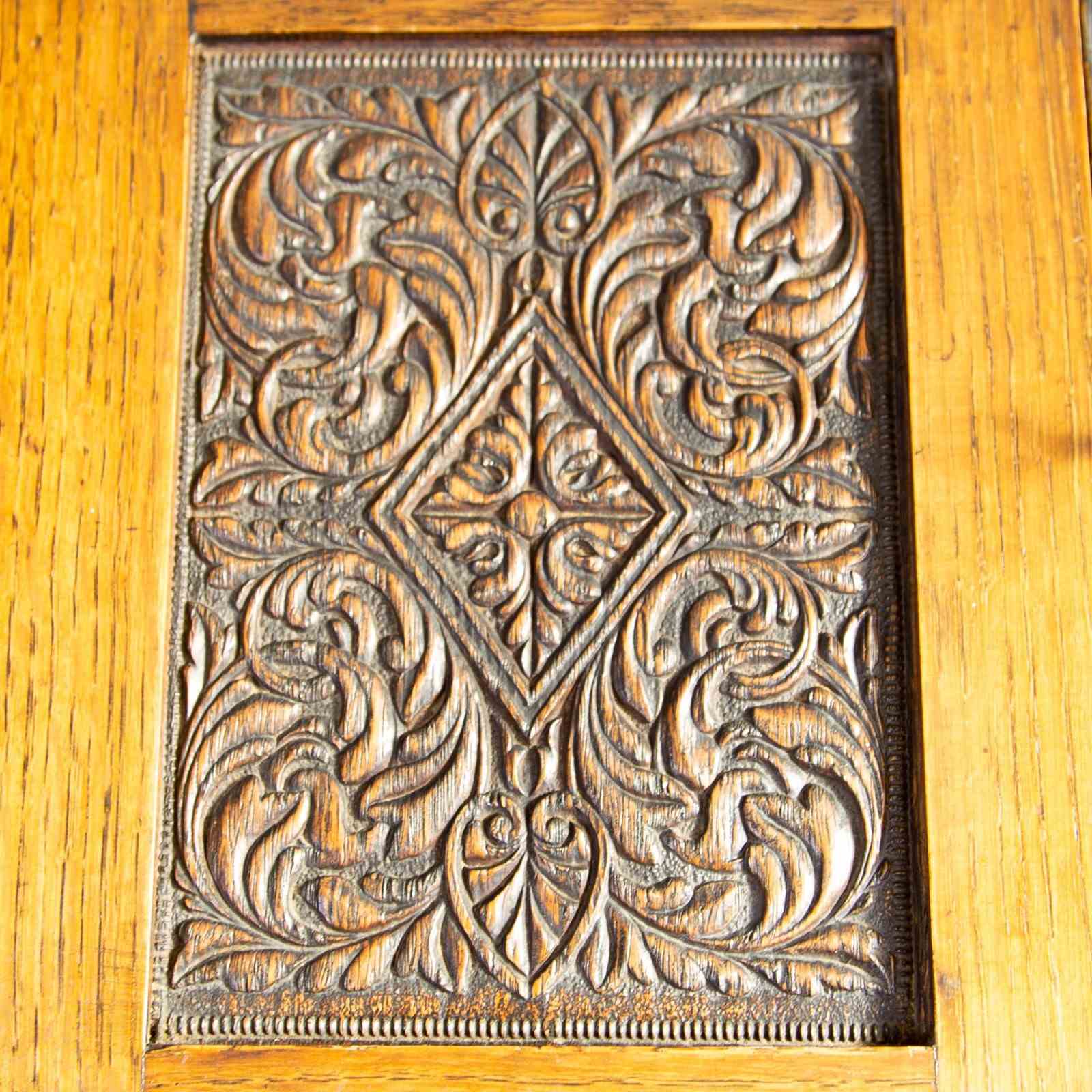A jolly nice looking Victorian English oak desk today in the Aesthetic manner with some fine decorative carving to the doors and front. It's certainly a fine looking piece from a large house in Cheshire where it sat on a large desk.