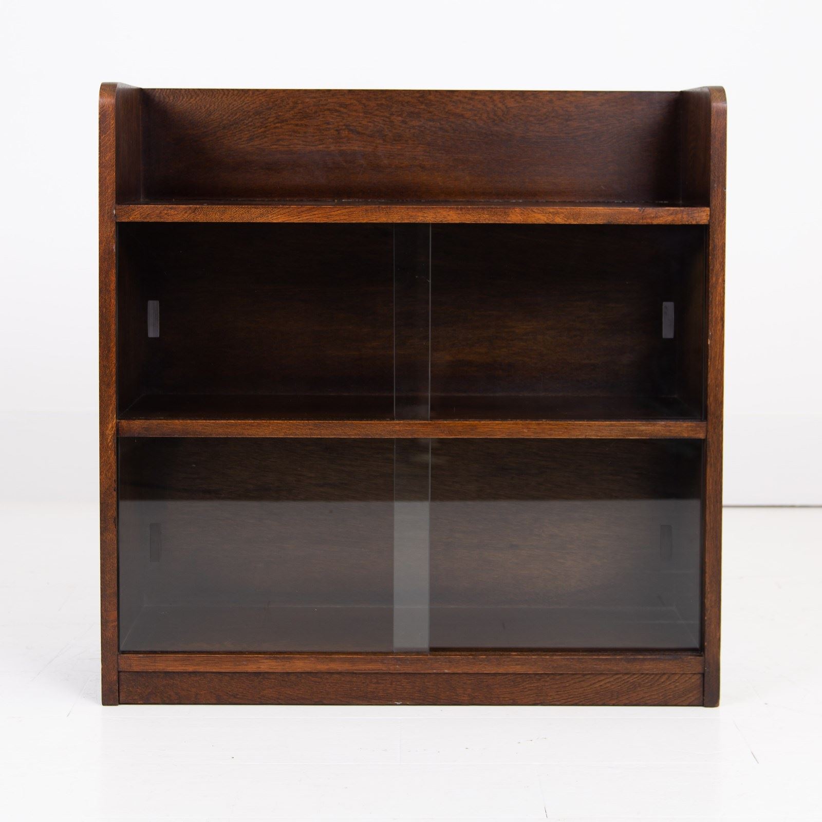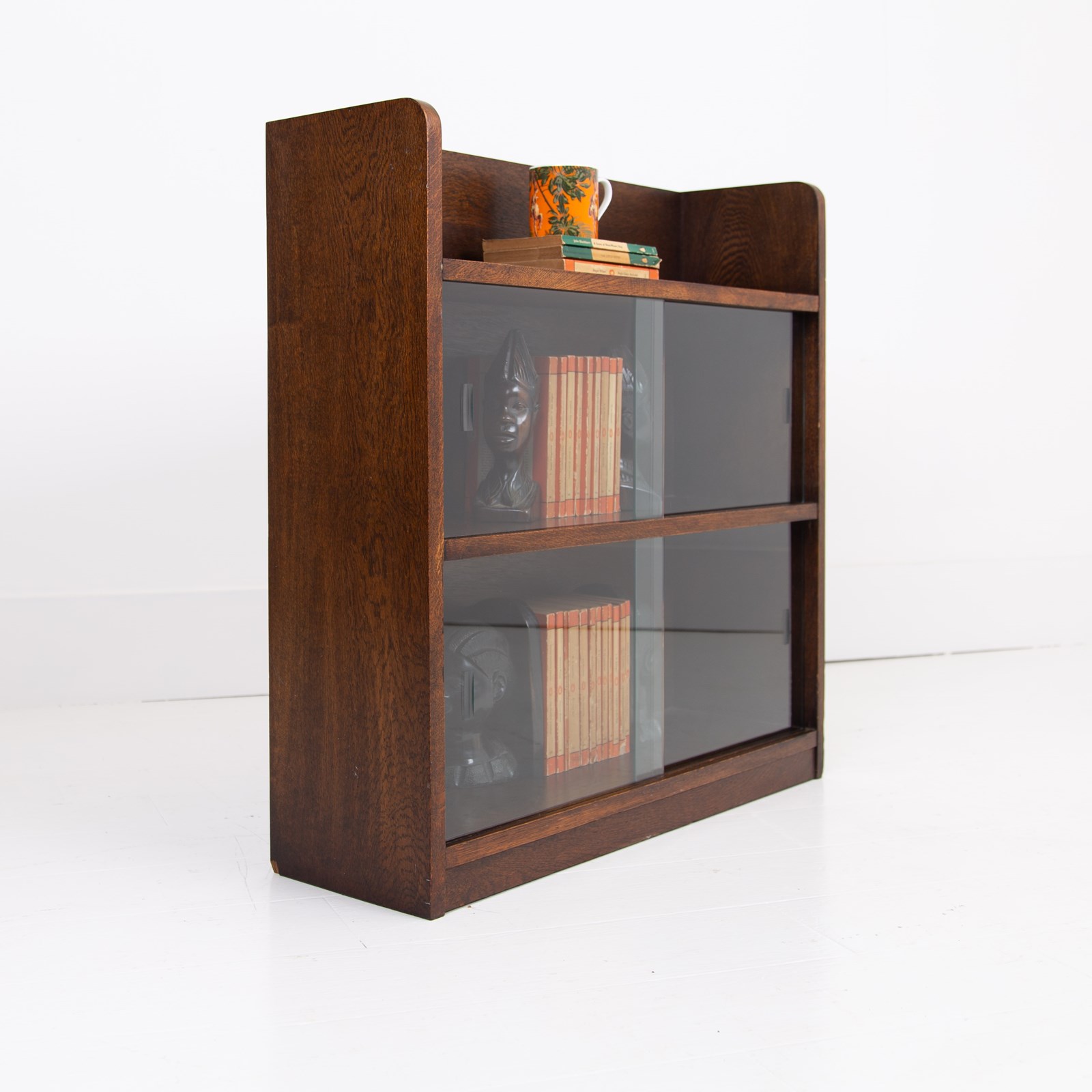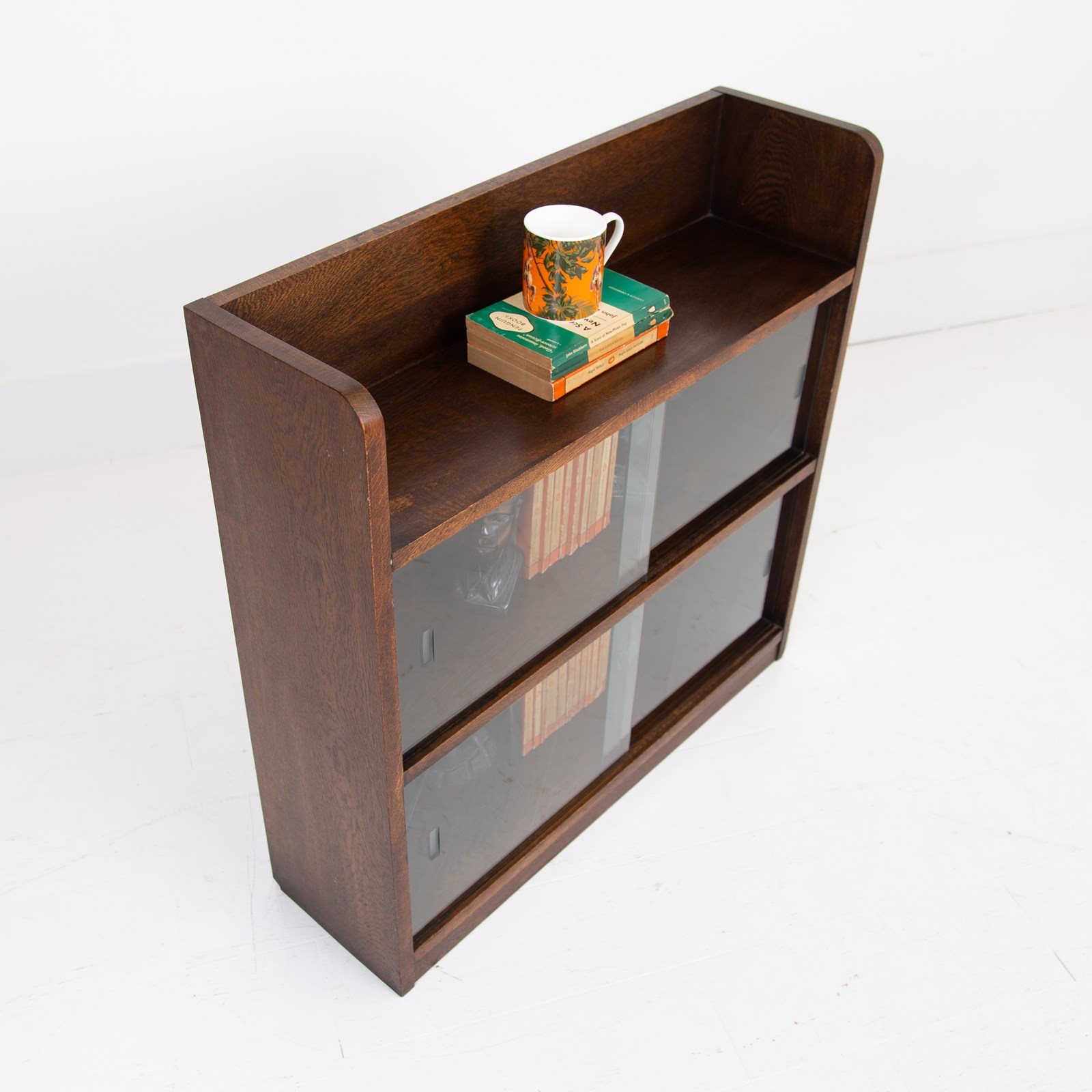 A stylish, neat and smaller sized solid oak bookcase with glass sliding doors C1940. This one sits well and survives in fine order having been carefully cleaned and ready for placing.