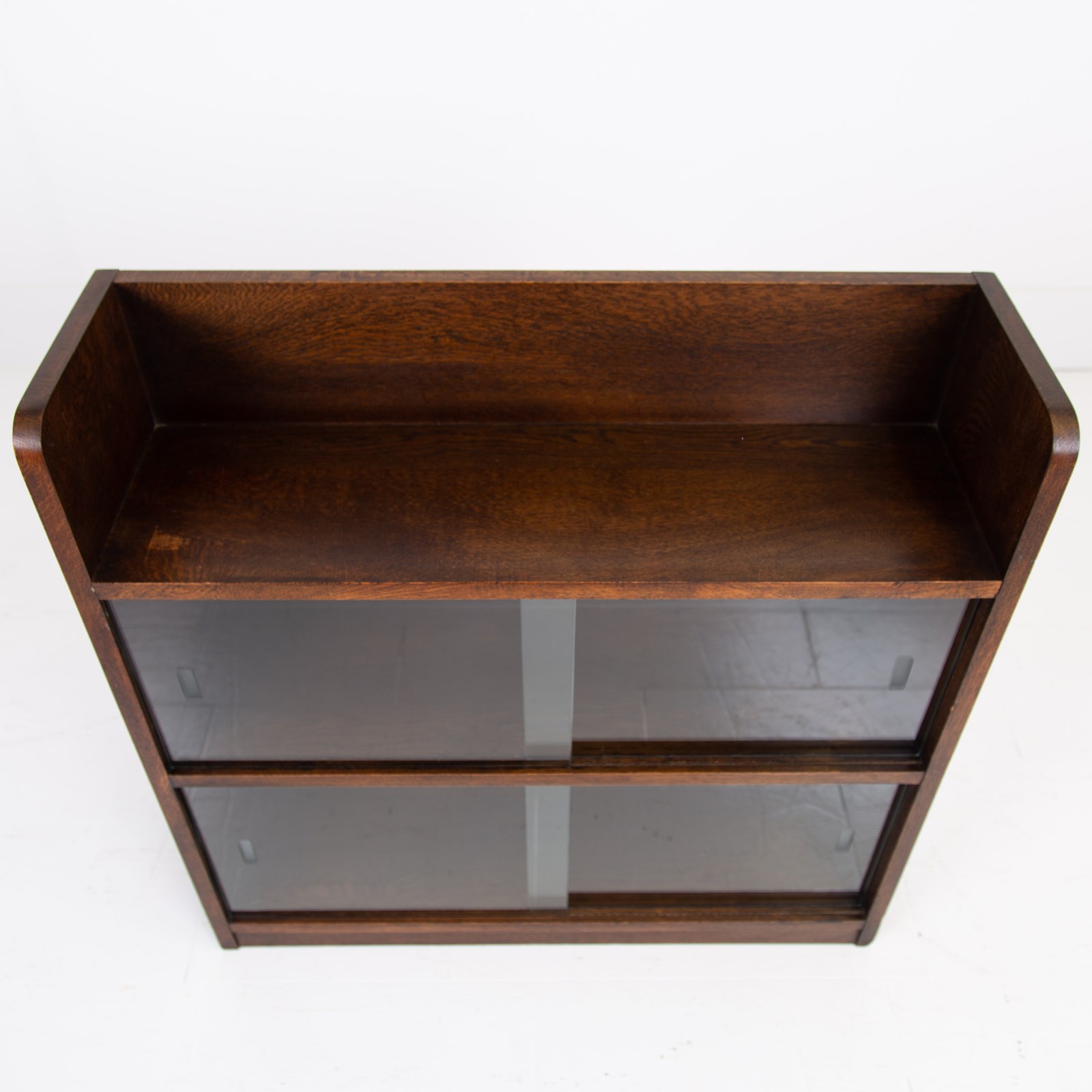 Internally we have two spaces for books and the like, closing by way of the sliding glass doors and in addition a well shaped top shelf with its “high” back. All very much of the era and as mentioned solid oak.