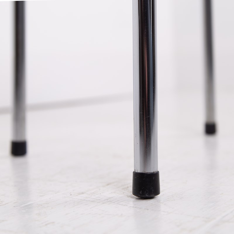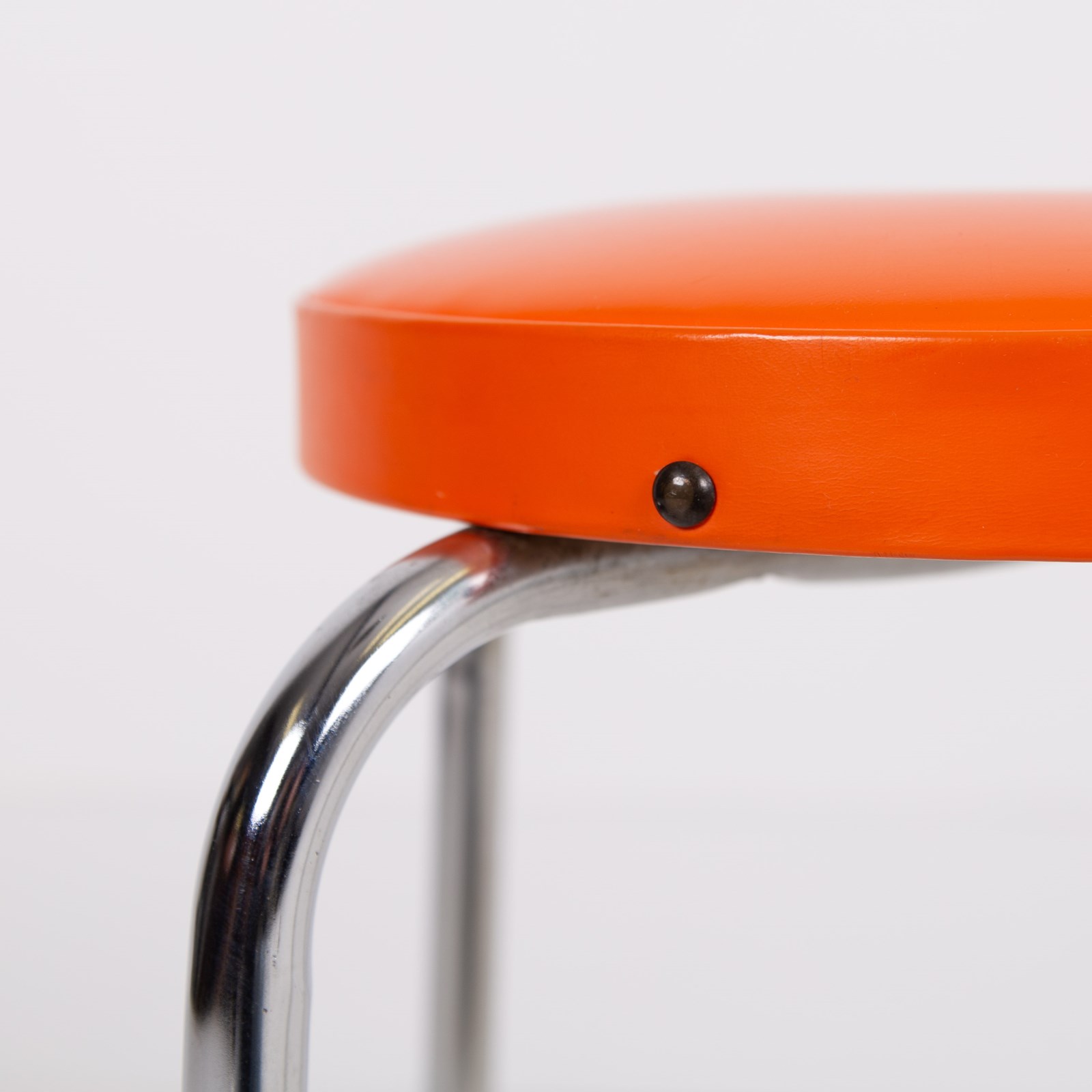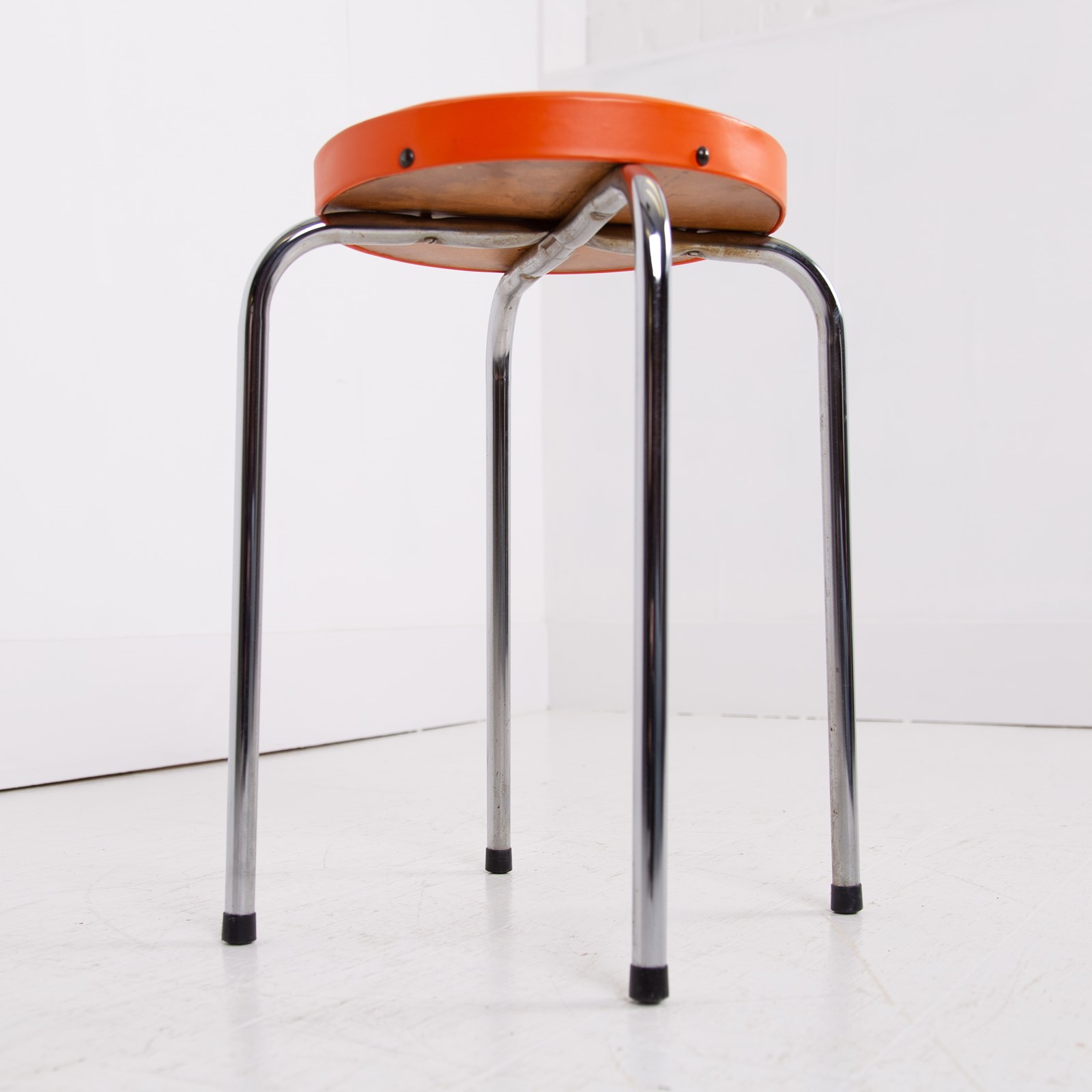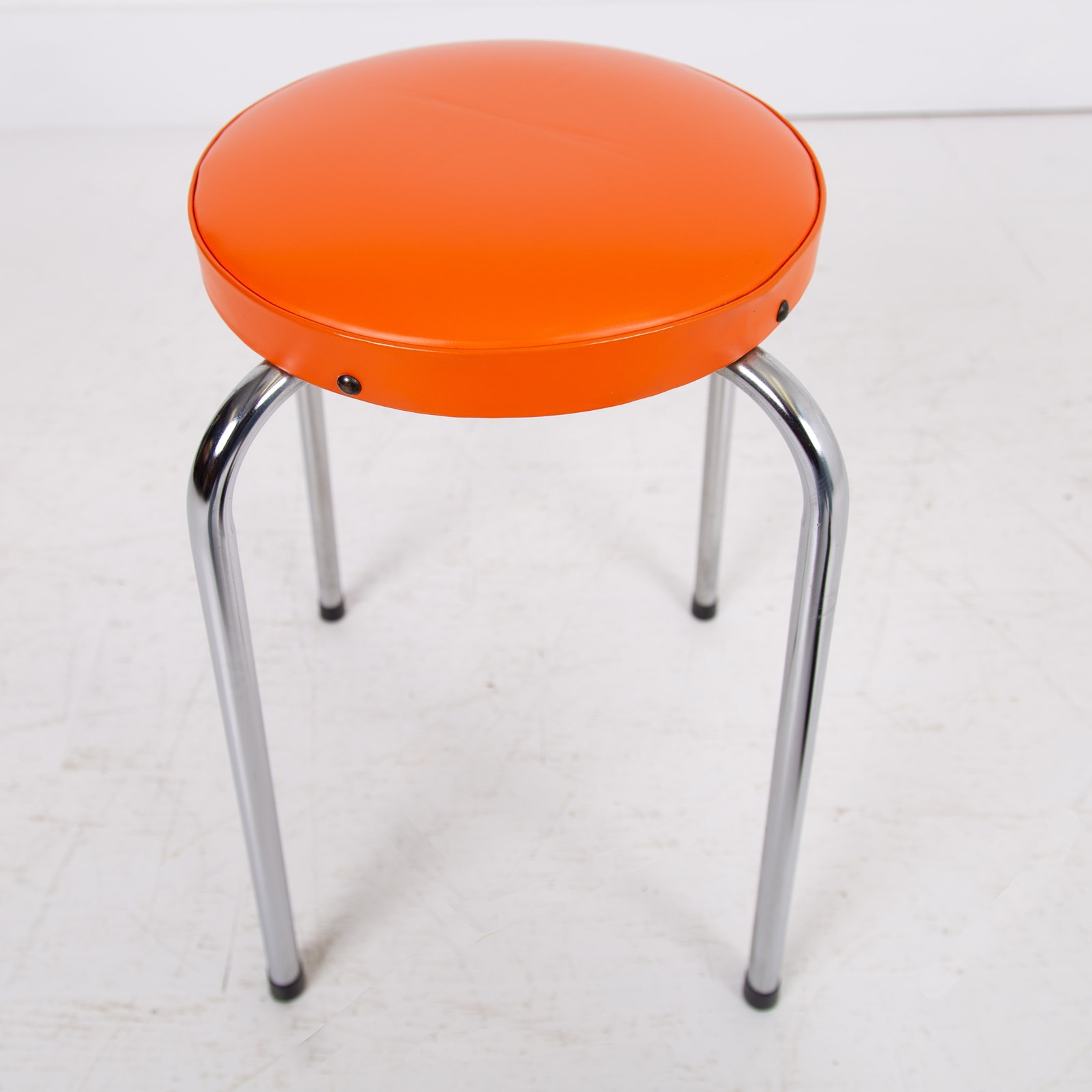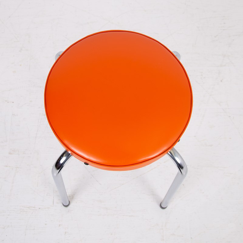 These are in good original order with a little wear to the polished steel legs and orange vinyl tops and are ready to place after a light session in our workshop.