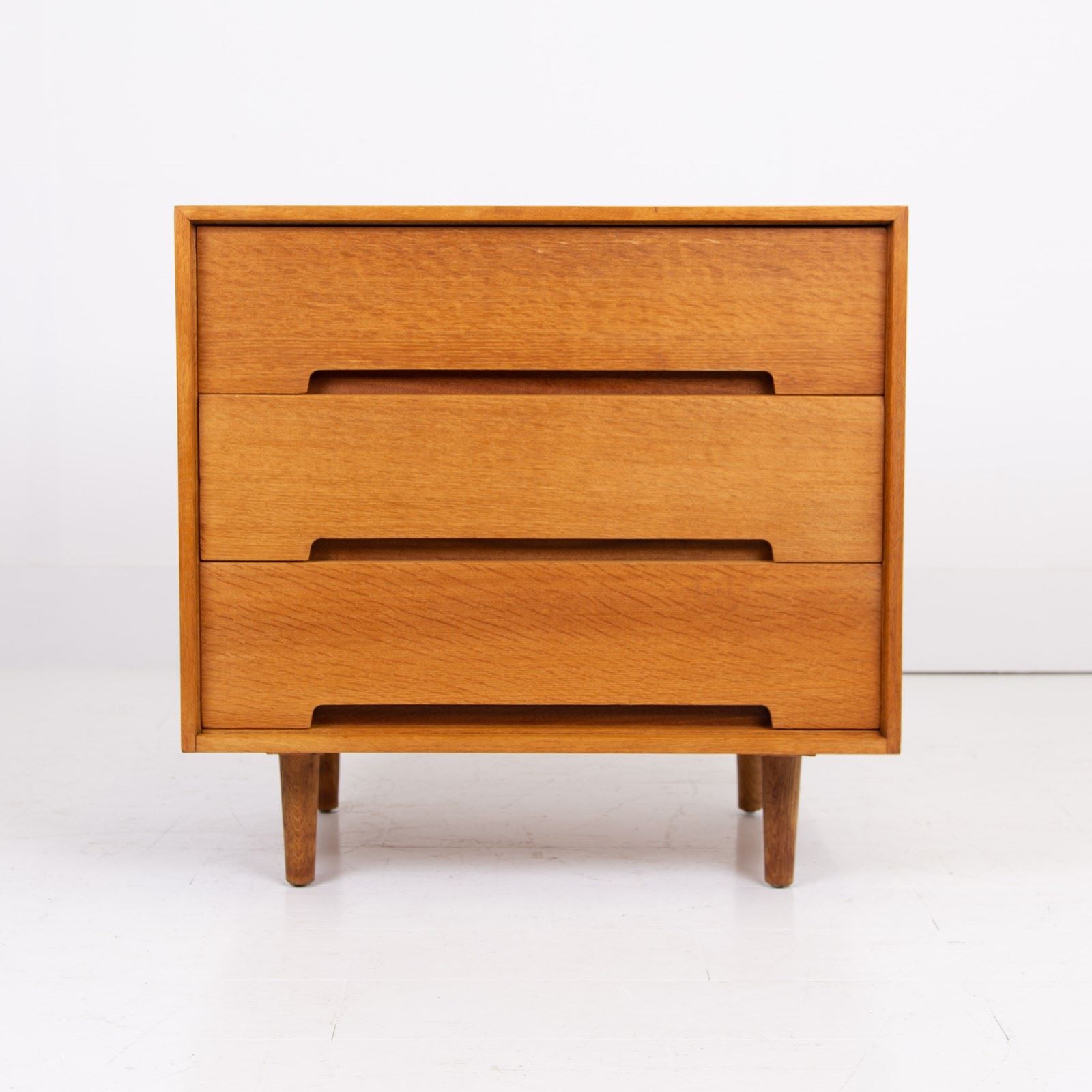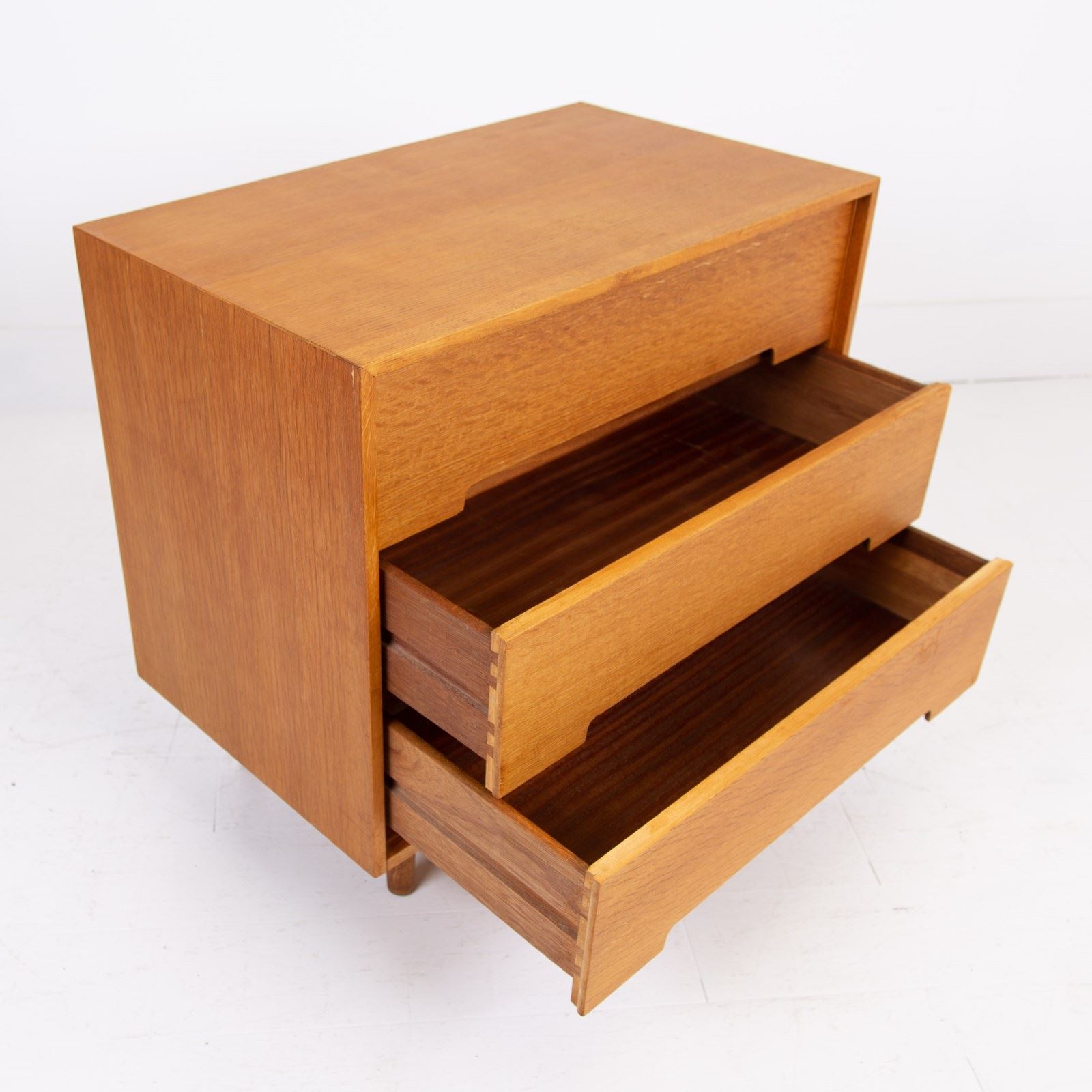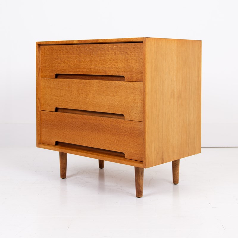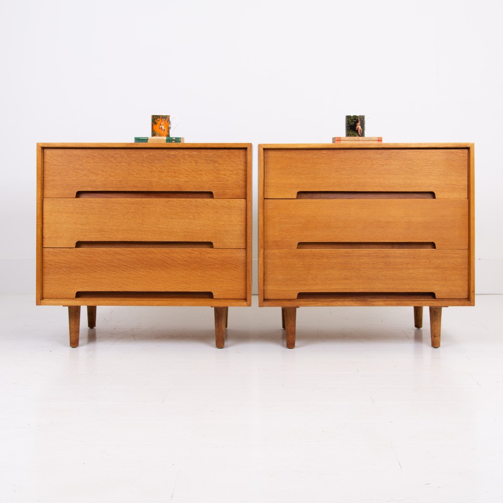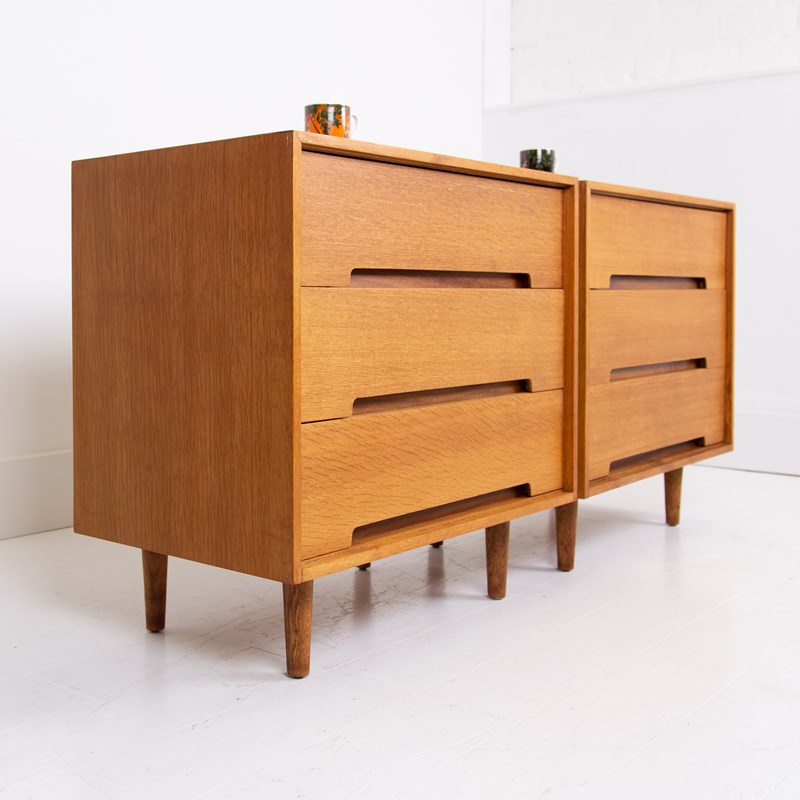 A smart, very nice pair of matching 3 drawer oak chests, 1950's modernist in style designed by architect couple John & Sylvia Reid for Stag Furniture as part of their much sought after 'Cumberland' 'C' range. So pleasing to find a matching pair and these are of sensible proportions.