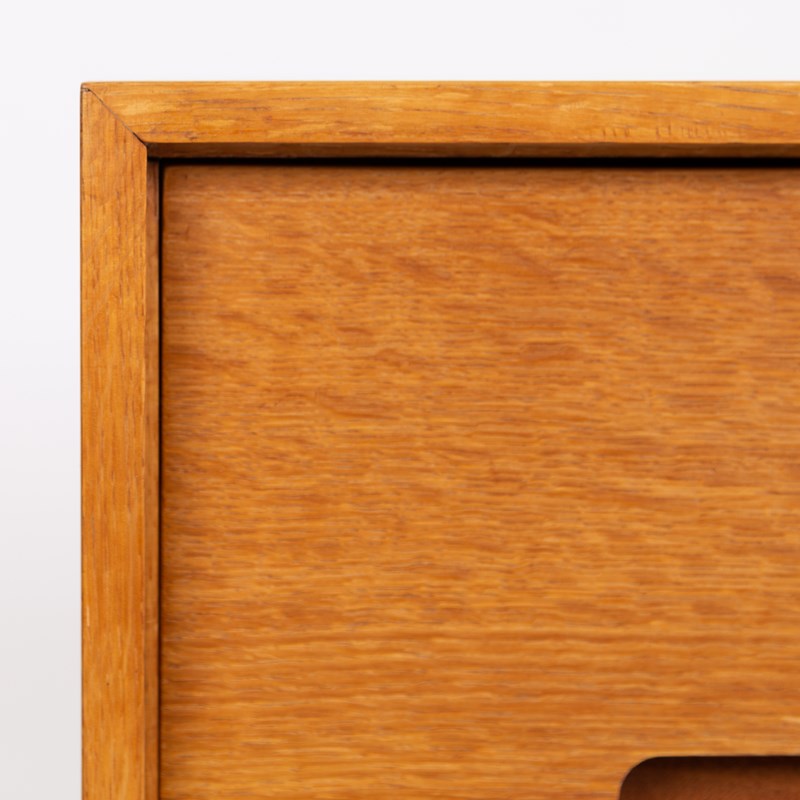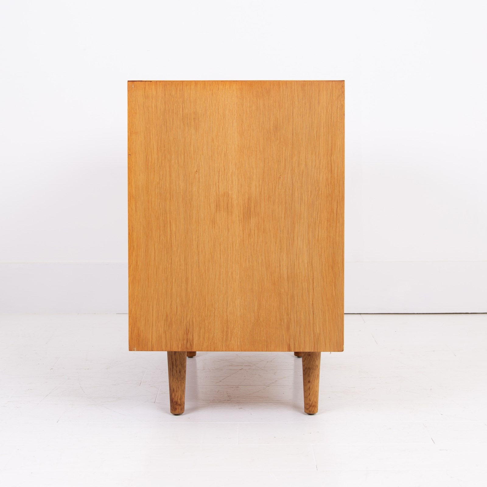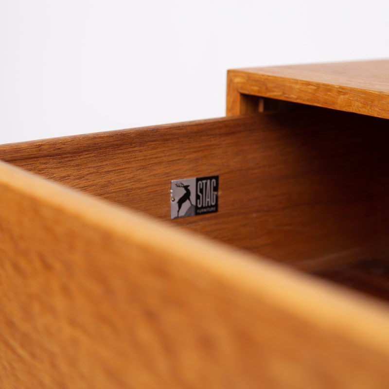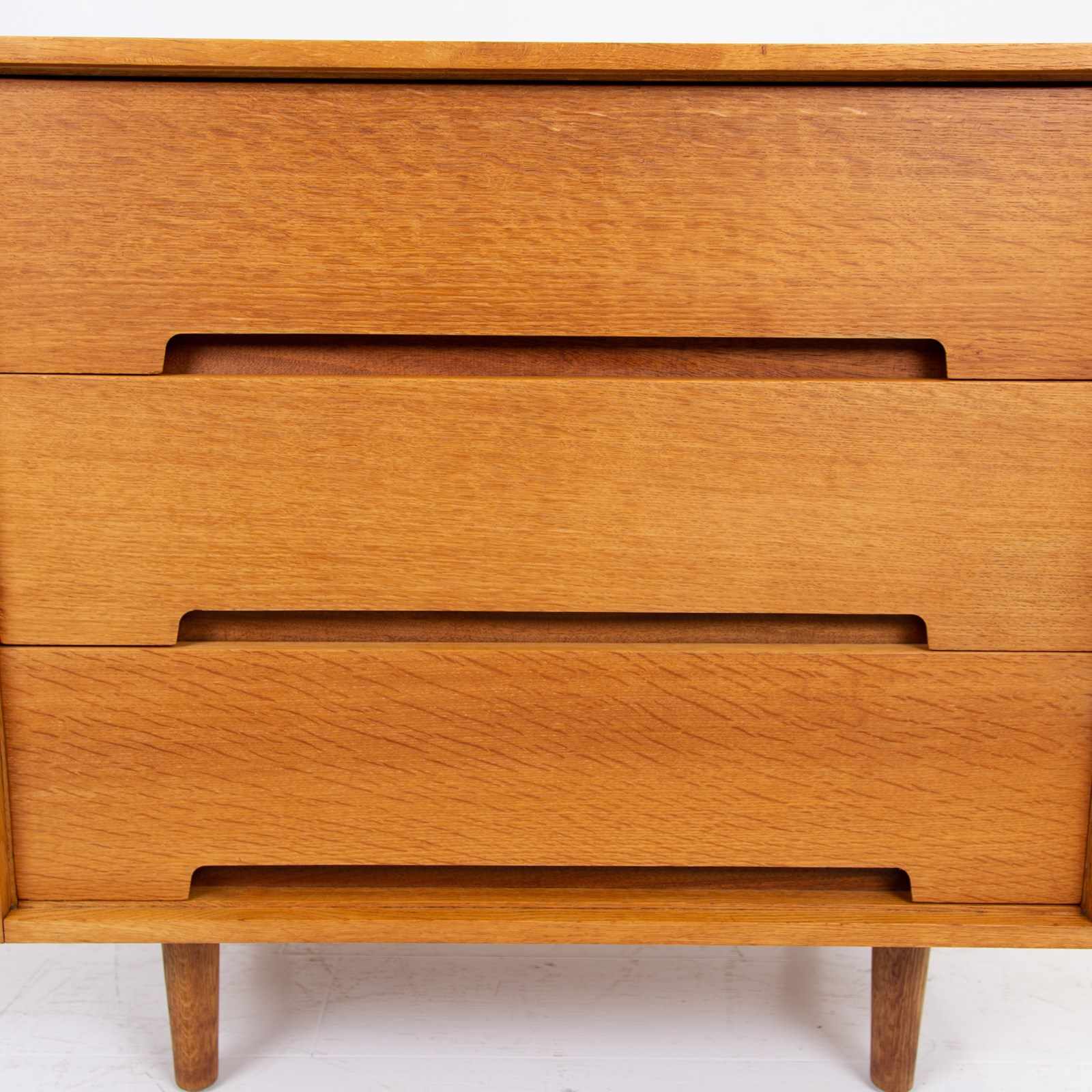 The design incorporates simple neat lines, a lighter tone of oak with a good choice of timber and veneer with the oak legs and cut out long handles to the drawers backed with a line of teak. Both chests are in good order having been carefully re-polished in our workshop. Please expect some marks - but not many and the odd nibble to the lower sides again hardly any. The drawers are clean and we have ensured both are ready to place.